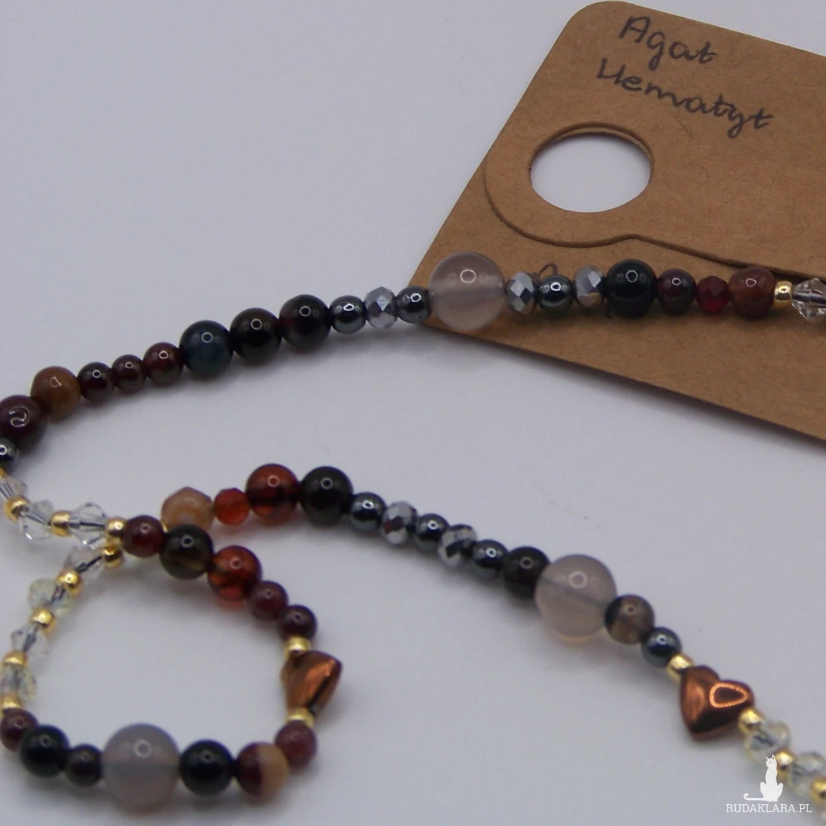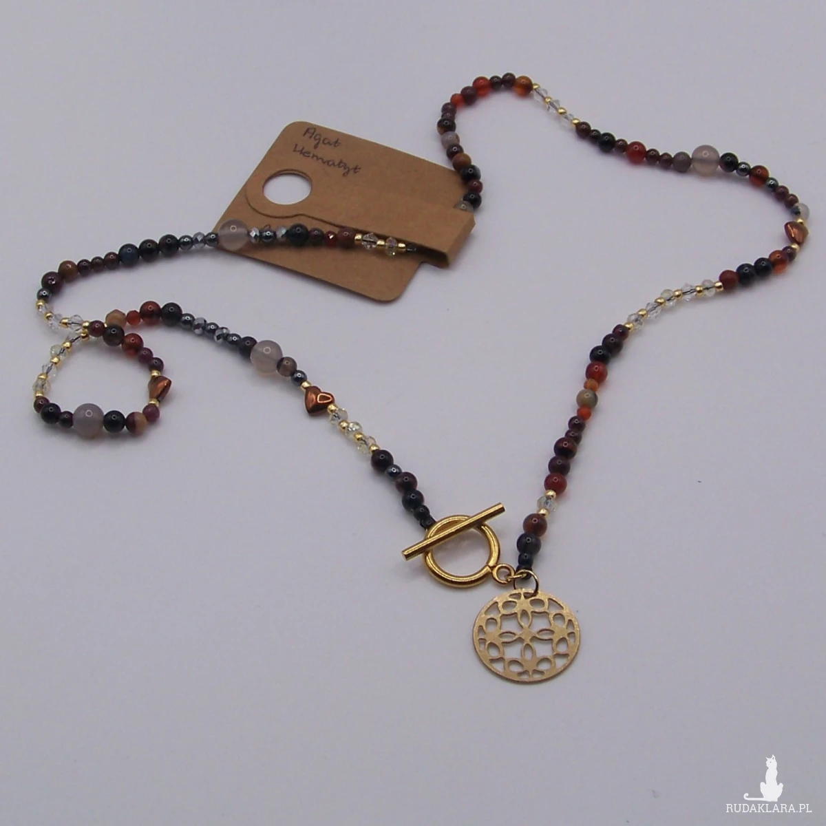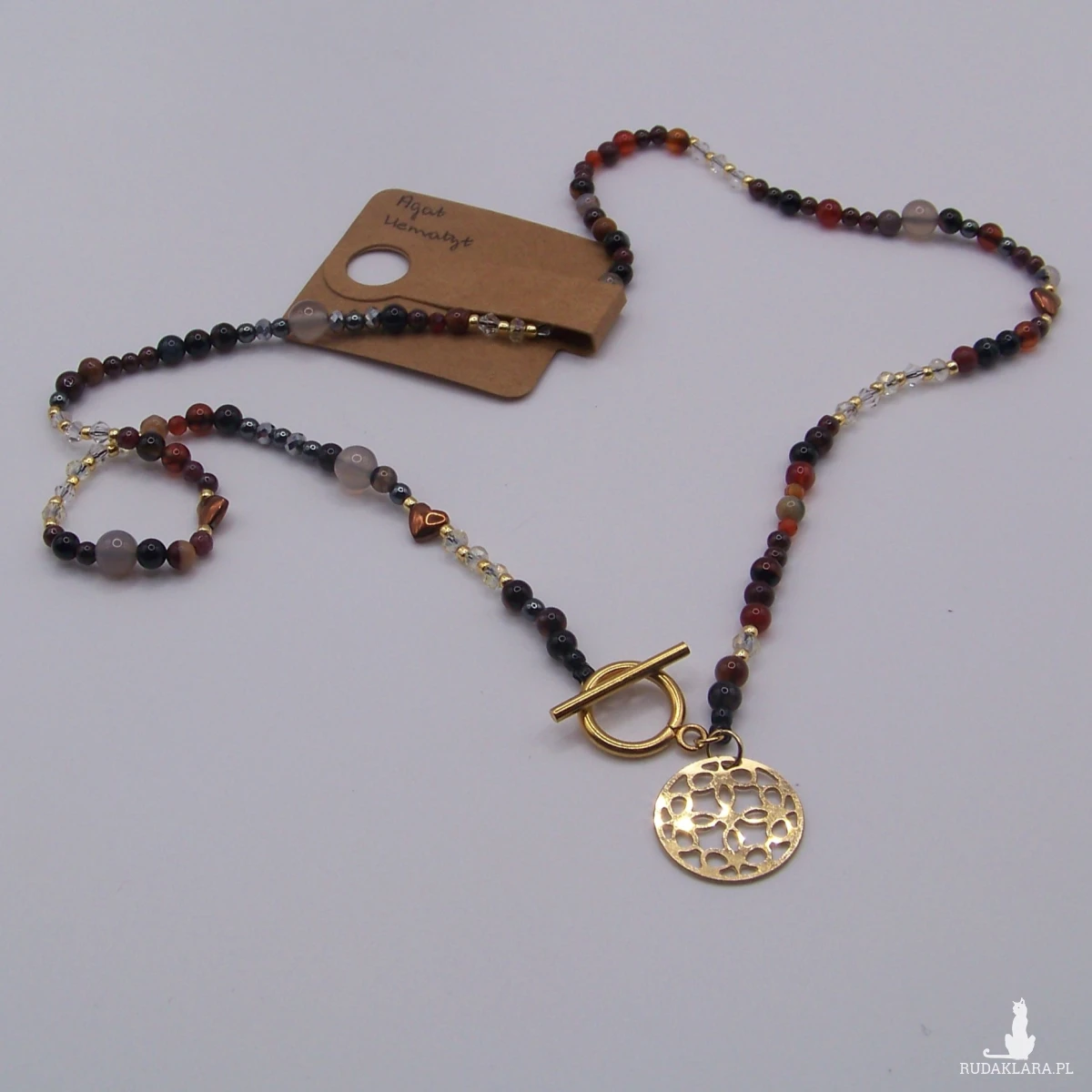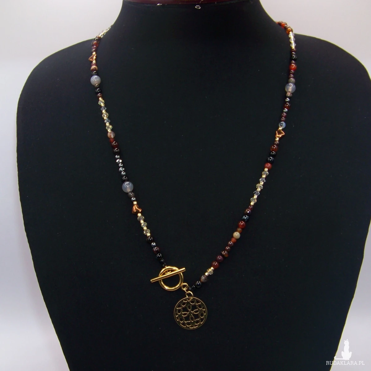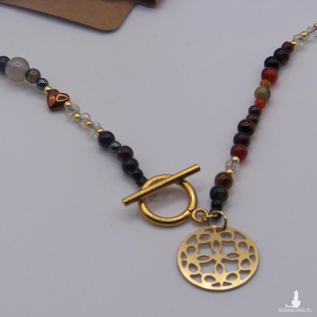 Delikatny naszyjnik zrobiłam z kamieni naturalnych na przemian : agat 4mm i 6mm , hematyt koraliki okrągłe, serduszka , szlifowane kryształki i koraliki toho. Zawieszka stal chirurgiczna .Wszystkie elementy wykończeniowe ze stali chirurgicznej w kolorze złotym . Długość 50 cm