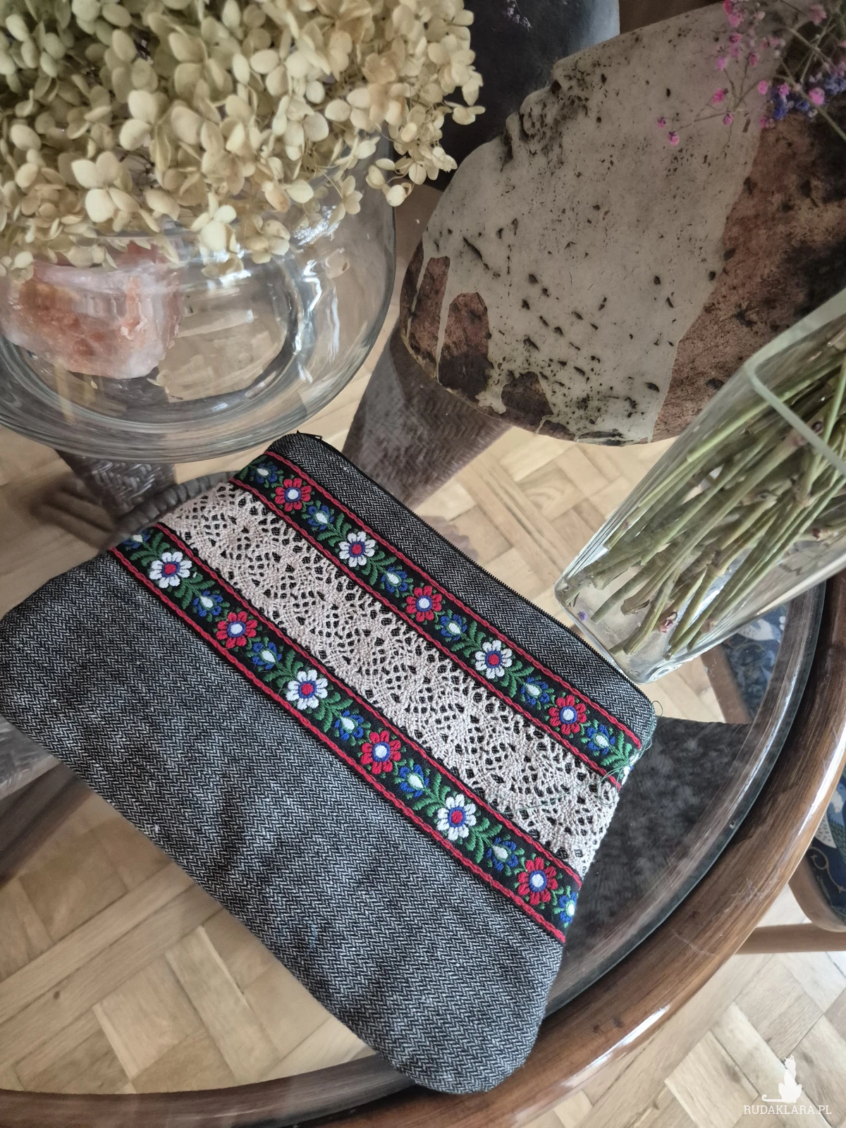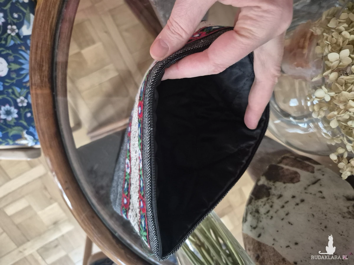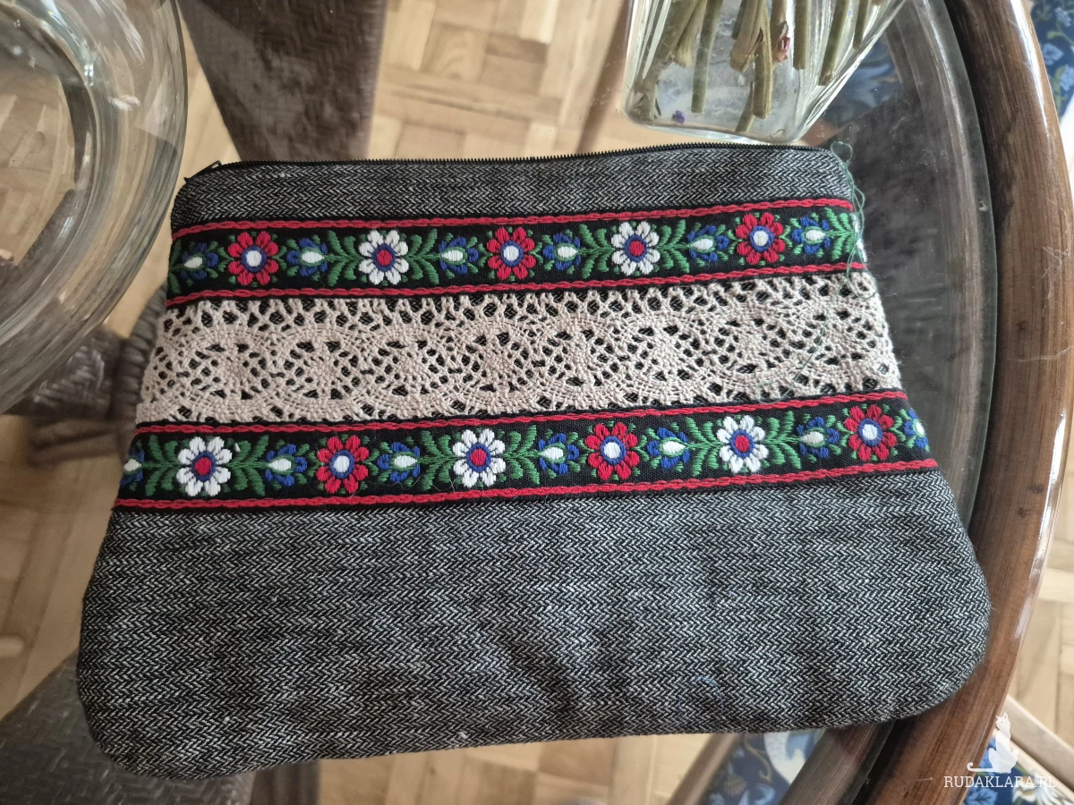 szara ludowa kosmetyczka z koronką- wymiary 24cm na 18cm, zapinana na zamek, na pikowanej podszewce, cudo-polecam -uwaga poezja-nie rozładowałes sytuacji idioto, metody wychowawcze wrzuciłeś w błoto!box x1