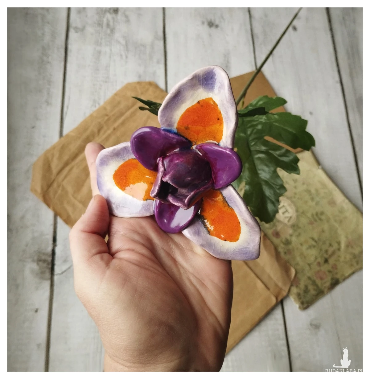 Ceramiczny irys, wykonany z gliny szamotowej wypalony na biskwit, a następnie szkliwiony w temp. 1260 stopni C. Przymocowany do gałązki. Wymiary ok 5 x 10 cm i ok 50 cm na długość. Serdecznie polecam do ozdoby domu lub jako upominek okazjonalny!