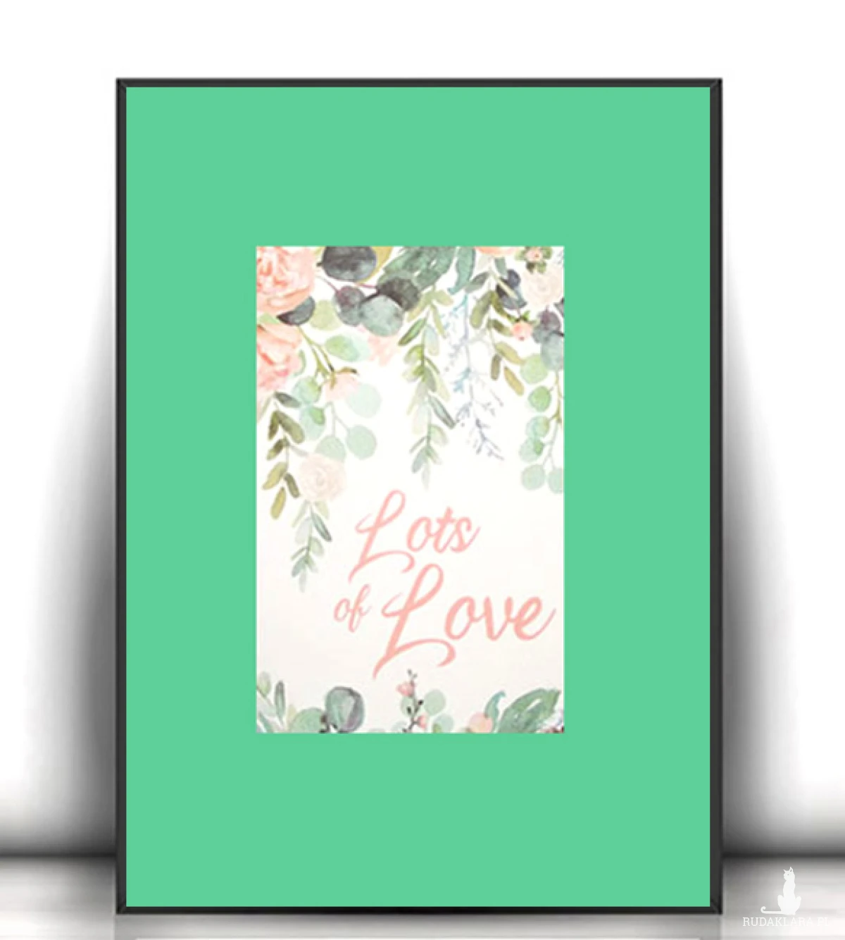 Kolorowy obrazek na zielonym kartoniku A4. Plakat z napisem "Lots of love" (dużo miłości). Dekoracja na ścianę do pokoju do sypialni, jadalni, salonu, przedpokoju, garderoby, kuchni, pokoju dziewczynki lub nastolatki, holu itp. Plakat wystarczy dać do ramki 21x30 cm.. Poster będzie pasował do wnętrz urządzonych w stylu boho, nowoczesnym, skandynawskim, mieszanym.