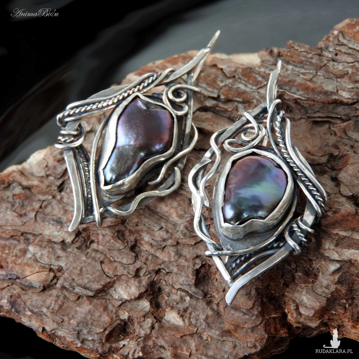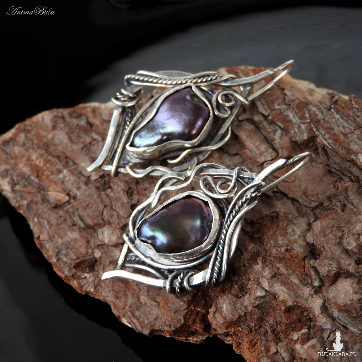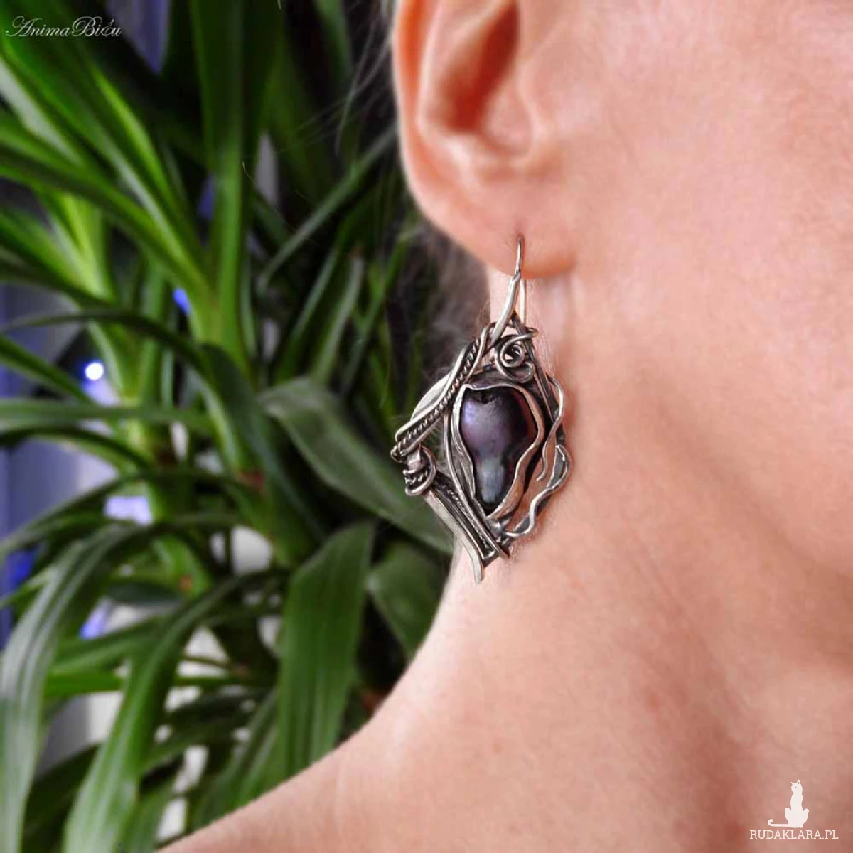 Kolczyki srebrne z barokową czarną perłą. Wykonane od