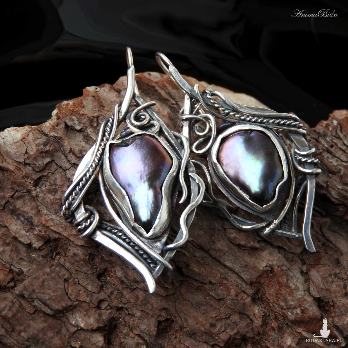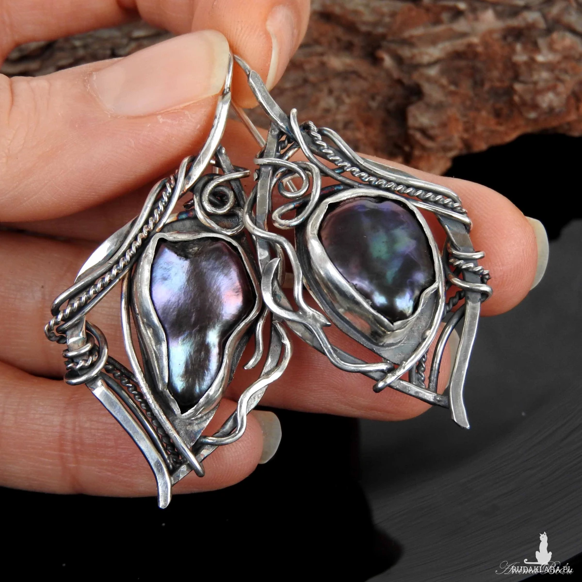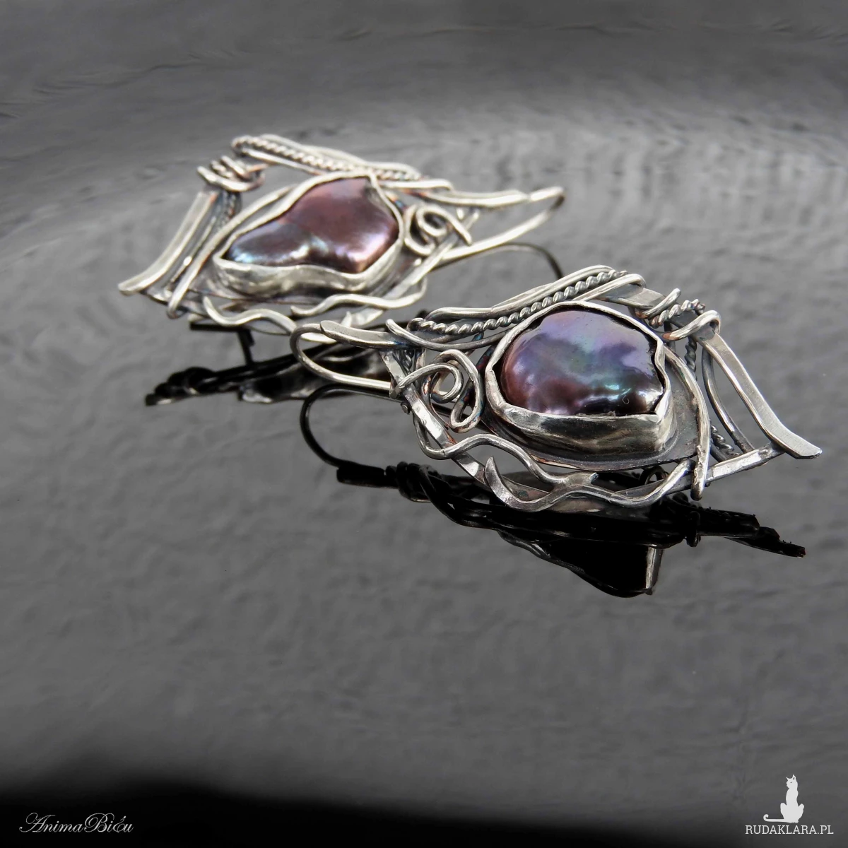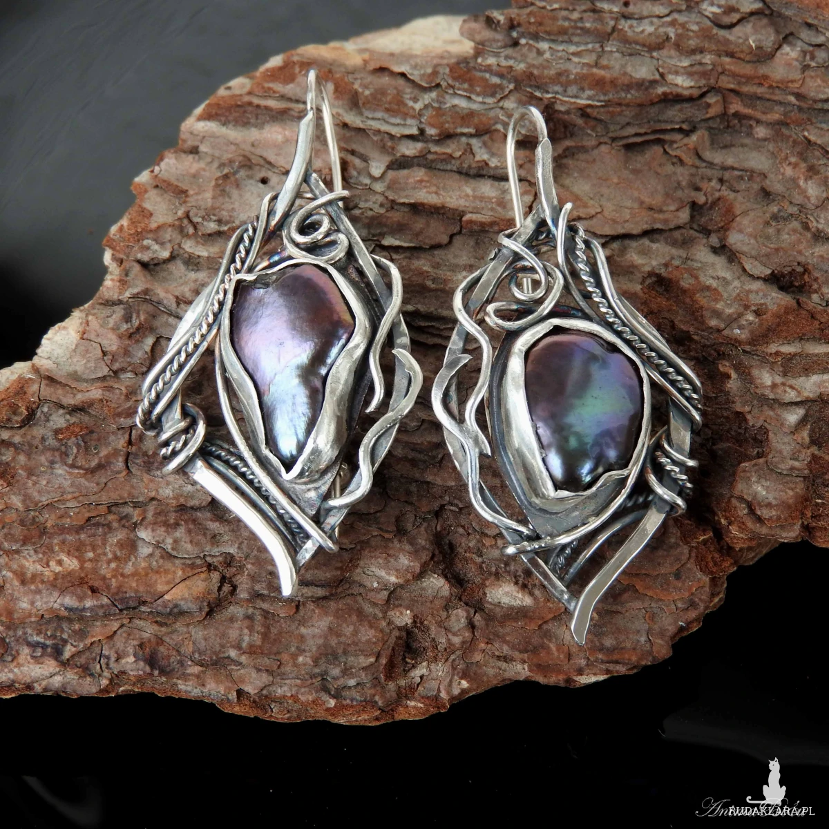 Kolczyki srebrne z barokową czarną perłą. Wykonane od