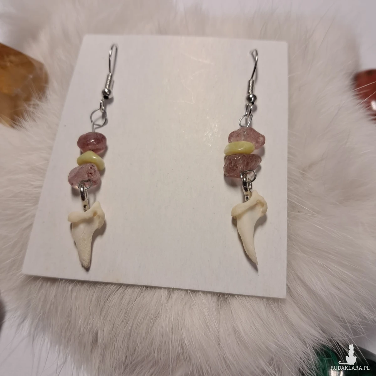 Te unikatowe kolczyki łączą w sobie surowość natury z delikatną energią kamieni szlachetnych. Głównym elementem są autentyczne pazury lisa, symbolizujące spryt, intuicję i wewnętrzną siłę. Ich subtelna, kremowa barwa doskonale komponuje się z pozostałymi minerałami, dodając biżuterii naturalnego, pierwotnego charakteru.