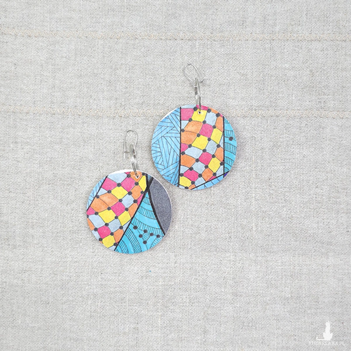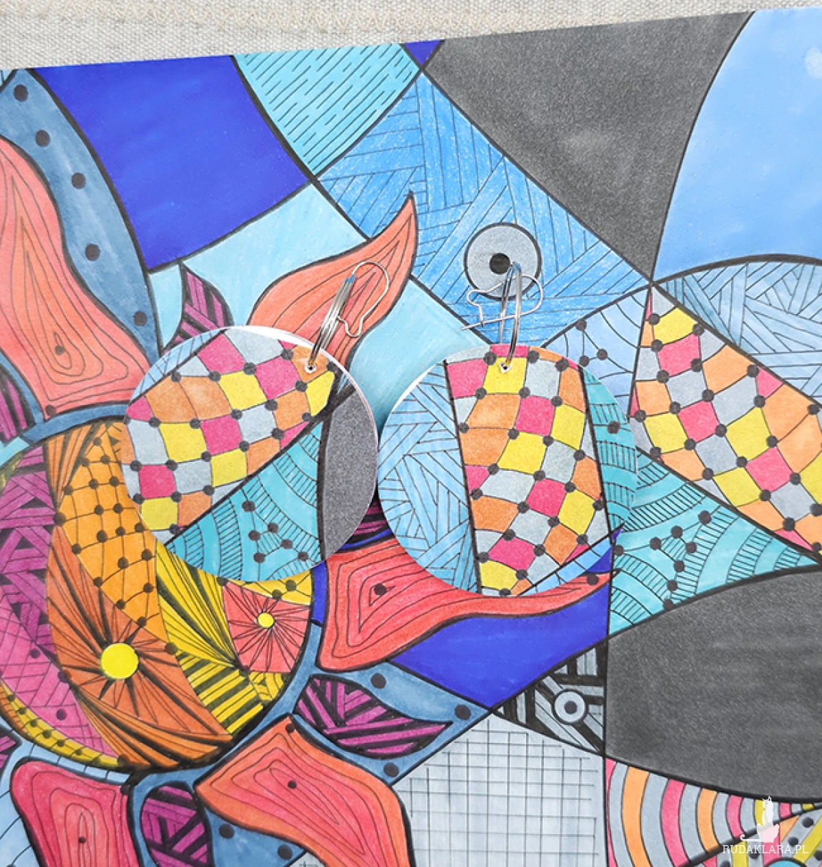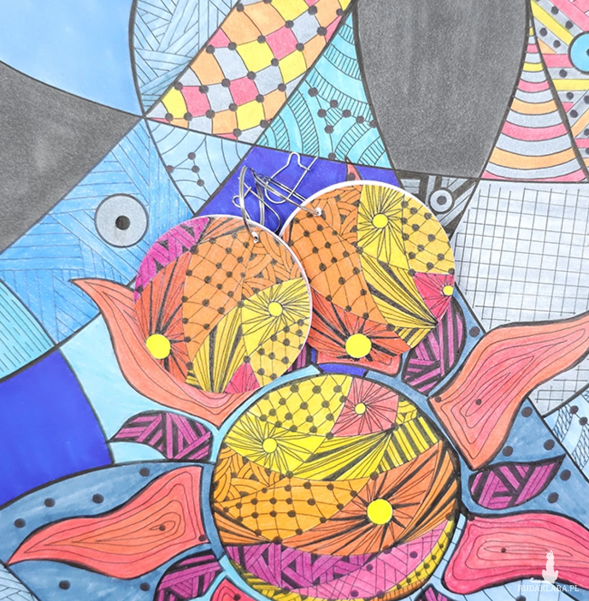 Kolczyki wykonane z drewnianej bazy oraz części mojego autorskiego rysunku "Upał".