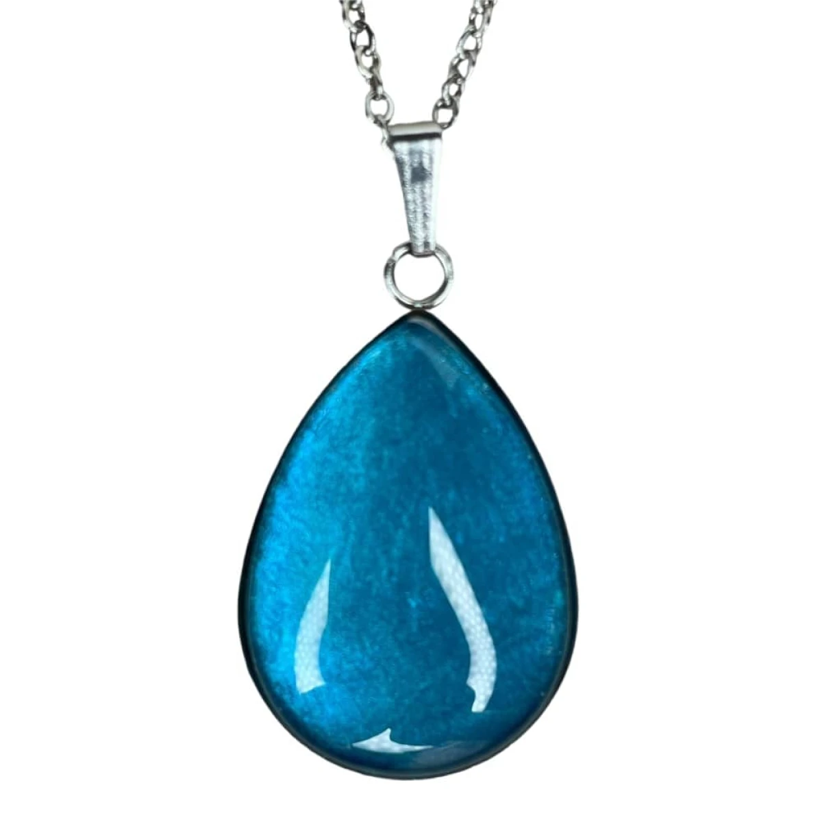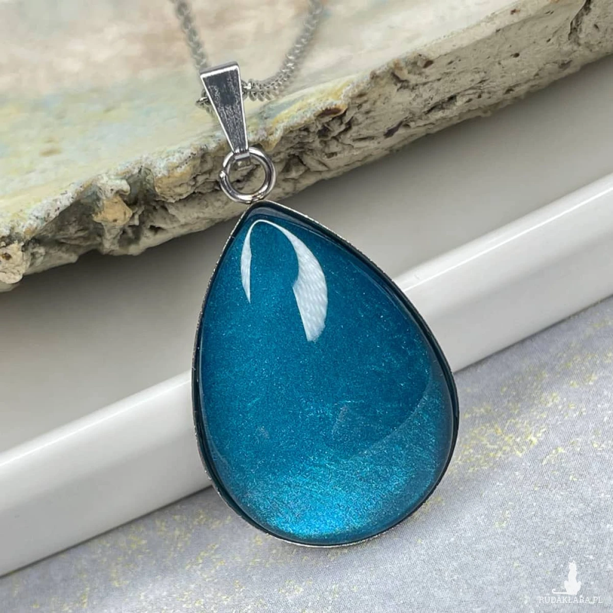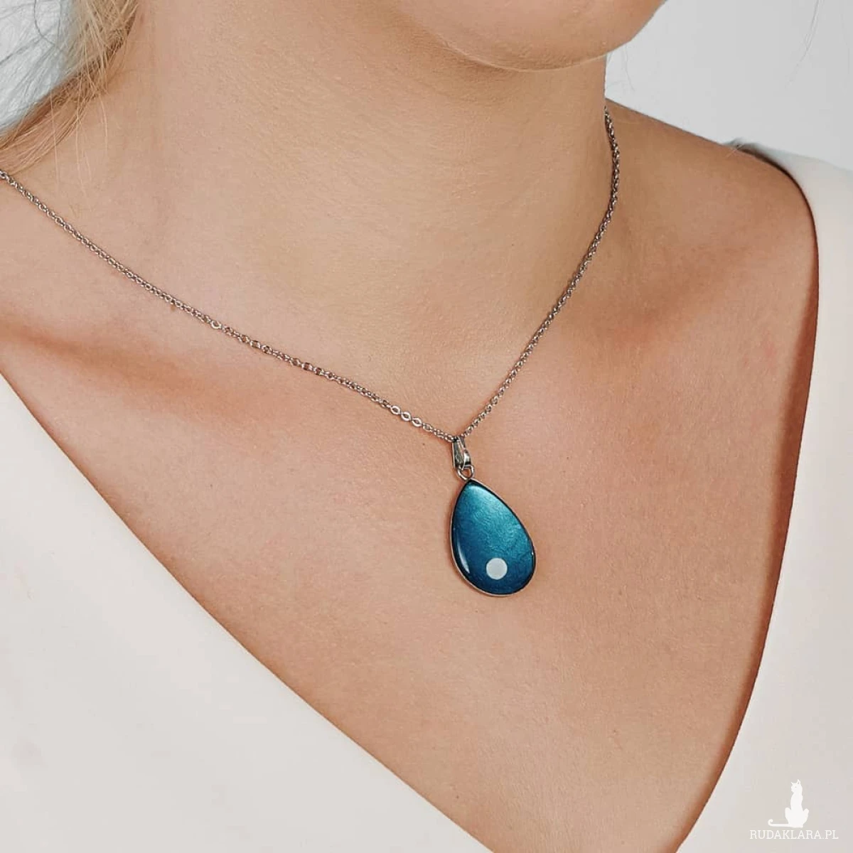 Ten wisior jest częścią kolekcji “W blasku perłowego księżyca”. Wisior wykonany jest z ręcznie malowanego kaboszonu umieszczonego w bazie ze stali szlachetnej. Szklany element zachwyca subtelnym, opalizującym blaskiem, który jest niczym odbicie księżyca na tafli wody. Wisior mieni się w świetle, dodając elegancji każdej stylizacji. Na życzenie możemy dodać dodatkowy element jak w kolczykach kupionych do kompletu – wspomnij o tym w uwagach do zamówienia.