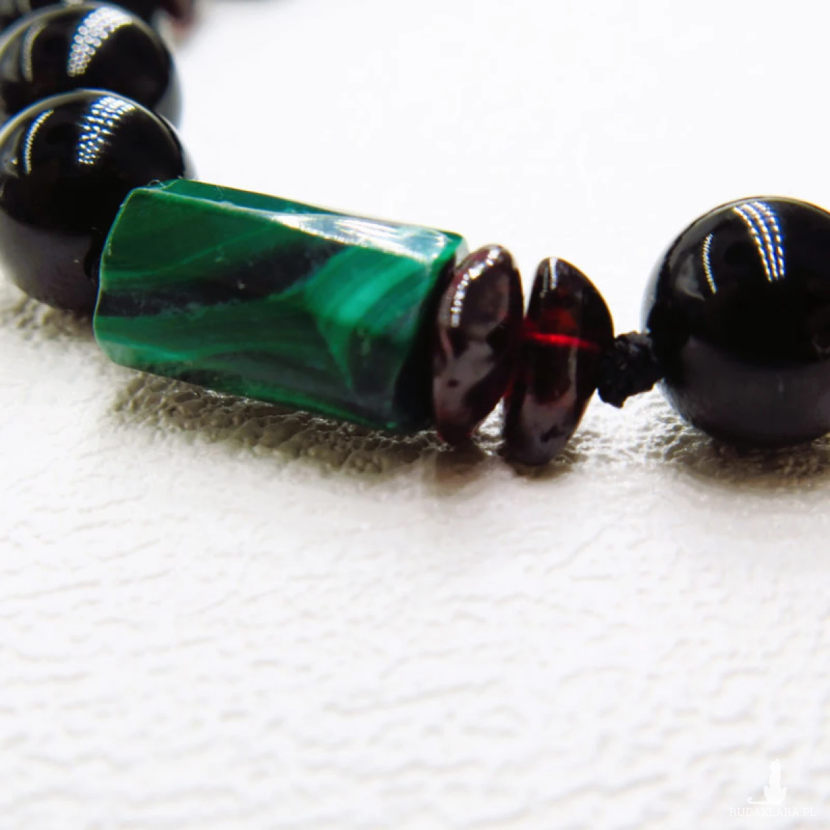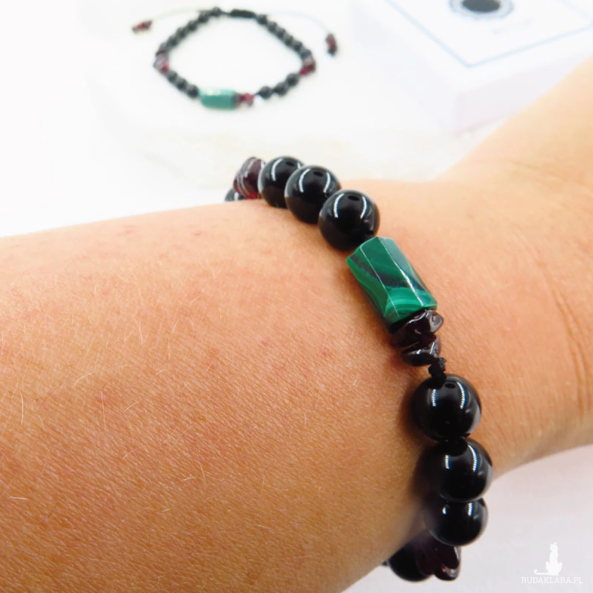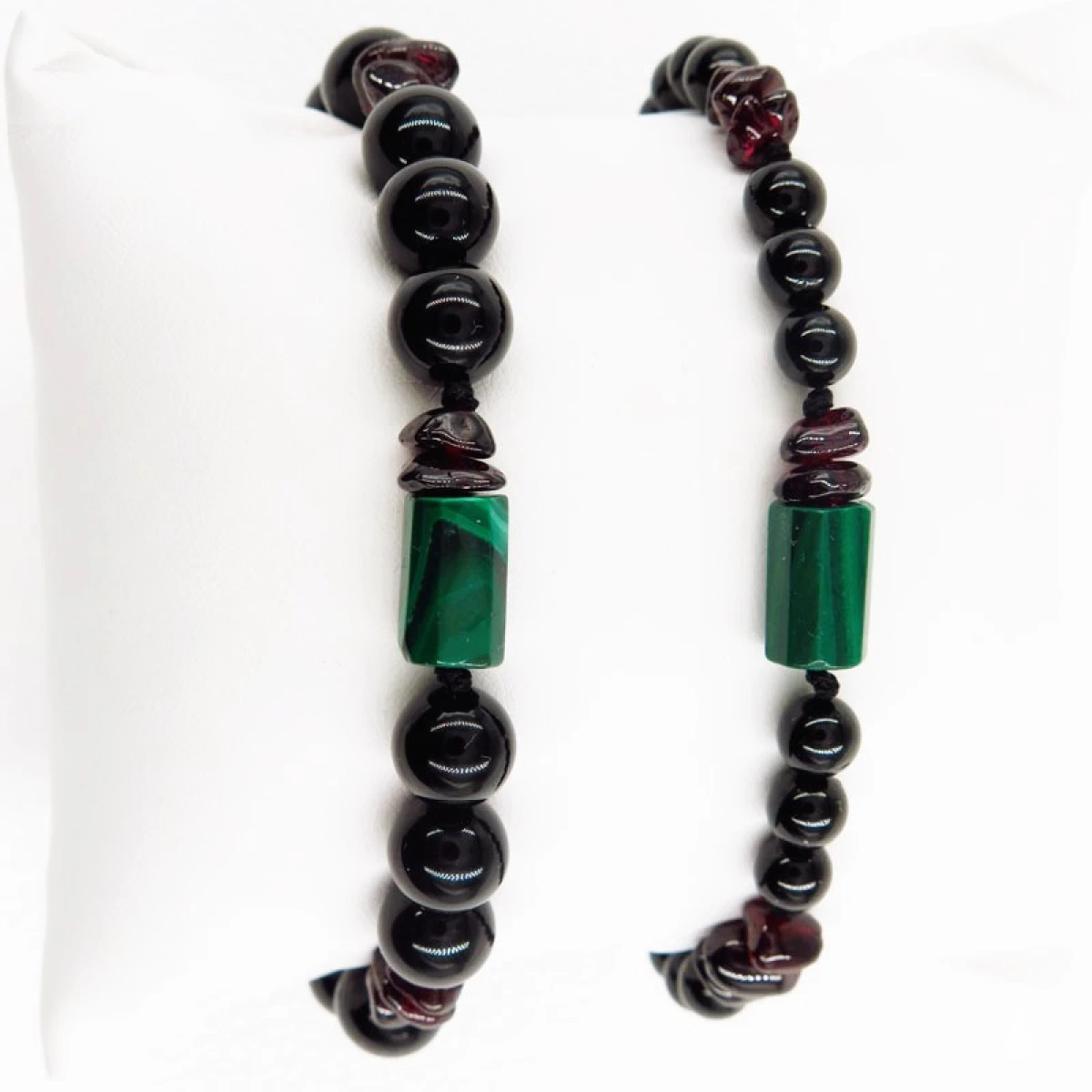 Bransoletki dla pary z naturalnych kamieni to wyjątkowy talizman miłości i ochrony. Wykonane z czarnego turmalinu, zielonego malachitu i bordowego granatu – kamieni o silnym energetycznym znaczeniu – wzmacniają więź, chronią relację i dodają pasji. Dzięki regulowanemu sznurkowi jubilerskiemu idealnie dopasowują się do nadgarstka, a różnica w rozmiarze kamieni podkreśla subtelne dopełnienie się energii kobiecej i męskiej.