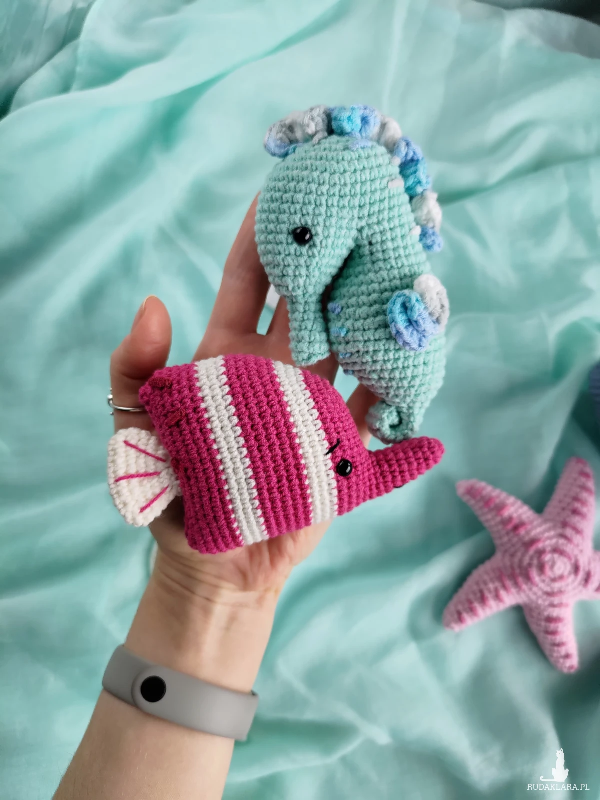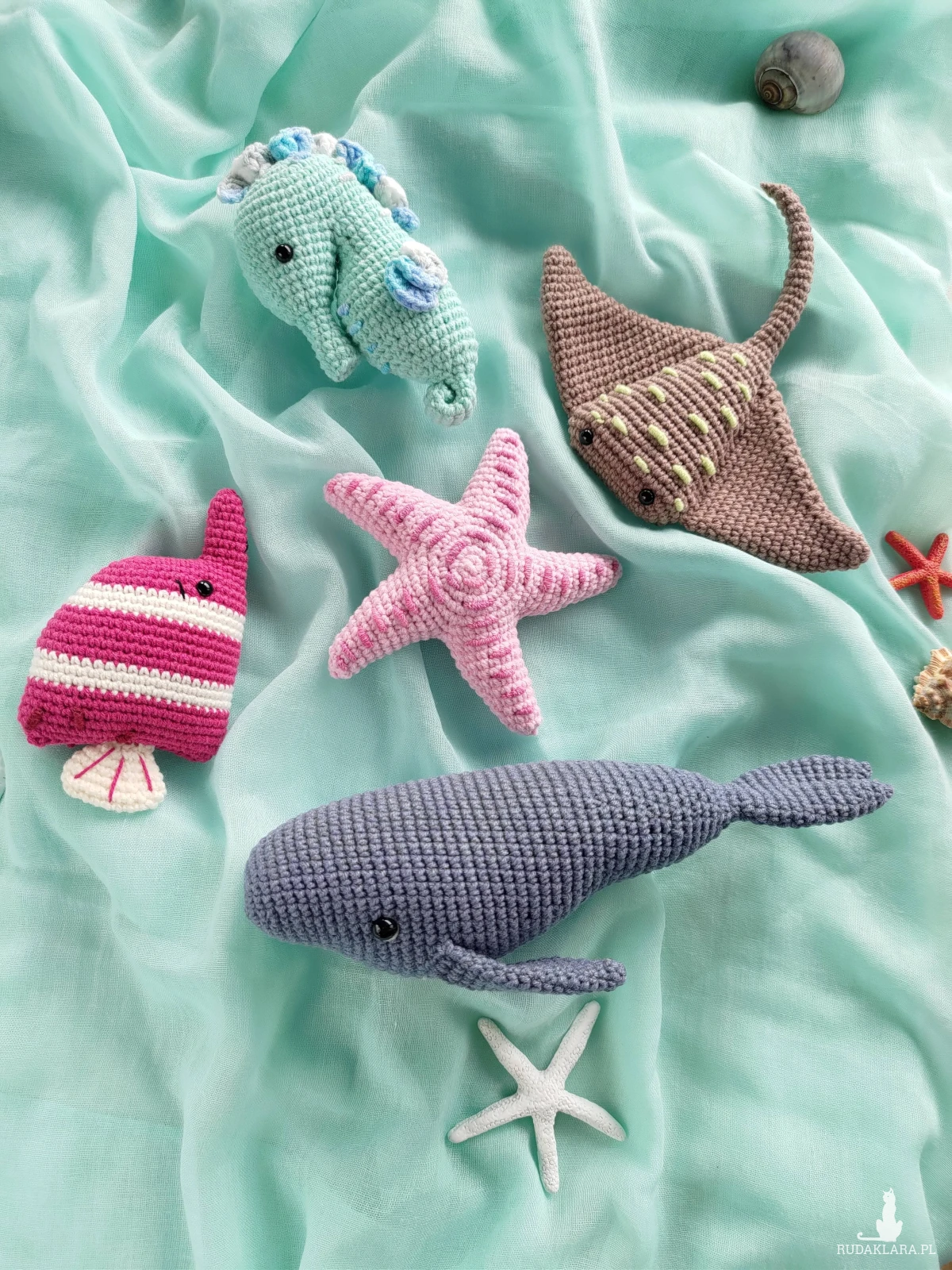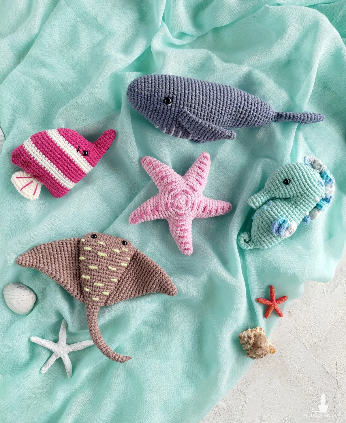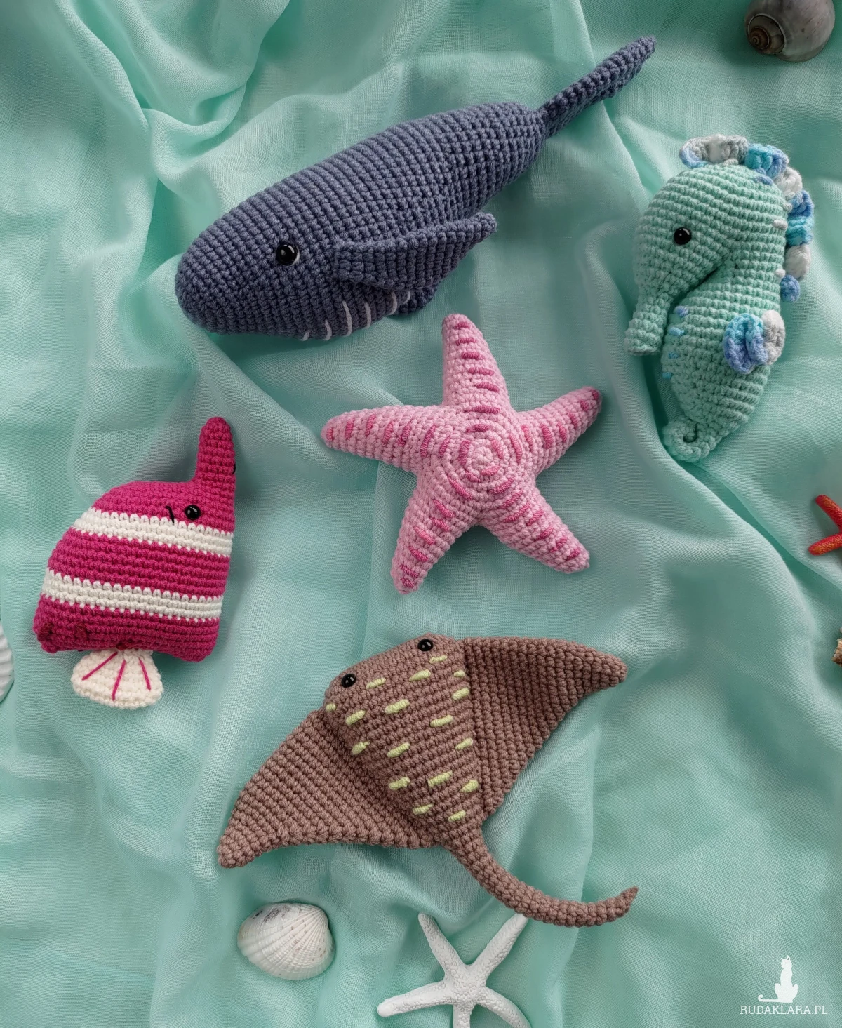 Morskie zwierzęta nie są zbyt małe, co sprawia, że są bardziej zauważalne i mniej prawdopodobne, że zgubią się w dziecięcym pokoju. Zwierzęta wykonane są z wysokiej jakości włóczki półbawełnianej (55% bawełny, 45% akrylu).