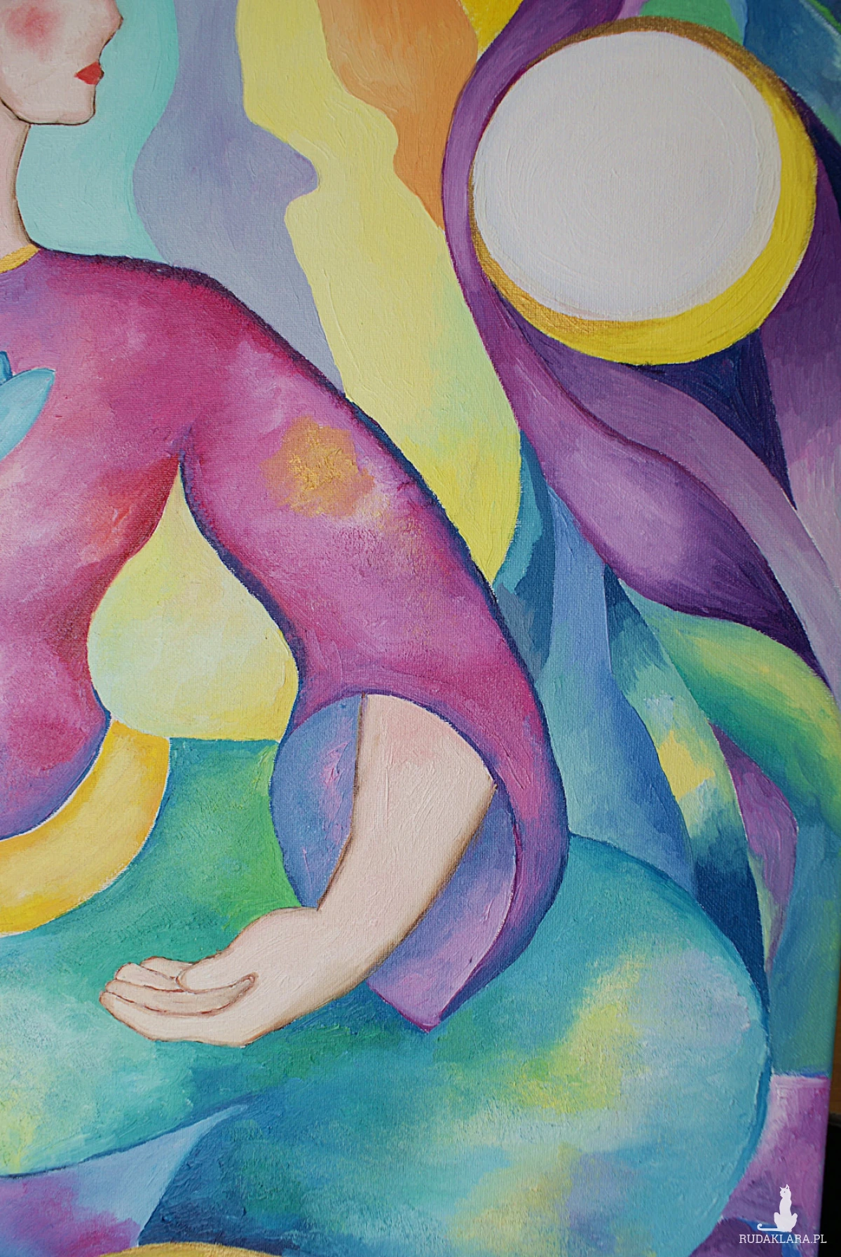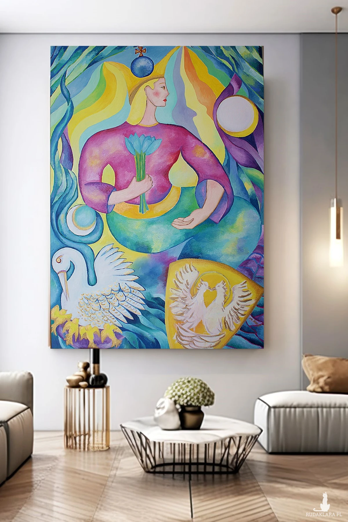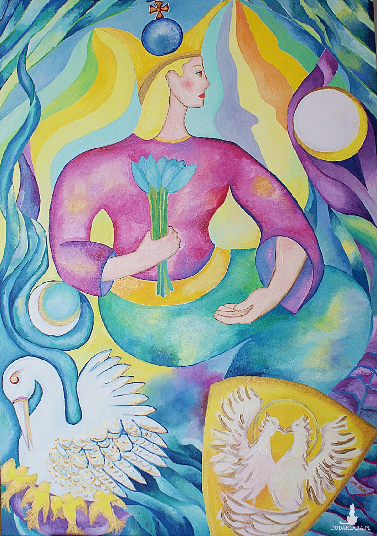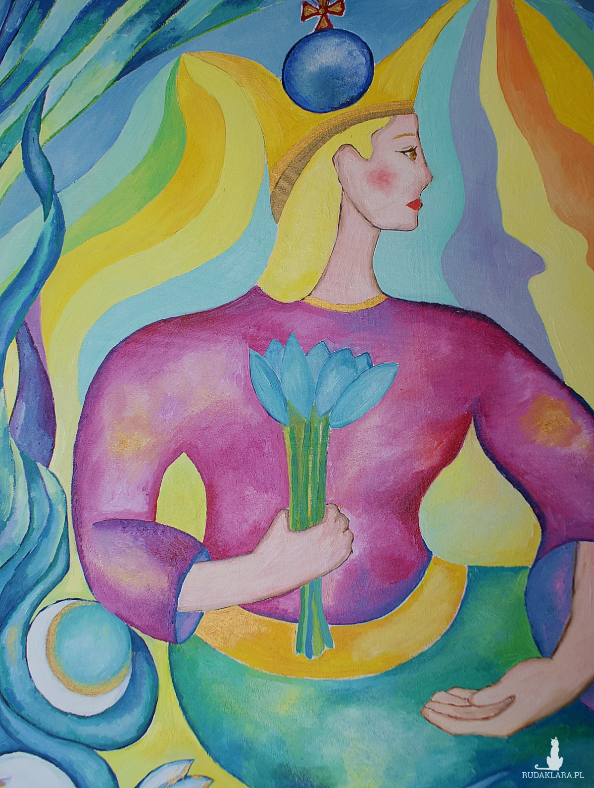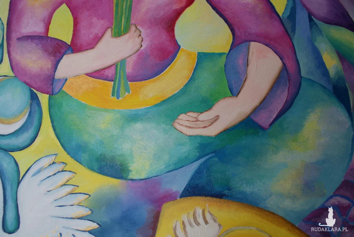 Obraz tętni życiem i feerią barw, które przyciągają wzrok i nie pozwalają się oderwać. Postać centralna, ubrana w przyciągającą uwagę fioletową szatę, trzyma w dłoni bukiet niebieskich kwiatów. Jej twarz jest zwrócona w bok, a na głowie spoczywa złoty diadem. Tło eksploduje kolorami: od odcieni zieleni, przez ciepłe żółcie, aż po głębokie błękity. U dołu obrazu widnieje biały ptak z rozpostartymi skrzydłami, symbolizujący wolność i lekkość, obfitość życia. Całość kompozycji jest dynamiczna, pełna ruchu i energii.