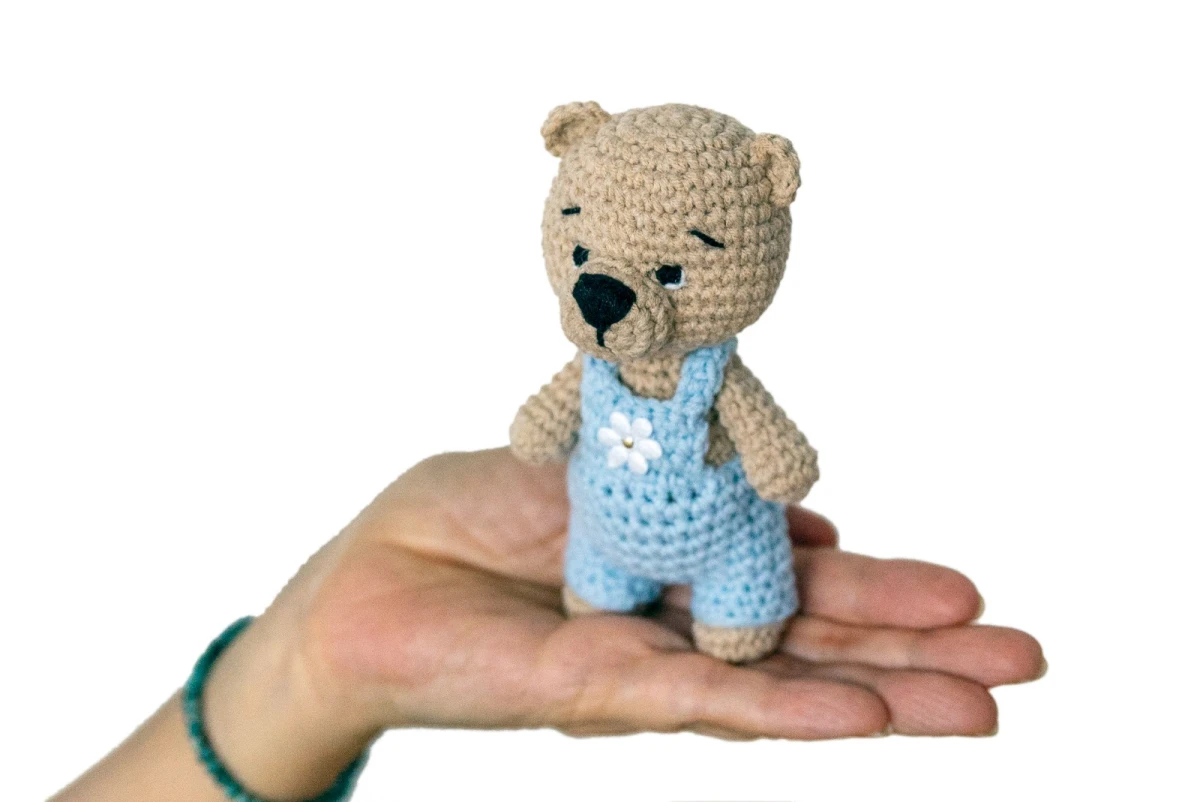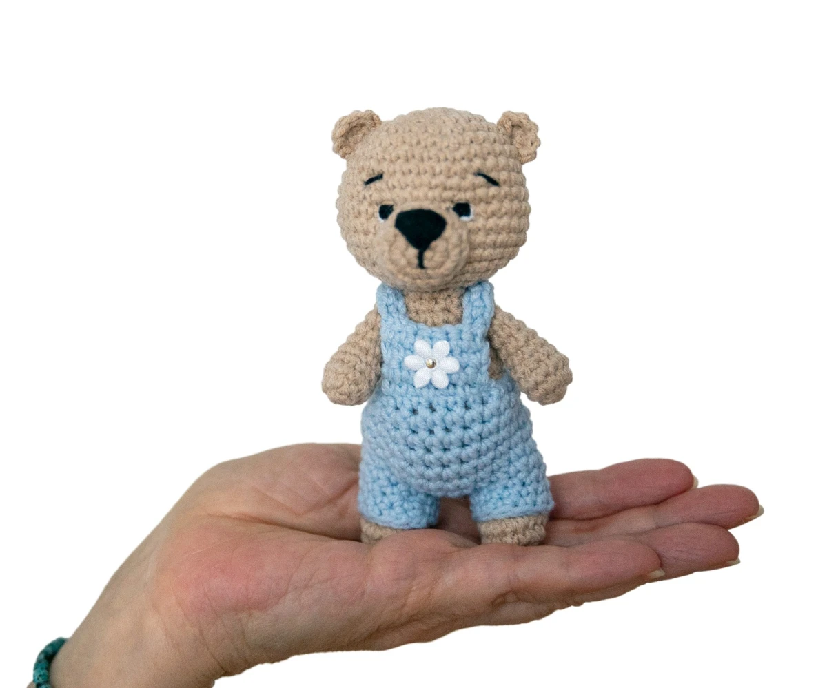 Miś w całości jest wykonany ręcznie za pomocą szydełka. Oczka i nosek wyhaftowane również ręcznie. Bez plastikowych elementów.