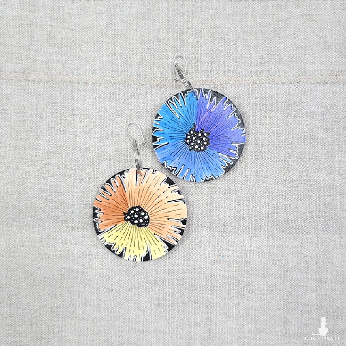 Ręcznie malowane (rysowane) kolczyki. Baza drewniana plus satynowy papier.