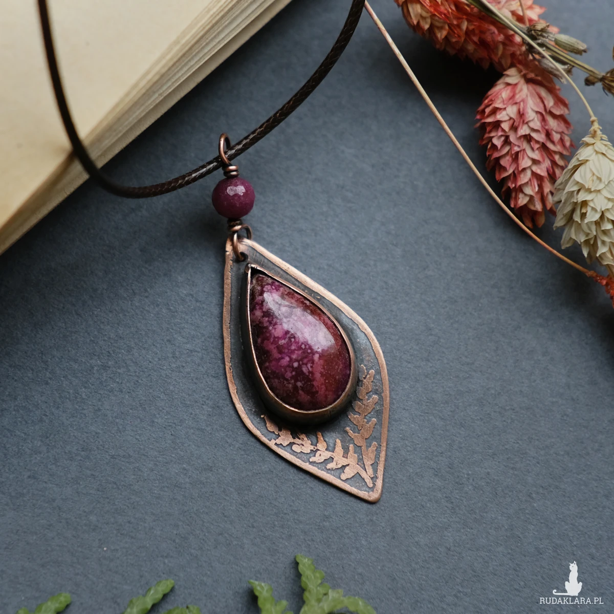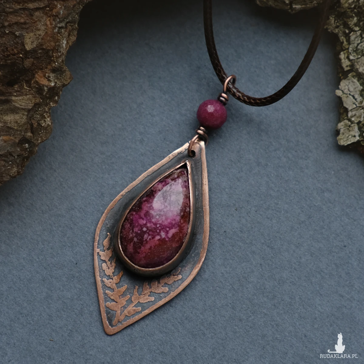 Ręcznie stworzony wisiorek mieści w sobie piękny kamień kalcytu kobaltowego, któremu towarzyszy koralik rubinu. Wisiorek ozdobiony jest delikatnym rysunkiem z roślinnym motywem.