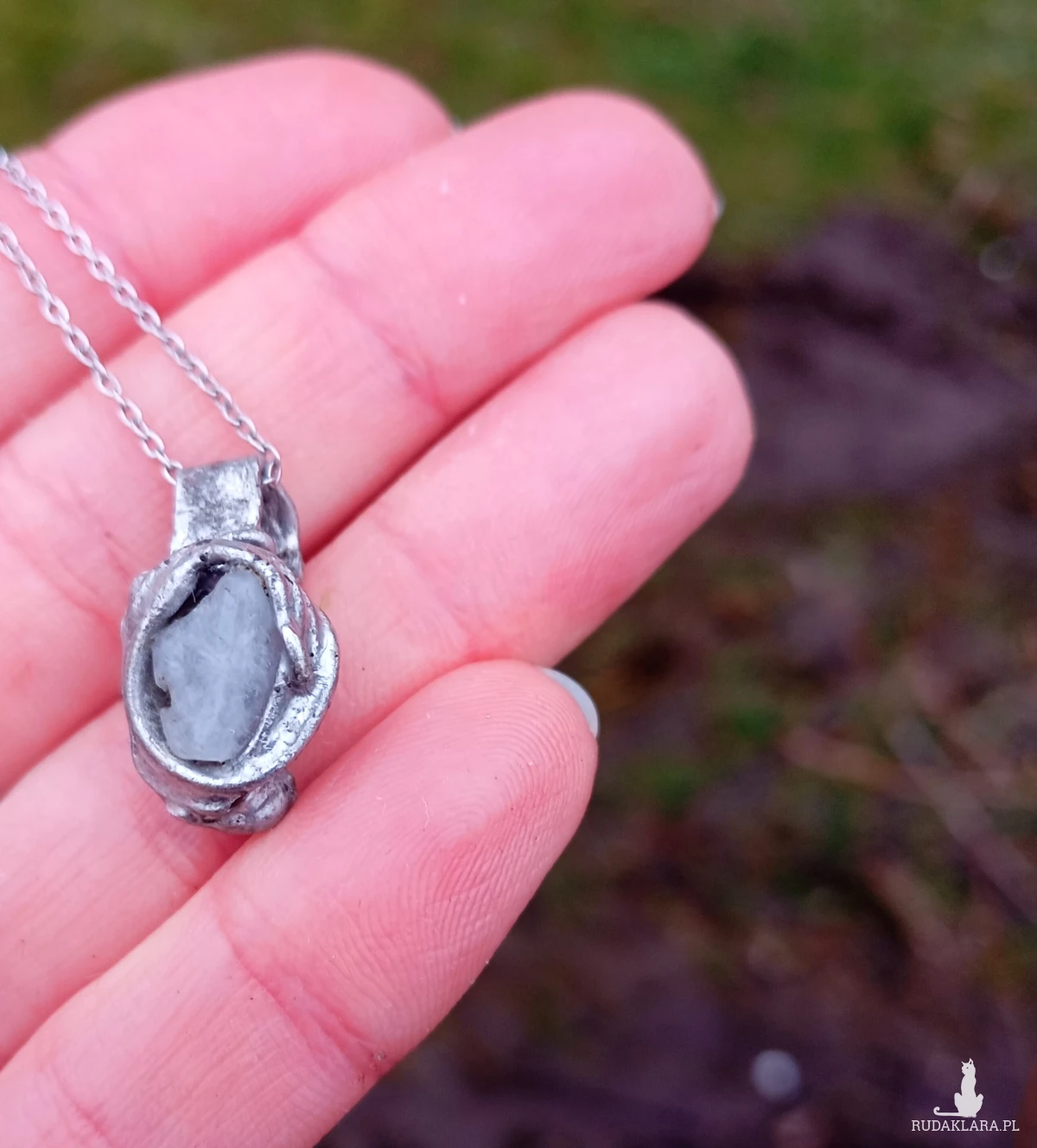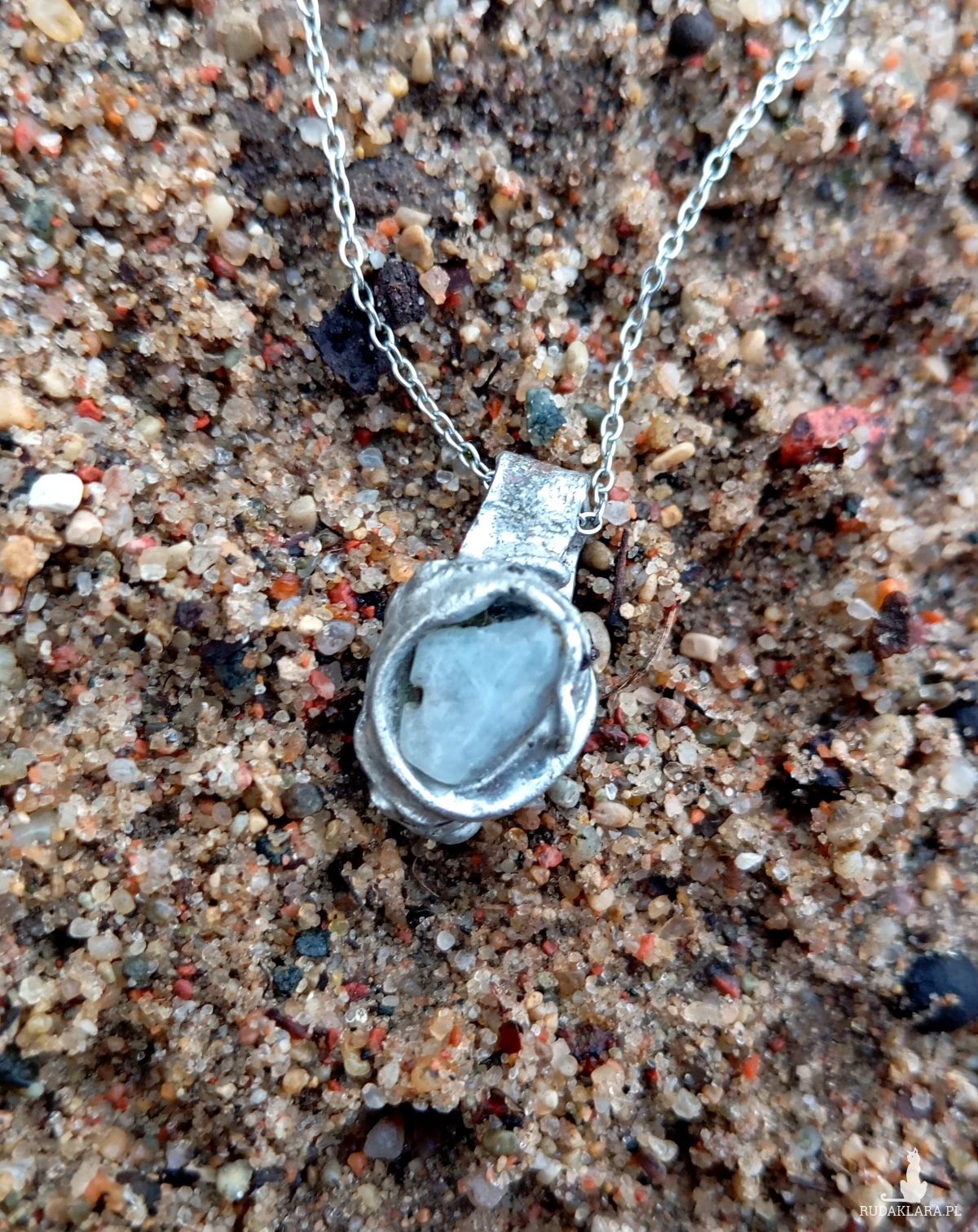 Akwamaryn subtelnie łączy ze sobą toń wody i odbity w niej kolor spokojnego nieba. Niebo z ciekawością zerka w stronę nieuchwytnej wody, a ta, żartując sobie z niego, pokazuje mu lustro. Niebo nie poznało siebie, ale odczuło wielką sympatię do tajemniczej wody, która ma taki sam kolor, jak ono. Przysunęło się bliżej, miękko ułożyło na poduszkach z szarych chmur. Błękit wody nieco pobladł, niebo pomyślało, że jest ona nieśmiała i podeszło jeszcze bliżej. Zbliżało się tak mocno, że wpadło do wody. Woda roześmiała się. Niebo było bardzo zaskoczone, kolory wymieszały się, zrozumiało swoje lustro. Nasze lustra nas przyciągają. Poruszone swoim odkryciem niebo, postanowiło spędzić z wodą tyle czasu, ile to tylko możliwe. Z tego połączenia nieba i wody, narodził się akwamaryn. Zintegrował w sobie dary swoich rodziców i wyruszył w świat, żeby dzielić się nimi z innymi. Uczy ludzi komunikacji, wyrażania emocji, osiągania wewnętrznego spokoju i odczuwania radości. Wspomaga również asertywność, pewność siebie i zachęca do spontaniczności. Długość zawieszki 2 cm.
