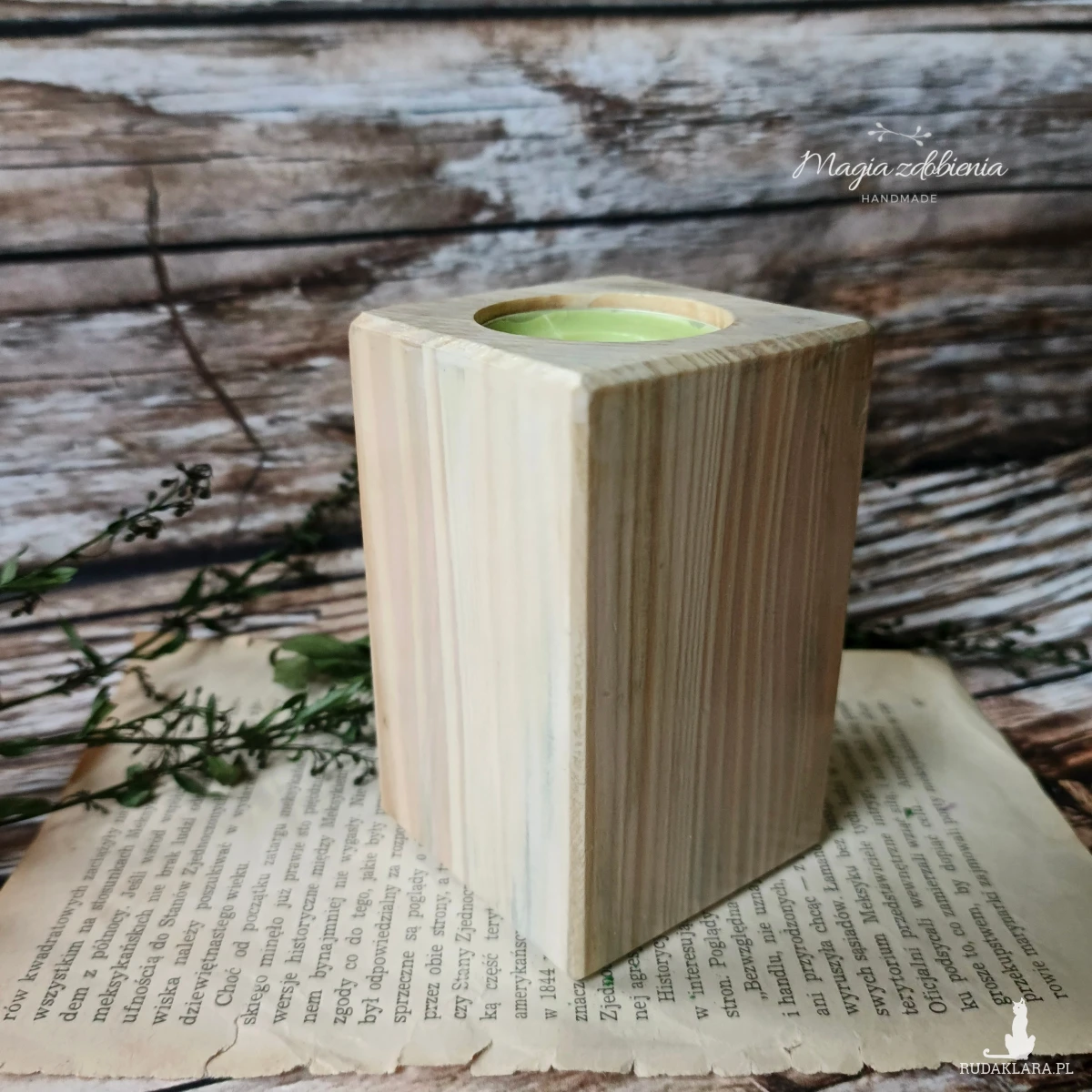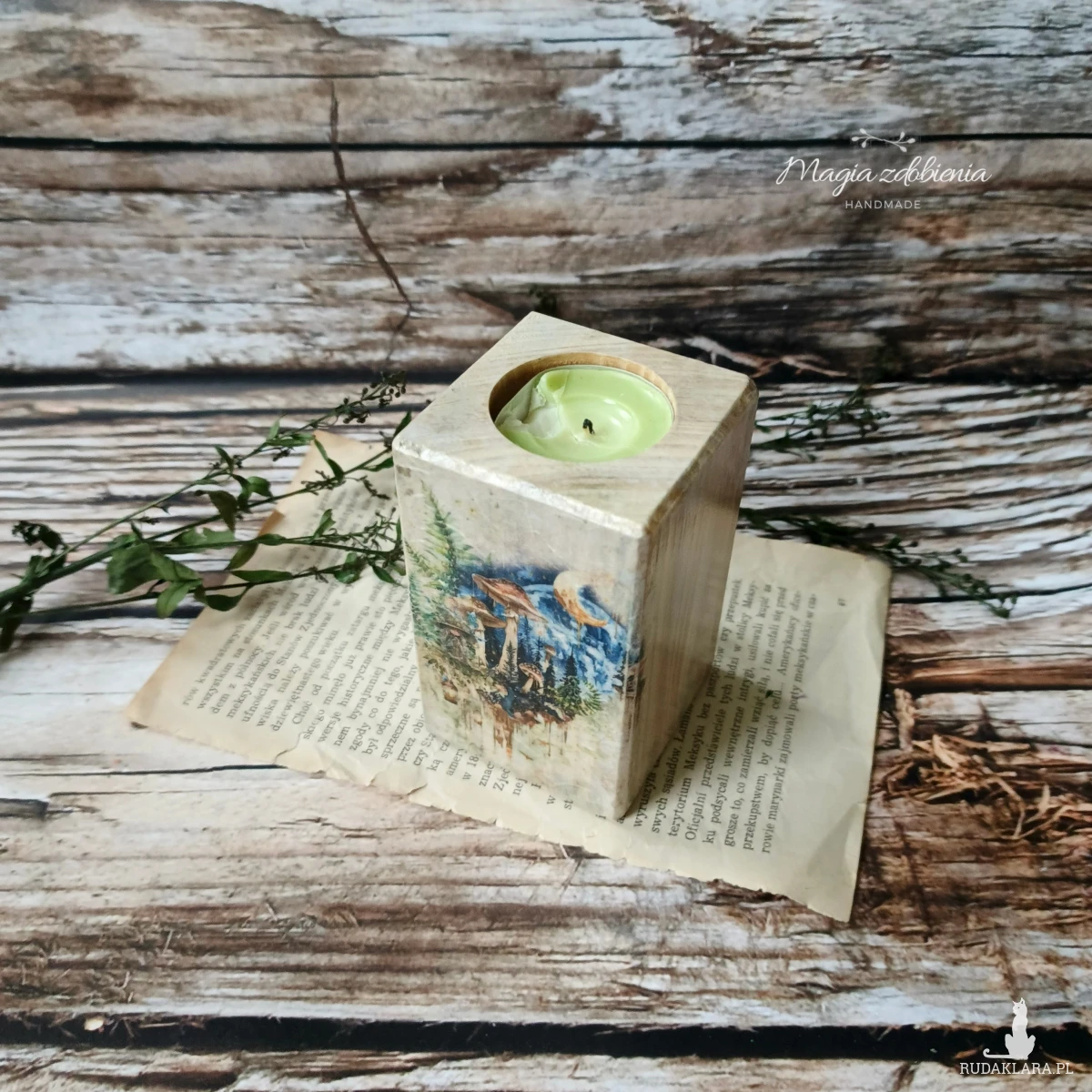 Drewniany świecznik zdobiony ręcznie techniką decoupage. Pomalowany bejcami, delikatnie bielony. Bajkowa grafika - papier ryżowy. Kilkakrotnie lakierowany ( mat ).