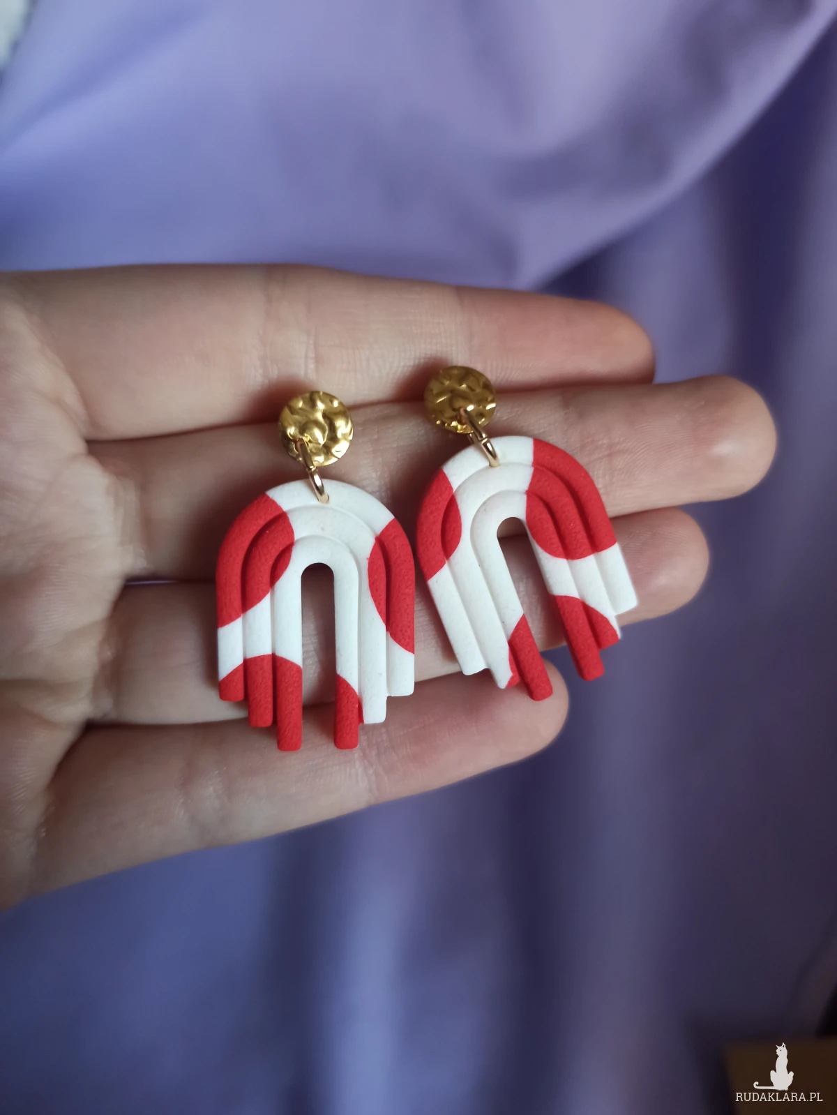 Kolczyki wiszące w kształcie białych łuków z czerwonymi ciapkami z ozdobnymi złotymi sztyftami