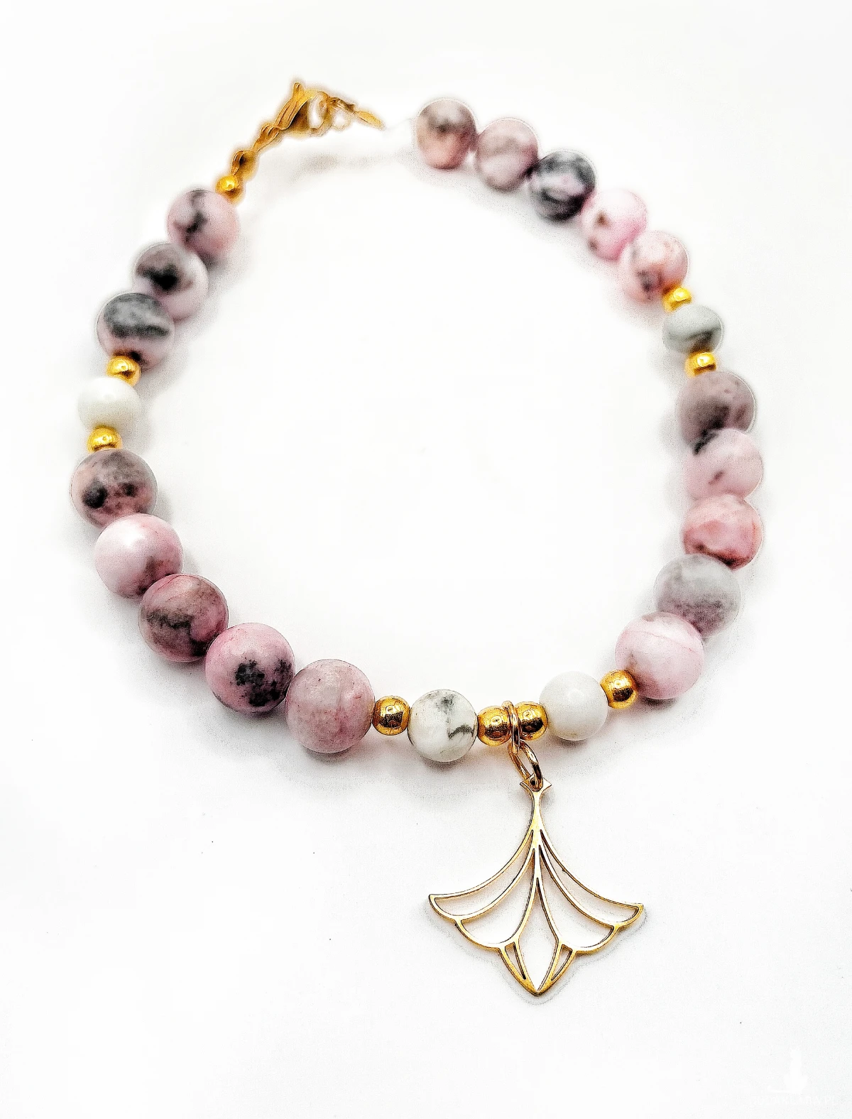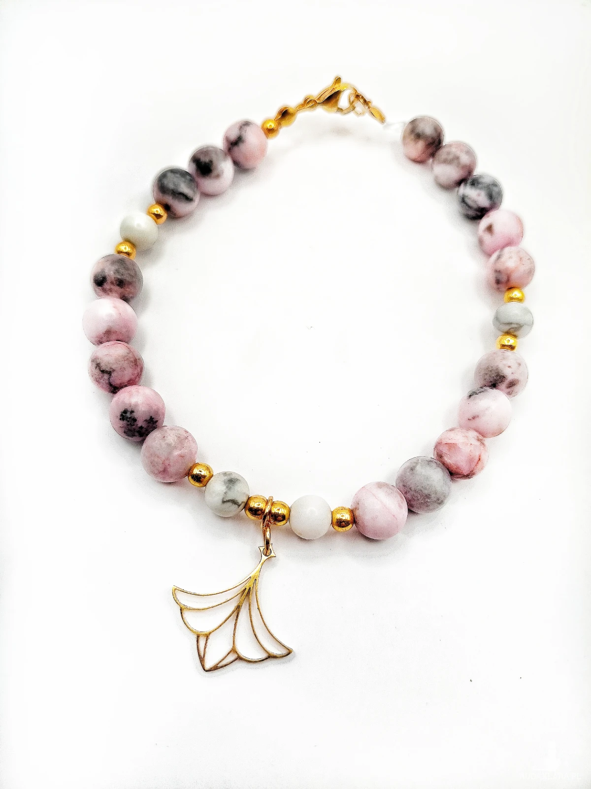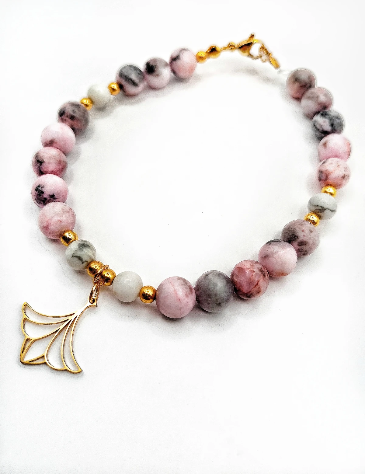 Dodaj subtelnego uroku swojej stylizacji dzięki ręcznie wykonanej bransoletce z naturalnych kamieni – agatu i jaspisu. Ich wyjątkowa kolorystyka oraz zawieszka w kształcie kwiatu ze stali nierdzewnej sprawiają, że biżuteria ta jest doskonałym dodatkiem na co dzień i wyjątkowe okazje.