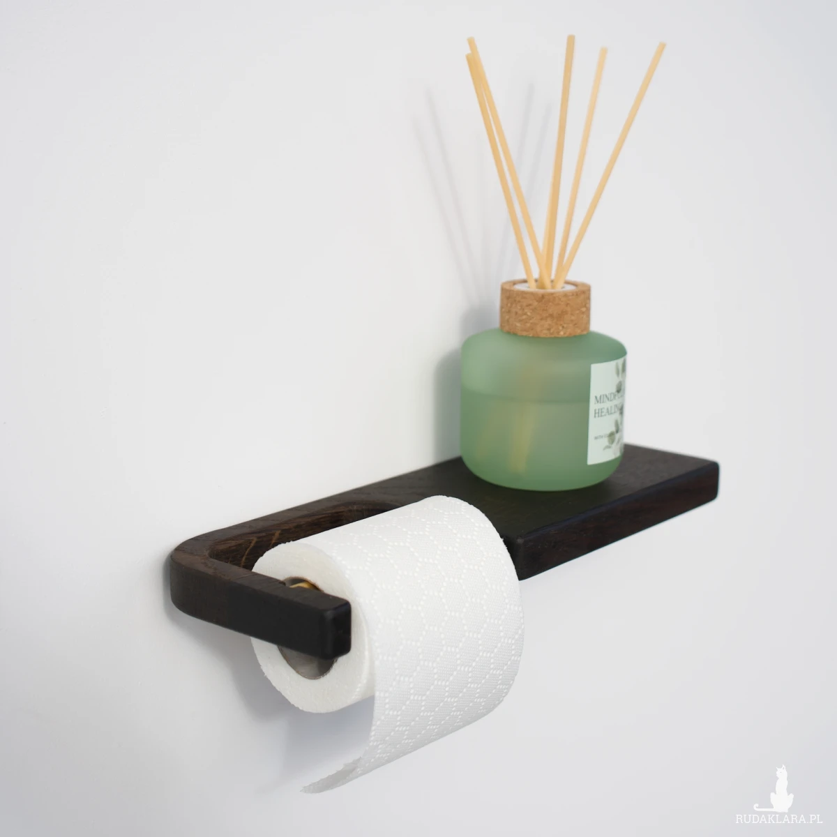 Minimalistyczny uchwyt na papier toaletowy z półką wykonany z czarnego litego dębu to doskonałe połączenie stylu, funkcjonalności i trwałości. Jego naturalne wykończenie oraz uniwersalny design sprawiają, że pasuje do każdej aranżacji – od klasycznych po nowoczesne wnętrza.