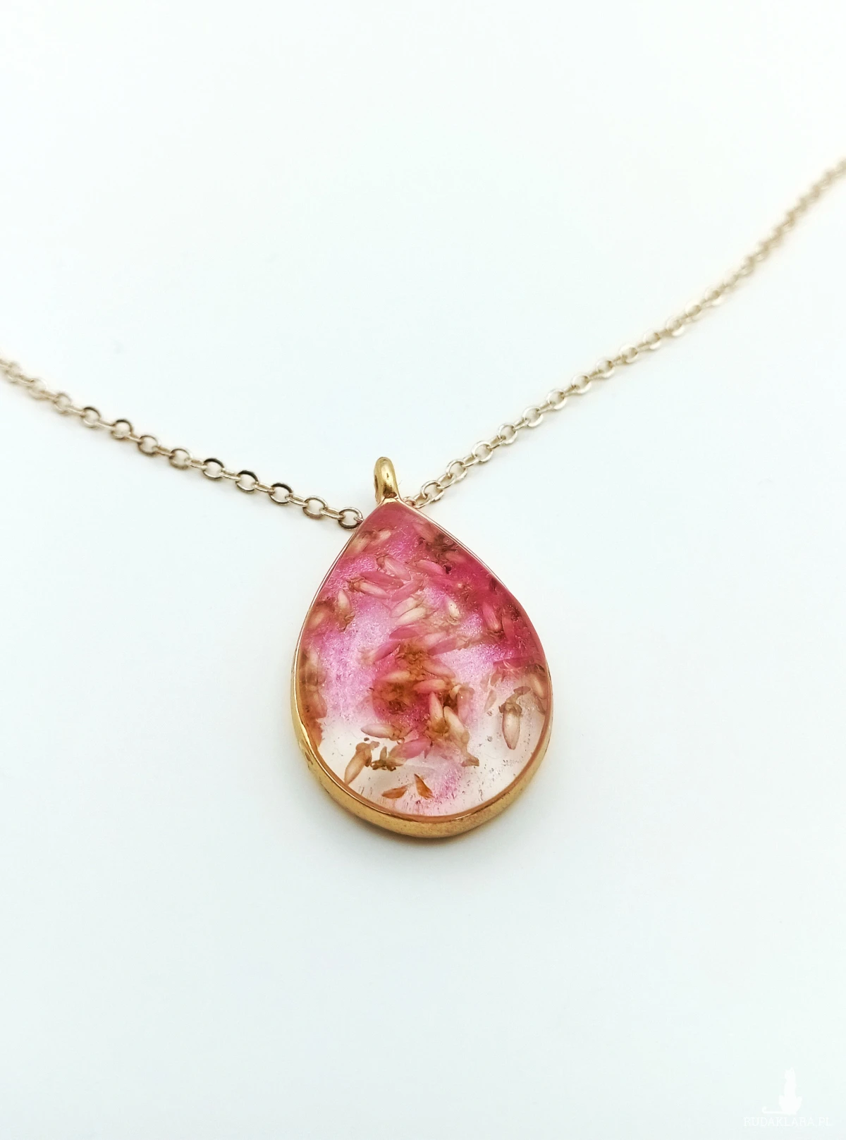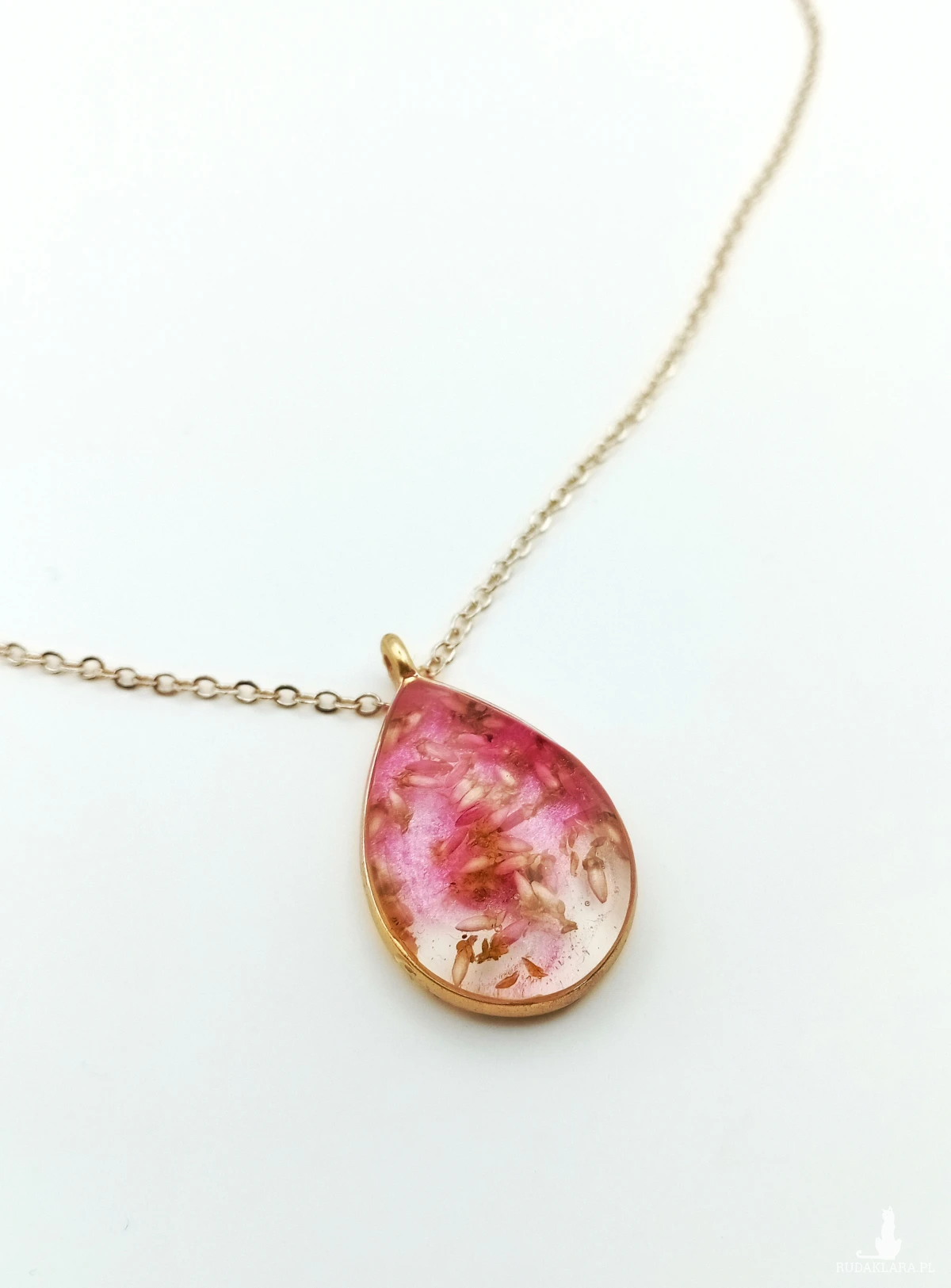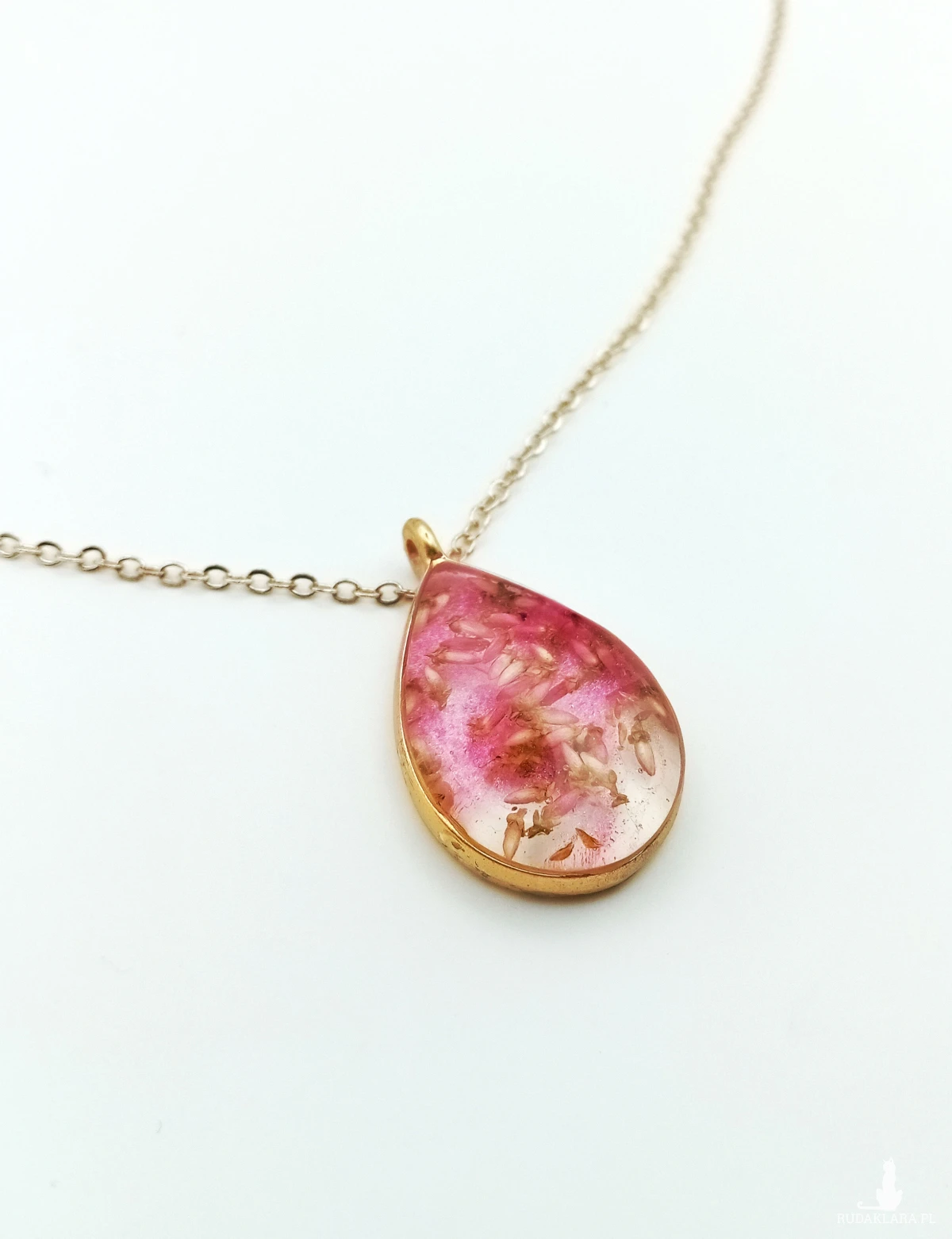 Elegancki Design: Wisiorek w kształcie łezki ozdobiony suszonym wrzosem tworzy wyjątkową, stylową kompozycję.