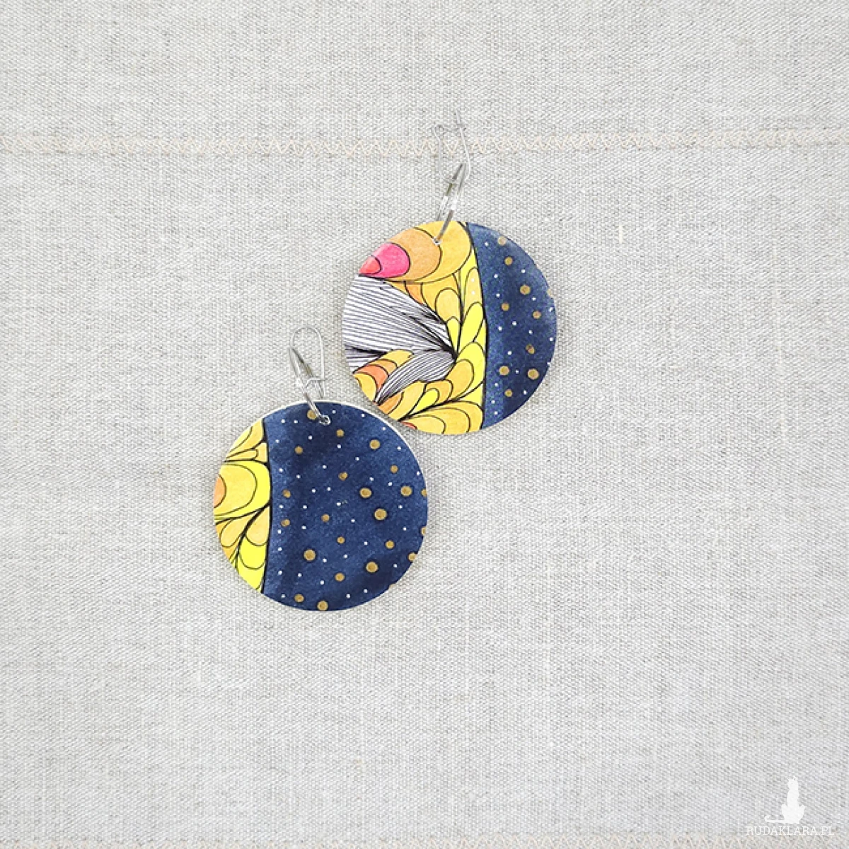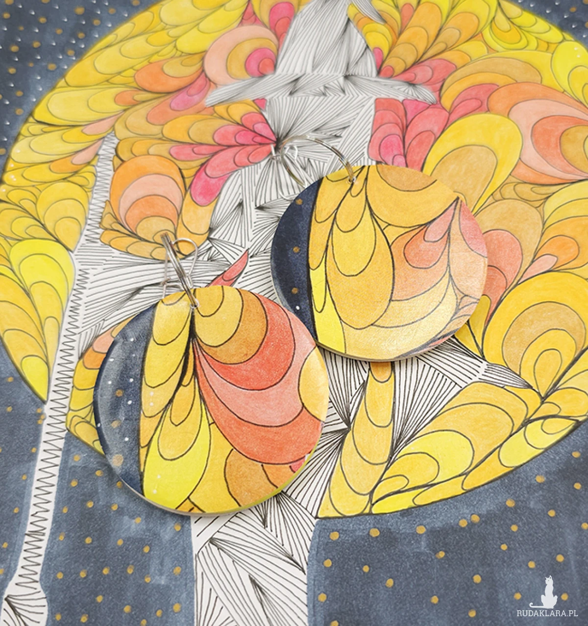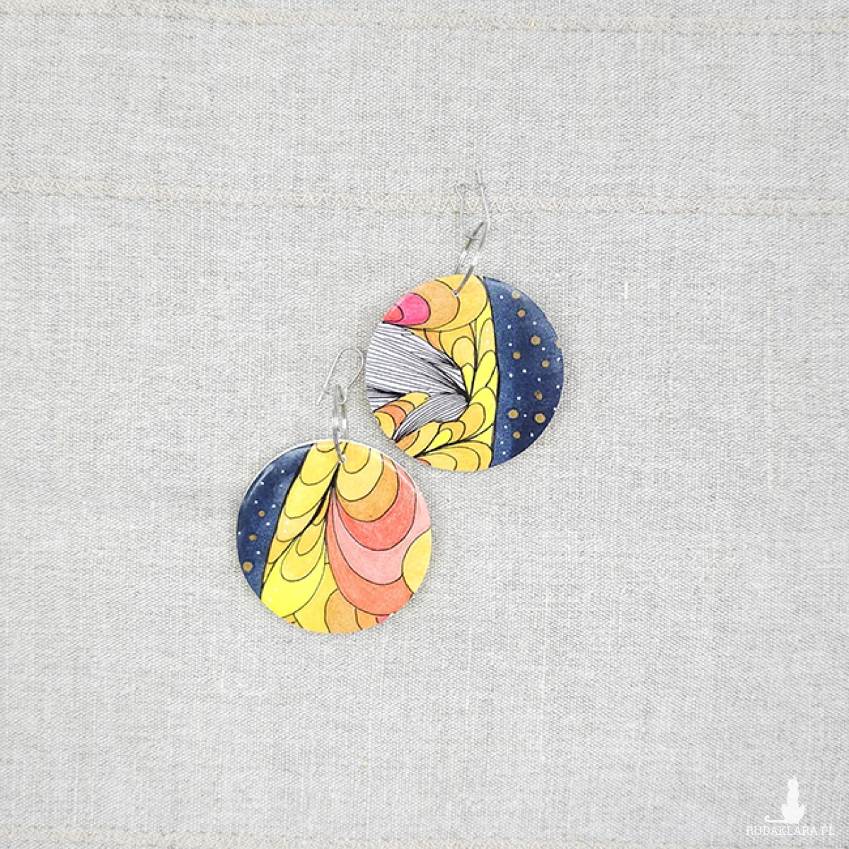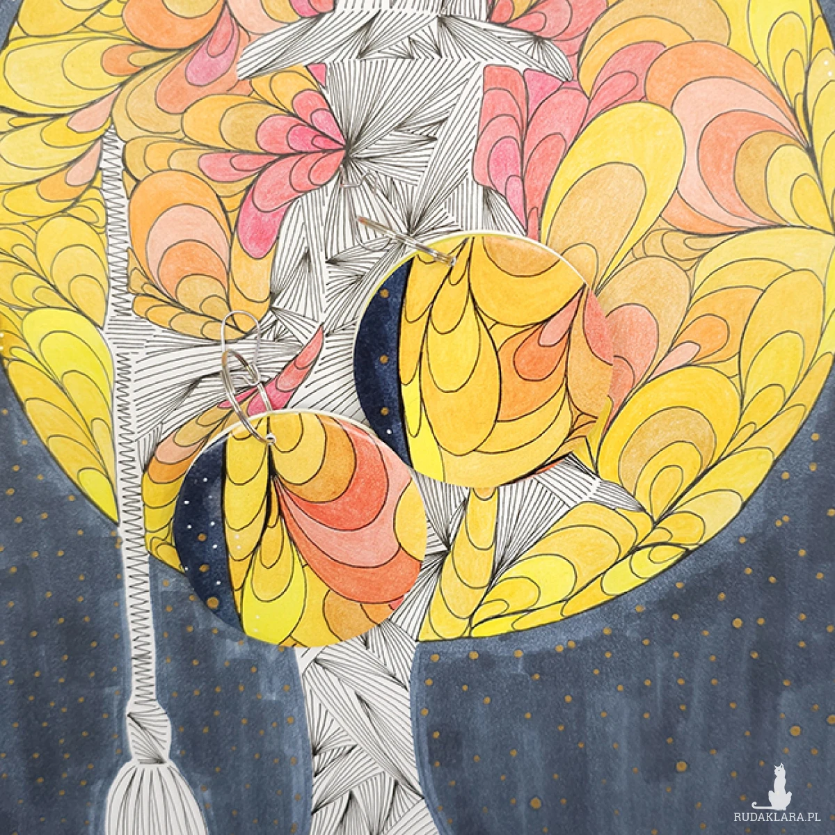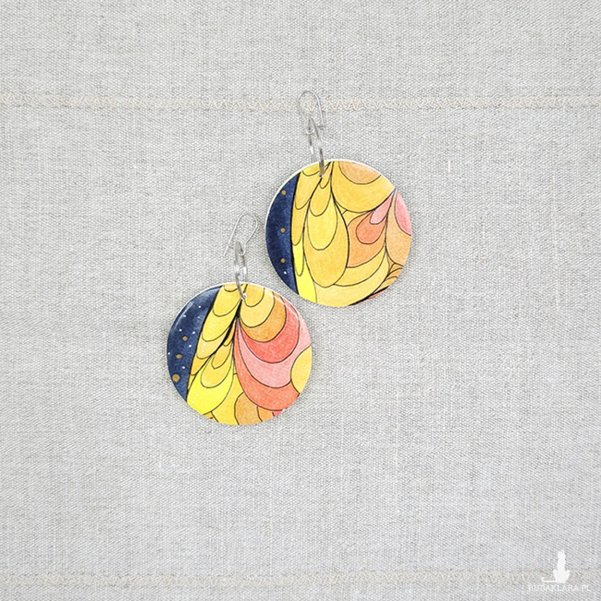 Kolczyki wykonane z drewnianej bazy oraz części mojego autorskiego rysunku "Pełnia".