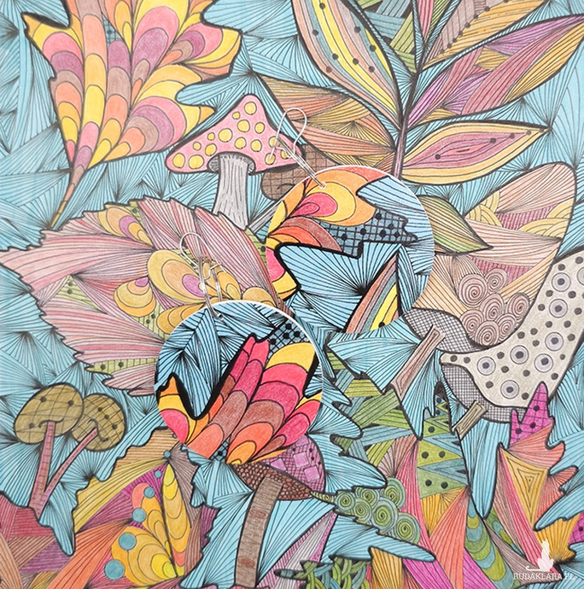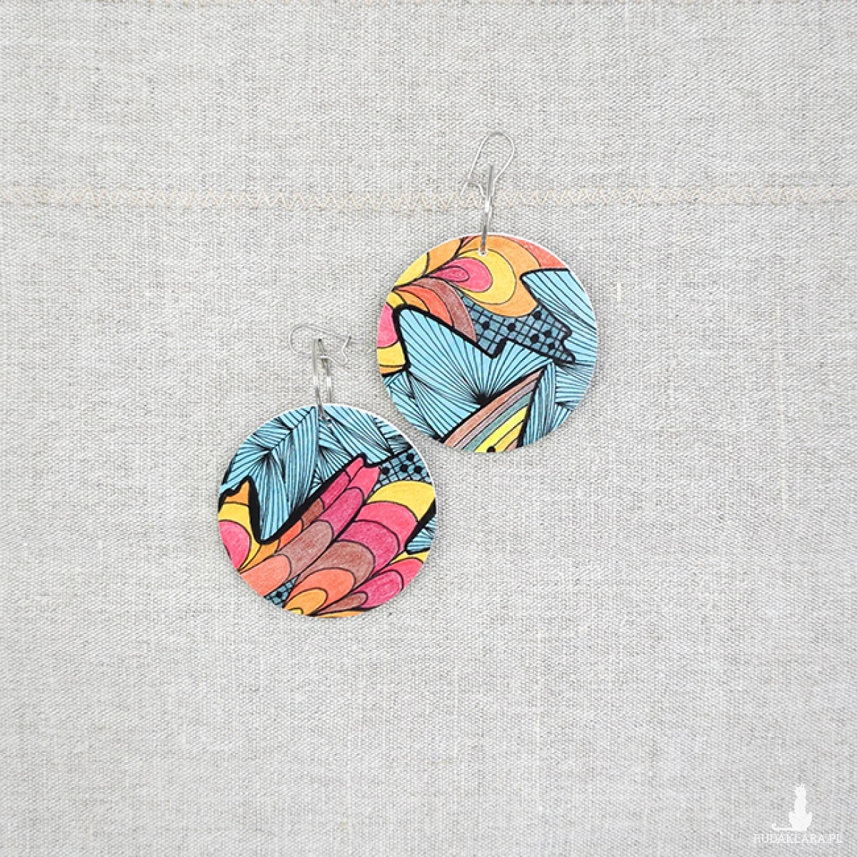 Kolczyki wykonane z drewnianej bazy oraz części mojego autorskiego rysunku "Jesień".