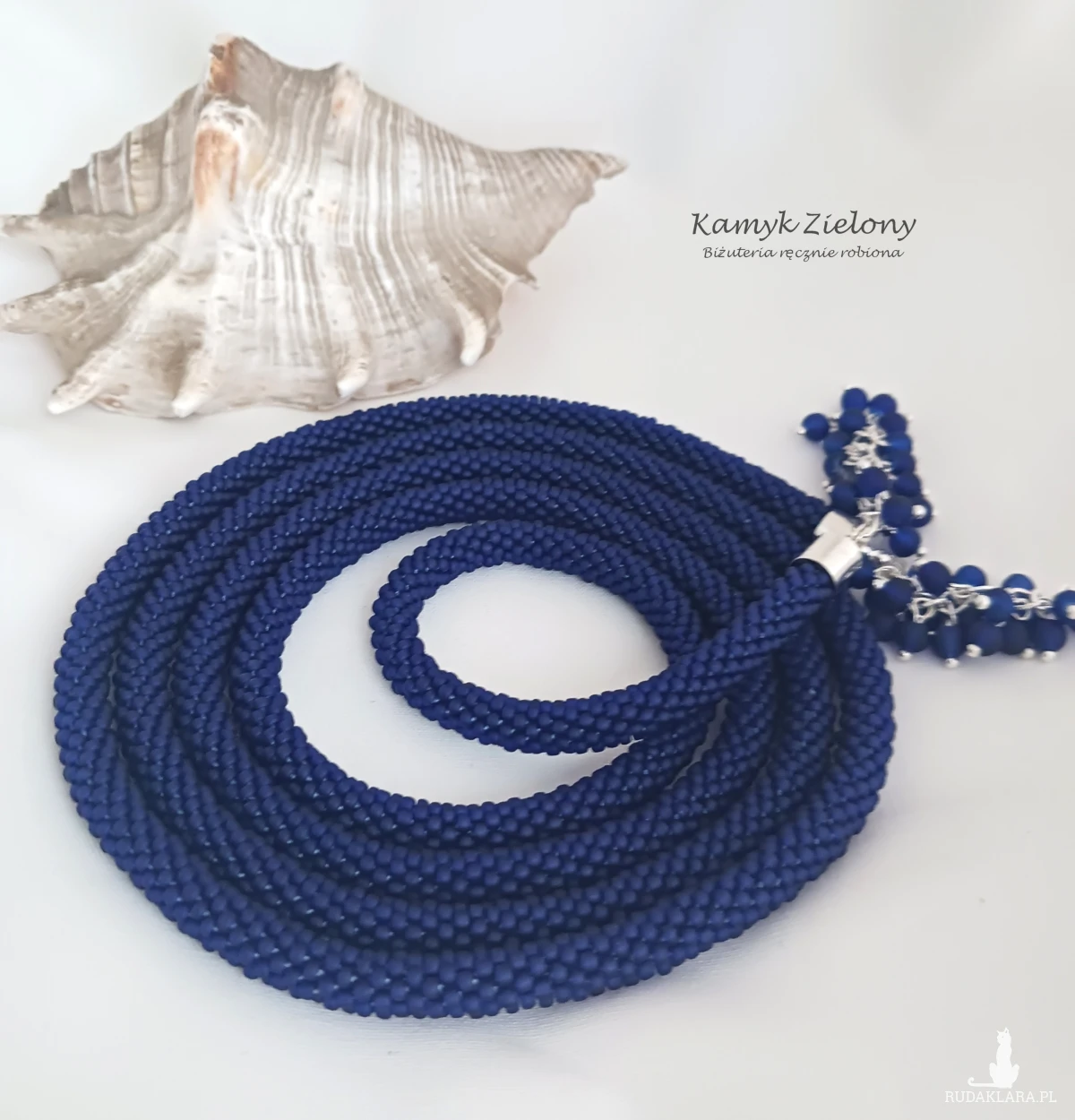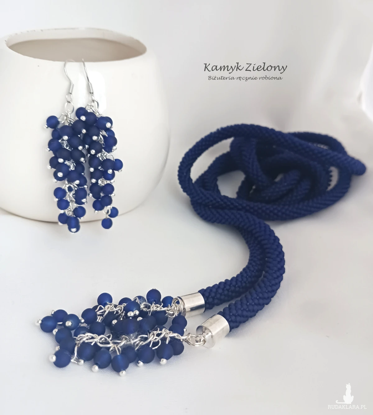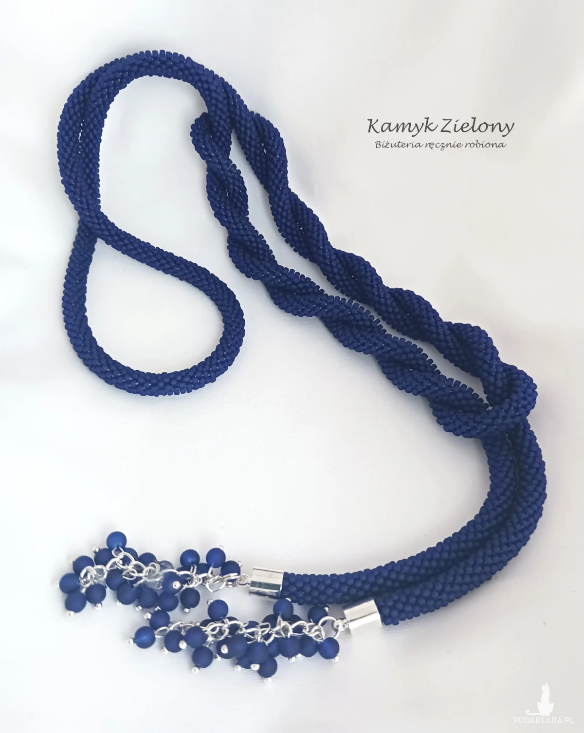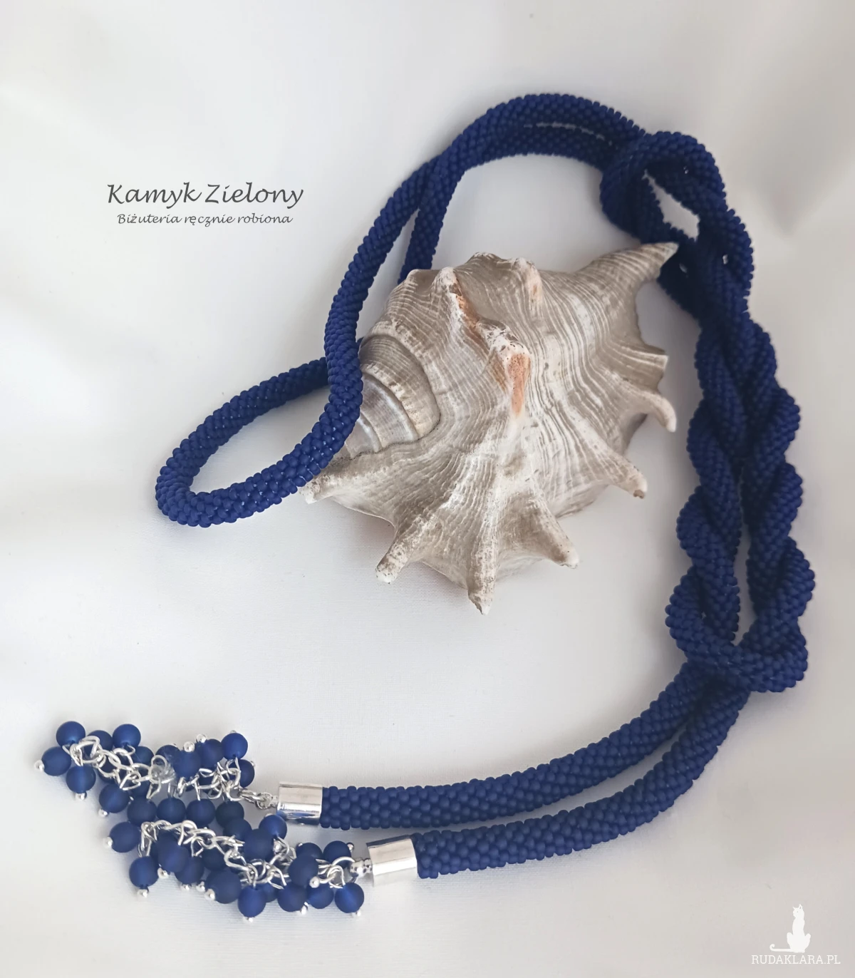 Końce sznura ozdobiono dopiętymi gronkami ze szklanych, granatowych kuleczek z efektem zmrożenia oraz koralików Toho w srebrnym kolorze.