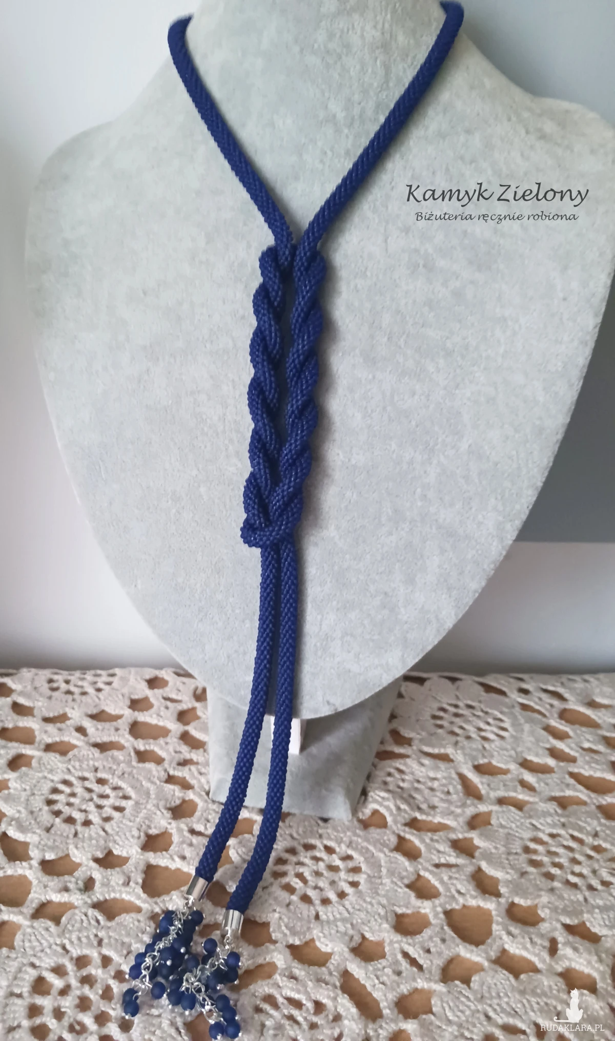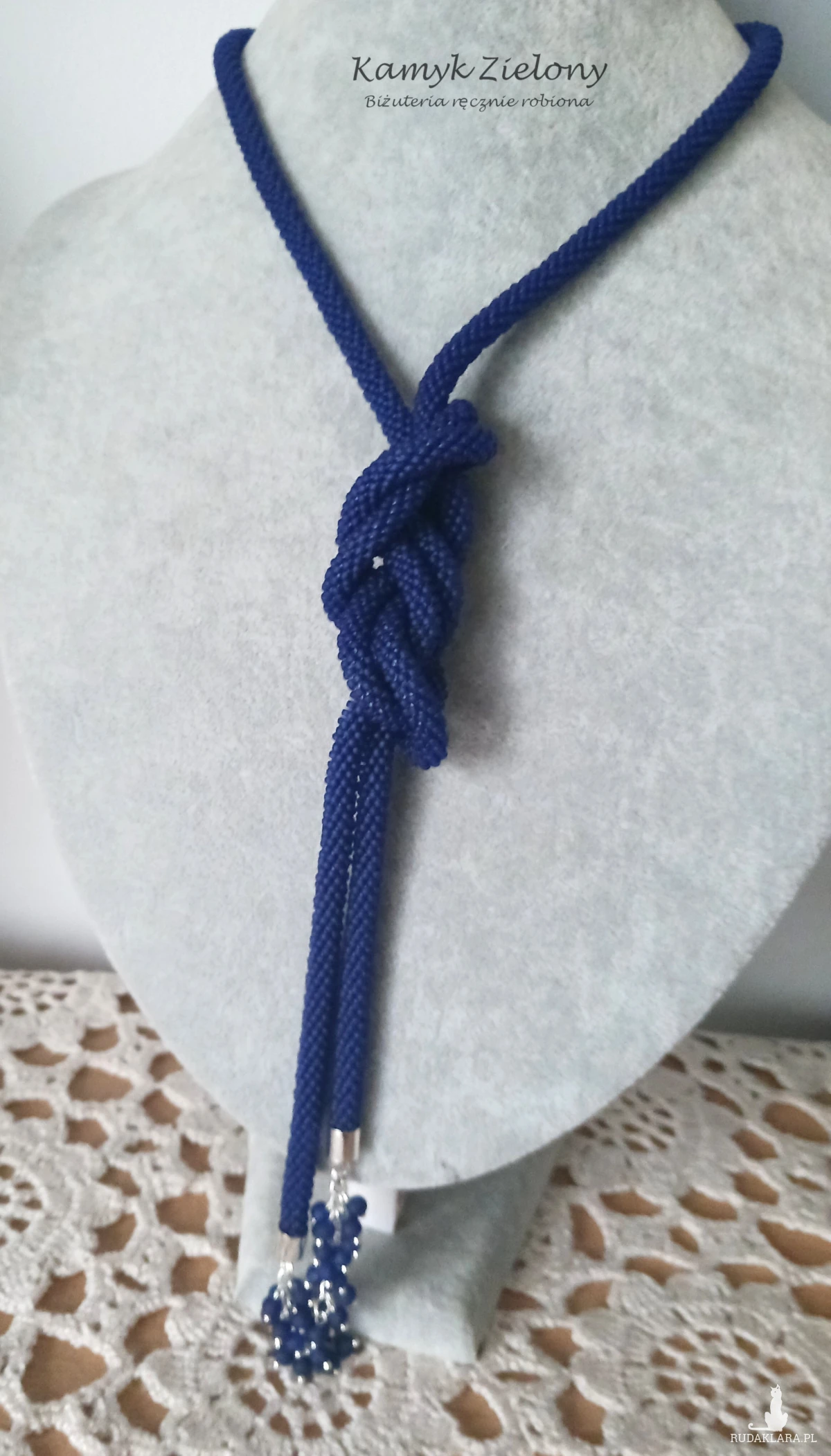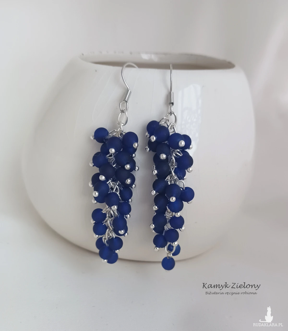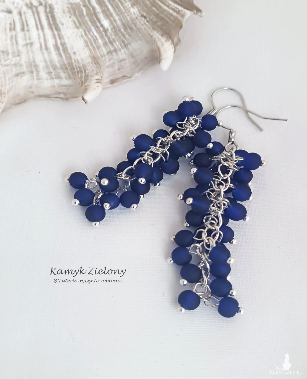 Końce sznura ozdobiono dopiętymi gronkami ze szklanych, granatowych kuleczek z efektem zmrożenia oraz koralików Toho w srebrnym kolorze.