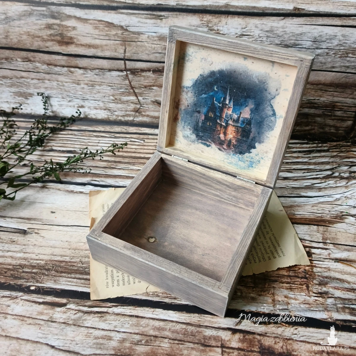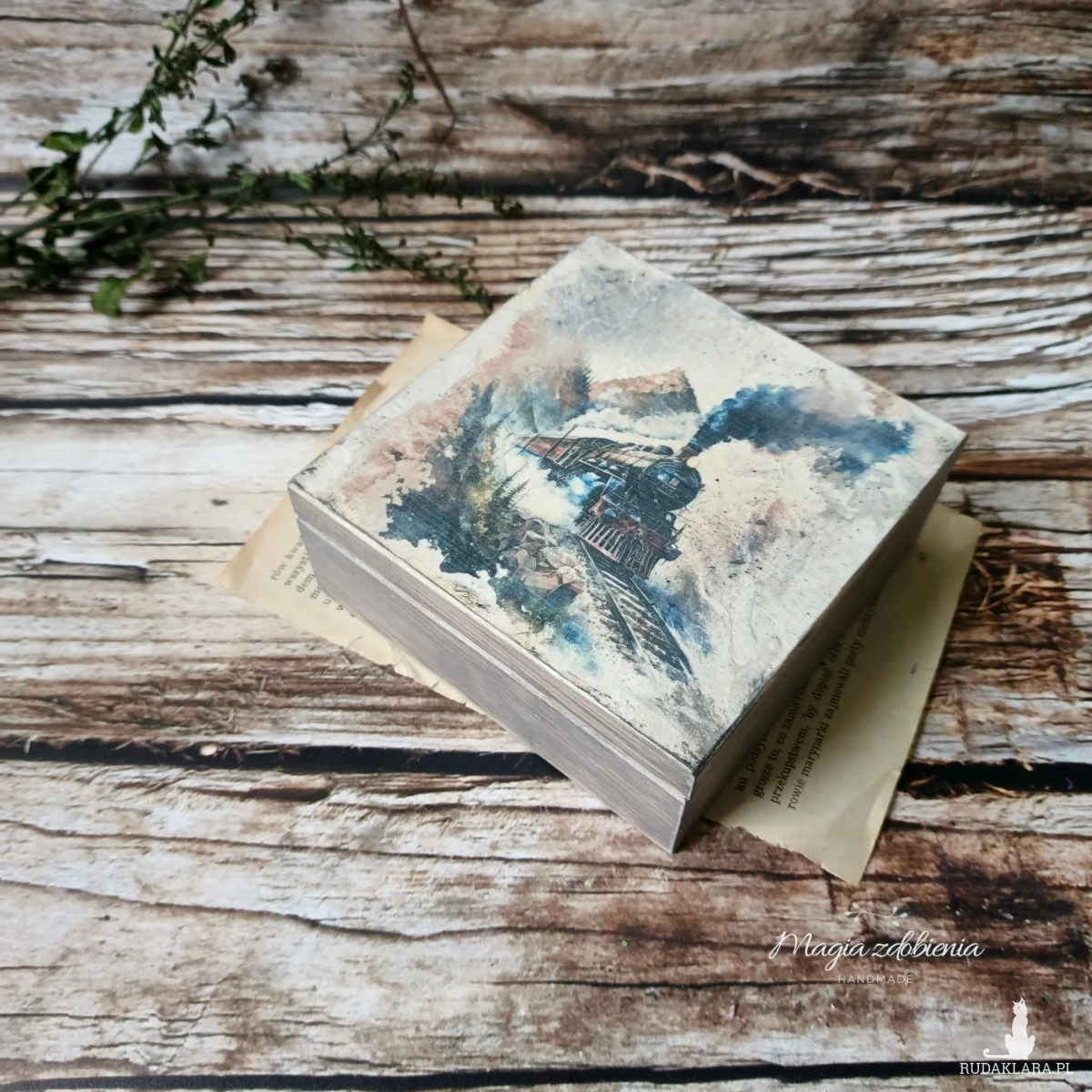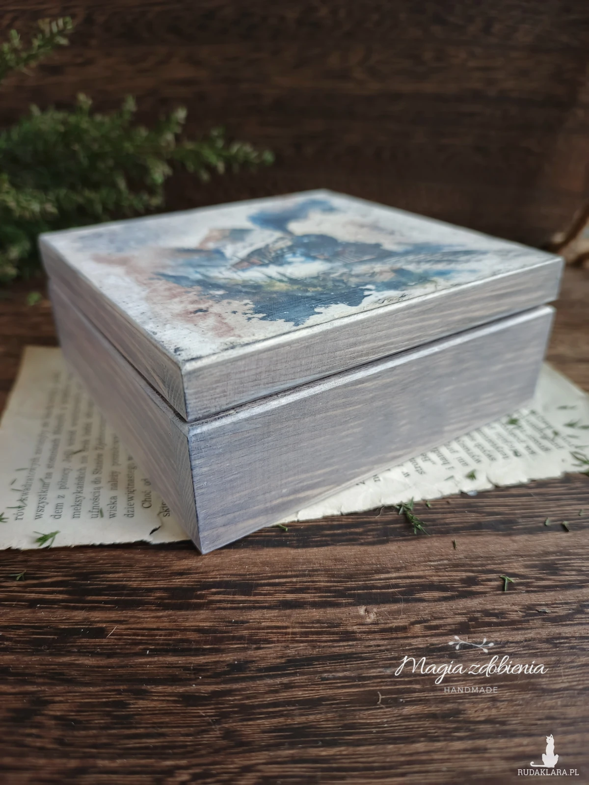 Drewniane pudełko zdobione ręcznie techniką decoupage.