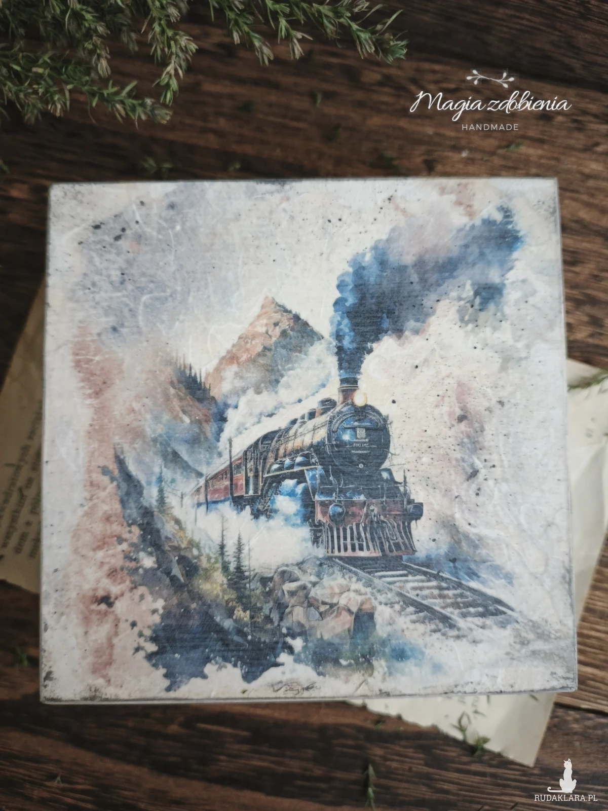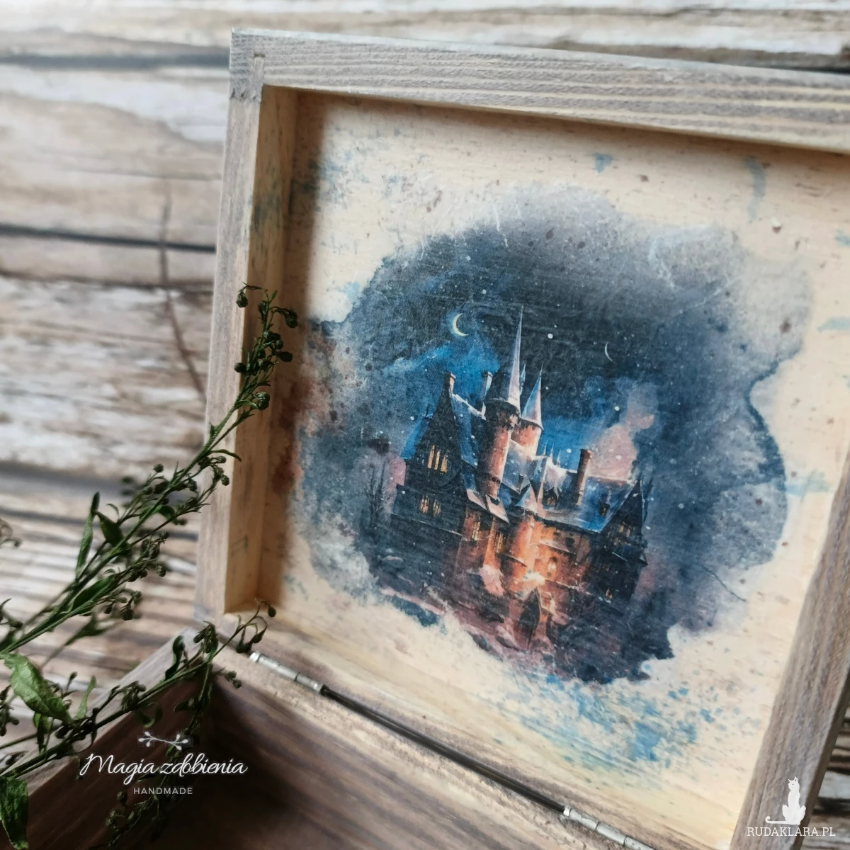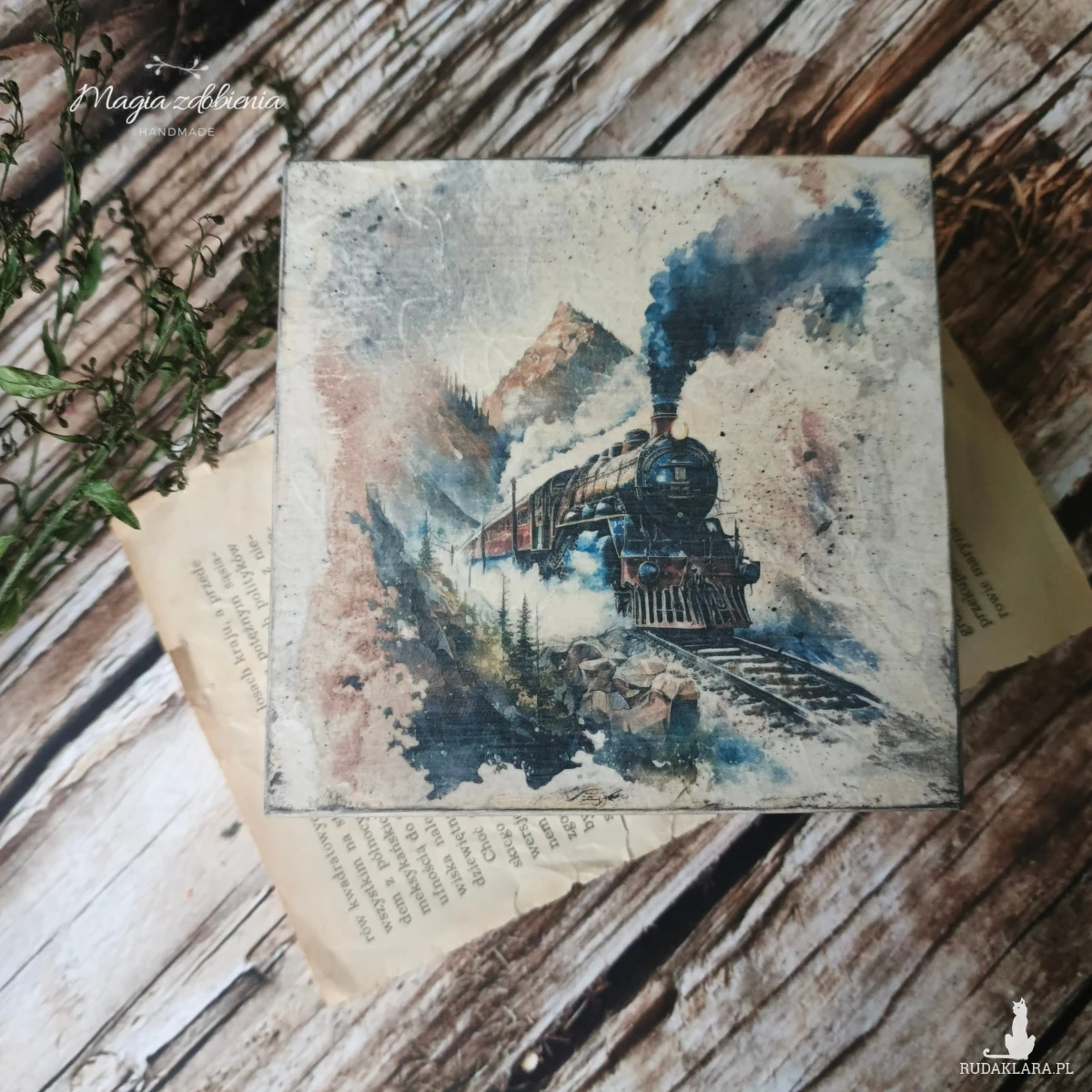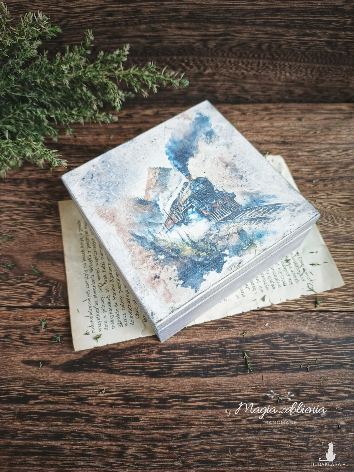 Drewniane pudełko zdobione ręcznie techniką decoupage.