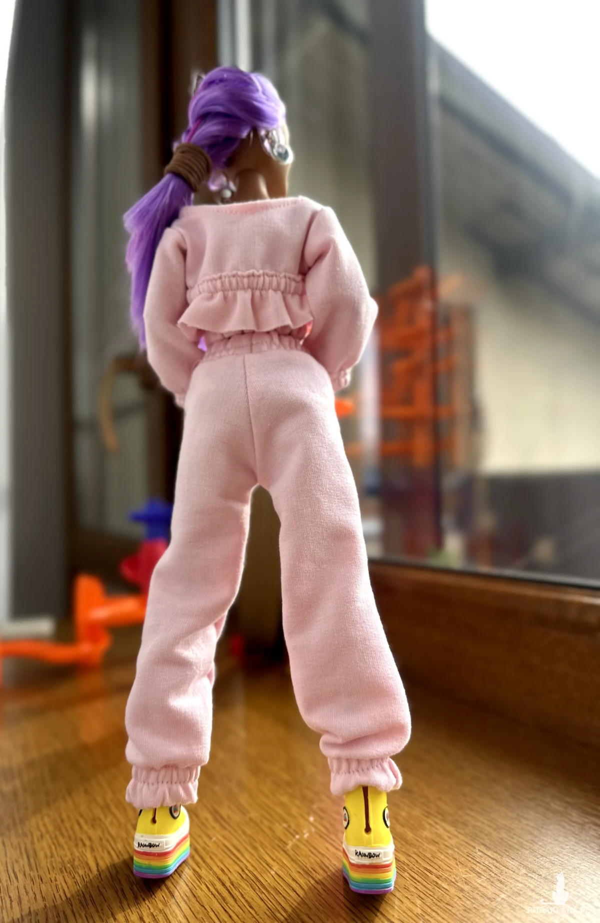 Dresik w kolorze pastelowego różu. Spodnie mają rozszerzane nogawki zakończone ściągaczem z gumką. Bluza na plecach ma falbankę, którą można zakładać również na przód .