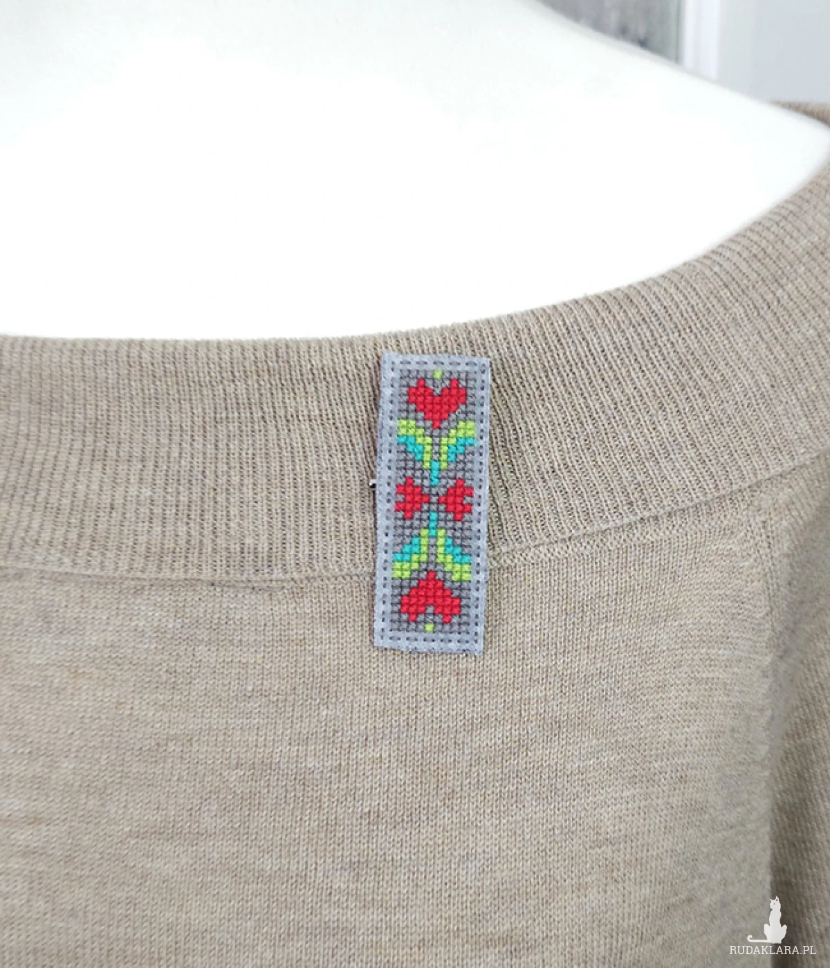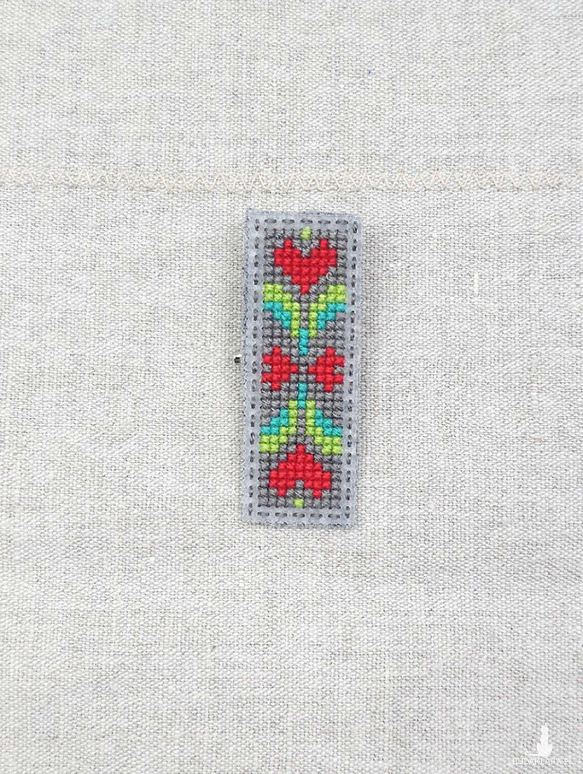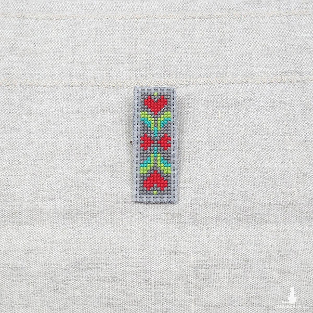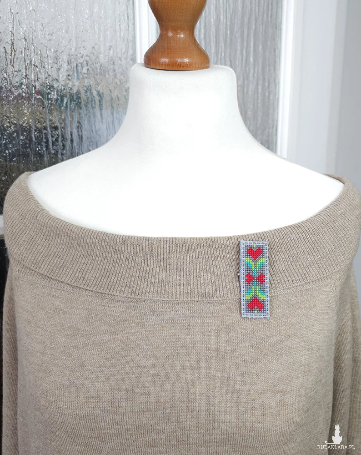 Kolorowa broszka wykonana haftem krzyżykowym. Jej folkowy, etniczny design wprowadza ludowy akcent, który doda charakteru każdej stylizacji. Wykonana z wysokiej jakości materiałów, broszka łączy tradycyjne rzemiosło z nowoczesnym stylem, czyniąc ją doskonałym dodatkiem dla miłośników unikalnych i oryginalnych akcesoriów.