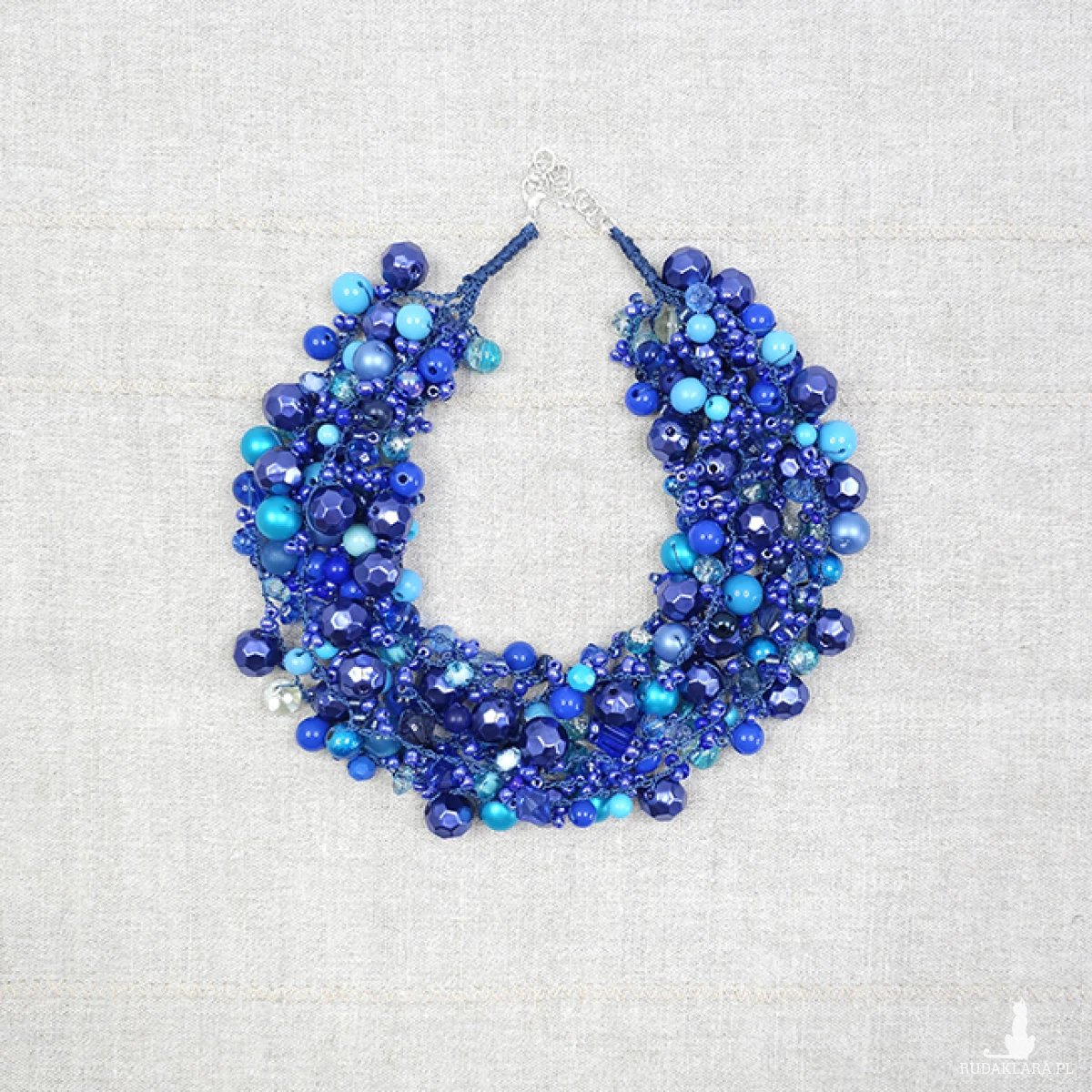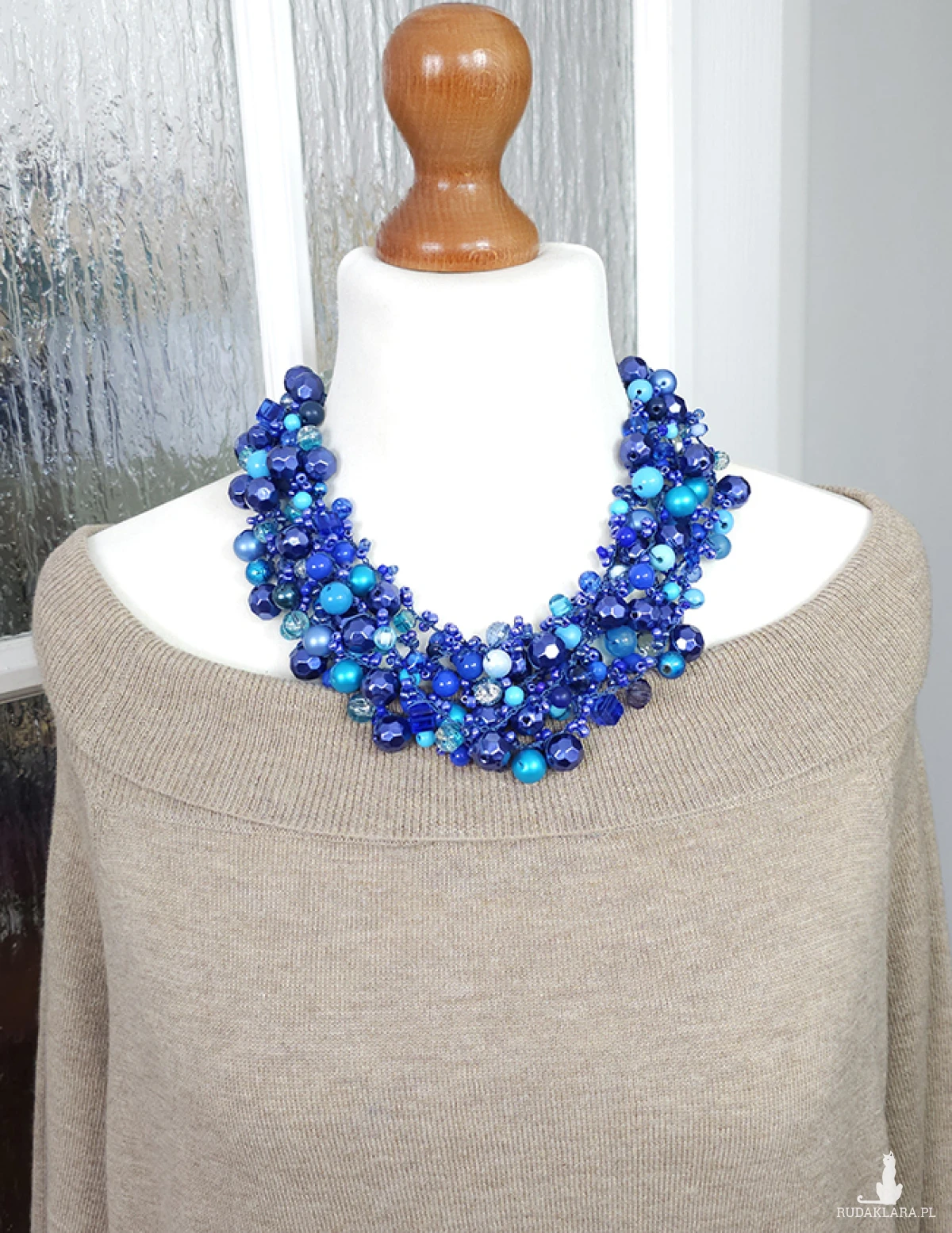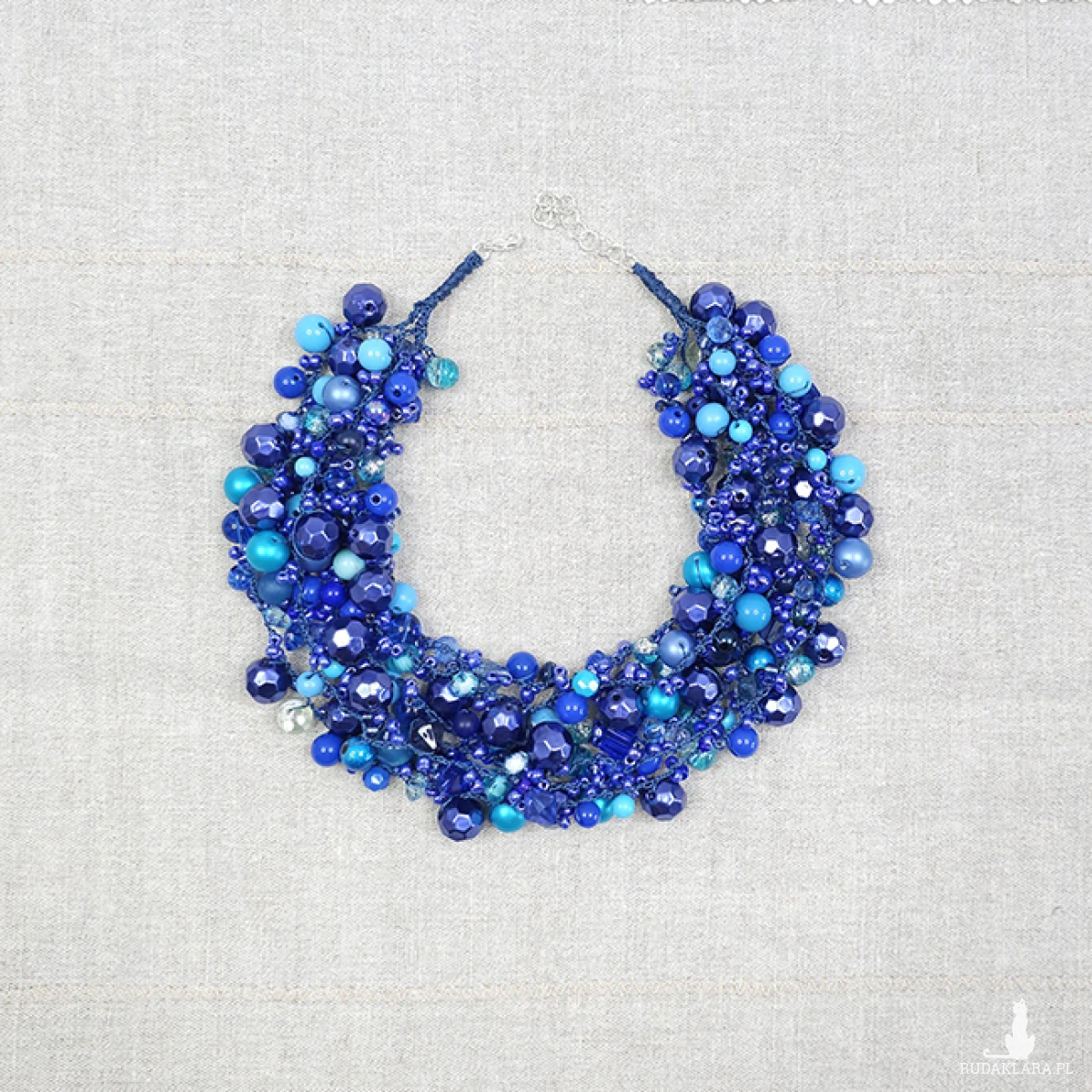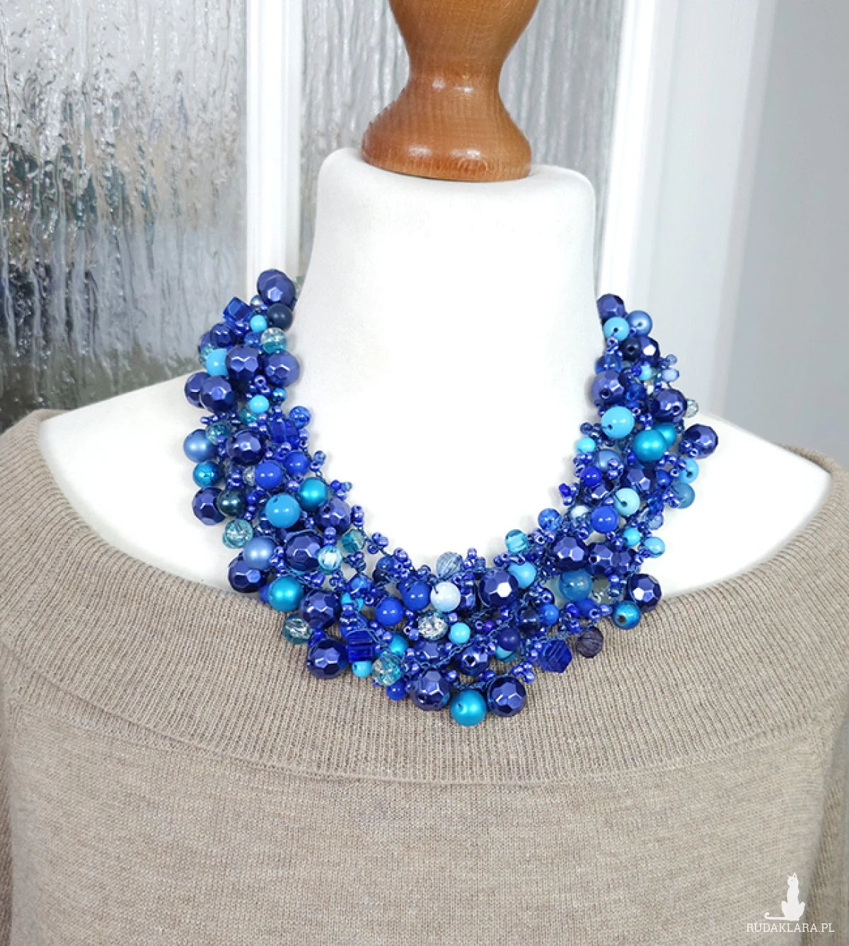 Elegancki naszyjnik w odcieniach granatu i niebieskiego. Jego subtelny blask i staranne wykonanie sprawiają, że jest idealnym dodatkiem na specjalne okazje oraz codzienne wyjścia. Kolia ta łączy w sobie nowoczesny design z klasycznym stylem, co czyni ją uniwersalnym wyborem dla każdej kobiety.