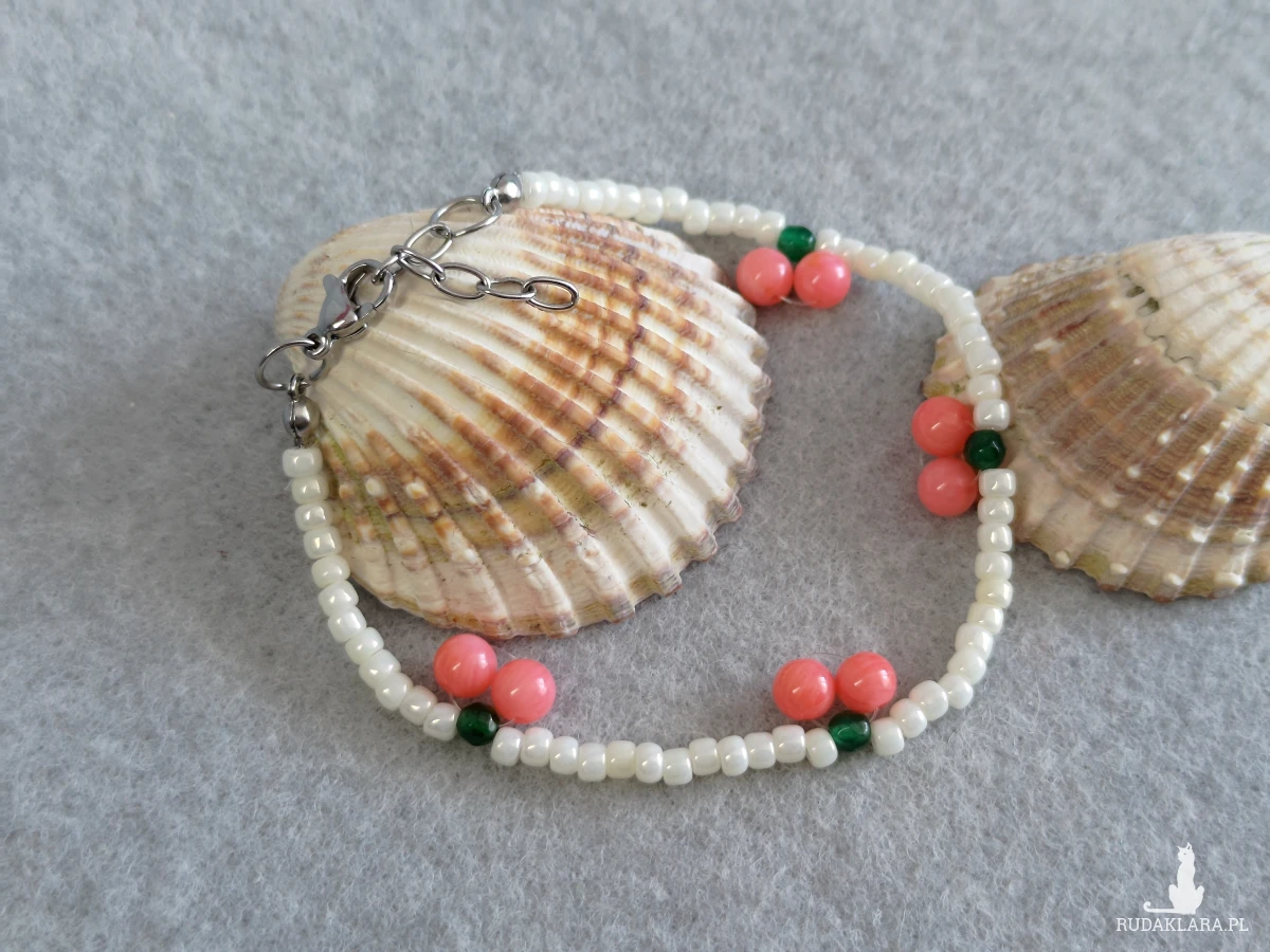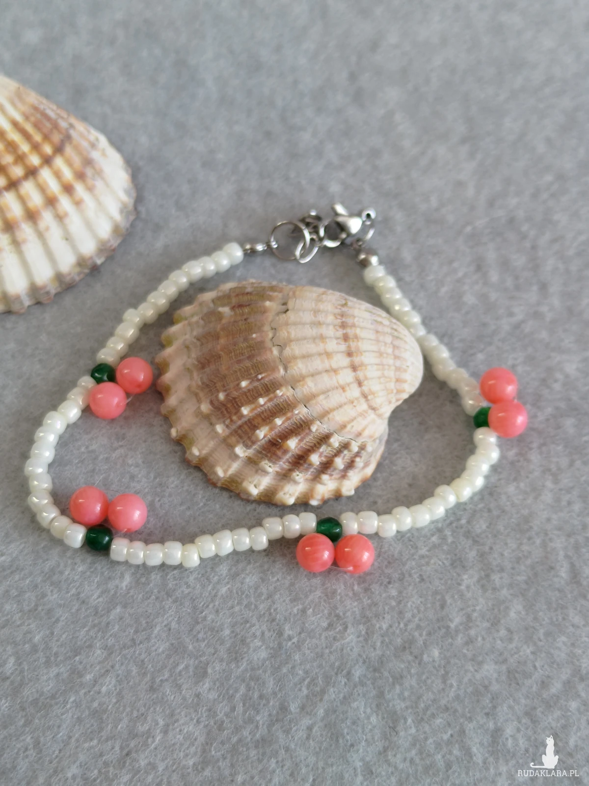 Bransoletka wykonana jest z koralików toho w kolorze perłowym, wisienki to 2 korale bambusowe z ogonkiem z zielonego agatu. Będzie idealnym dodatkiem do letnich stylizacji. Bransoletka posiada zapięcie ze stali chirurgicznej,