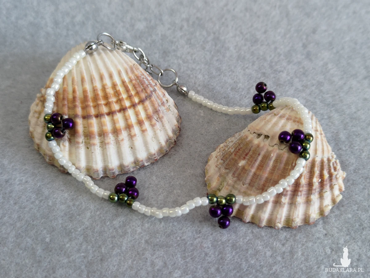 Bransoletka wykonana jest z koralików toho w kolorze perłowym, winogrona to 3 maleńkie hematyty z ogonkiem z zielonego hematytu. Będzie idealnym dodatkiem do każdej stylizacji. Bransoletka posiada zapięcie ze stali chirurgicznej,