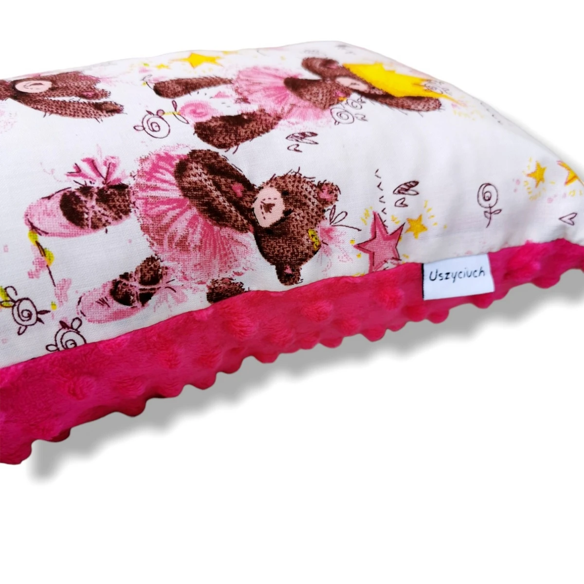Poduszka uszyta jest z bawełny i wysokogatunkowego polaru minky. Wypełnienie poduszki to najwyższej jakości antyalergiczna kulka silikonowa.