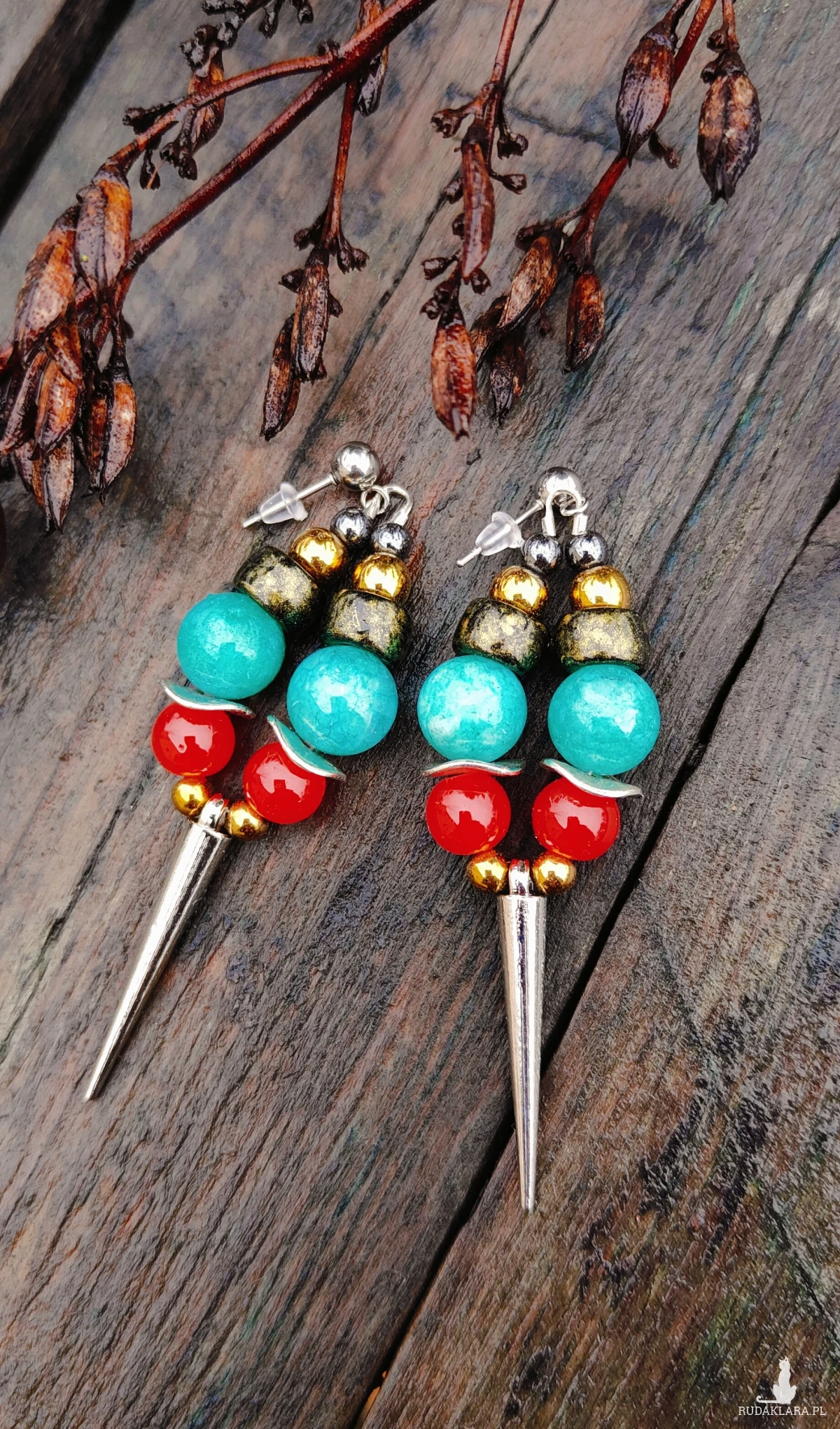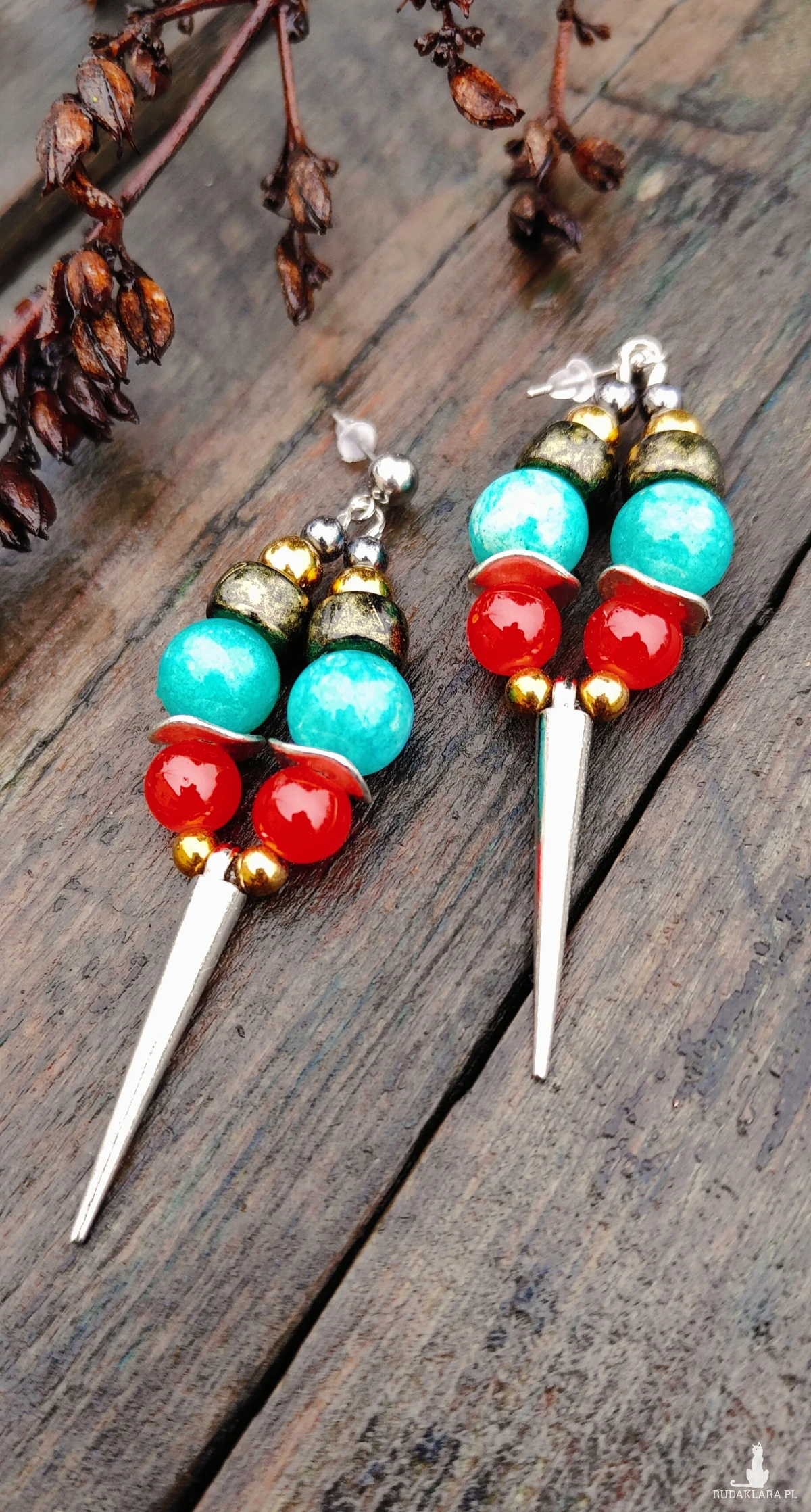 ,,kolec,, to kolorowe kolczyki wykonane z zielonego i czerwonego jadeitu, czarnego i złotego hematytu, szklanych koralików w kolorze czarno -zlotym, a także metalowych elementów w kolorze srebrnym. Kolczyki zawieszone są na ozdobnych biglach typy sztyft wykonanych ze stali szlachetnej.