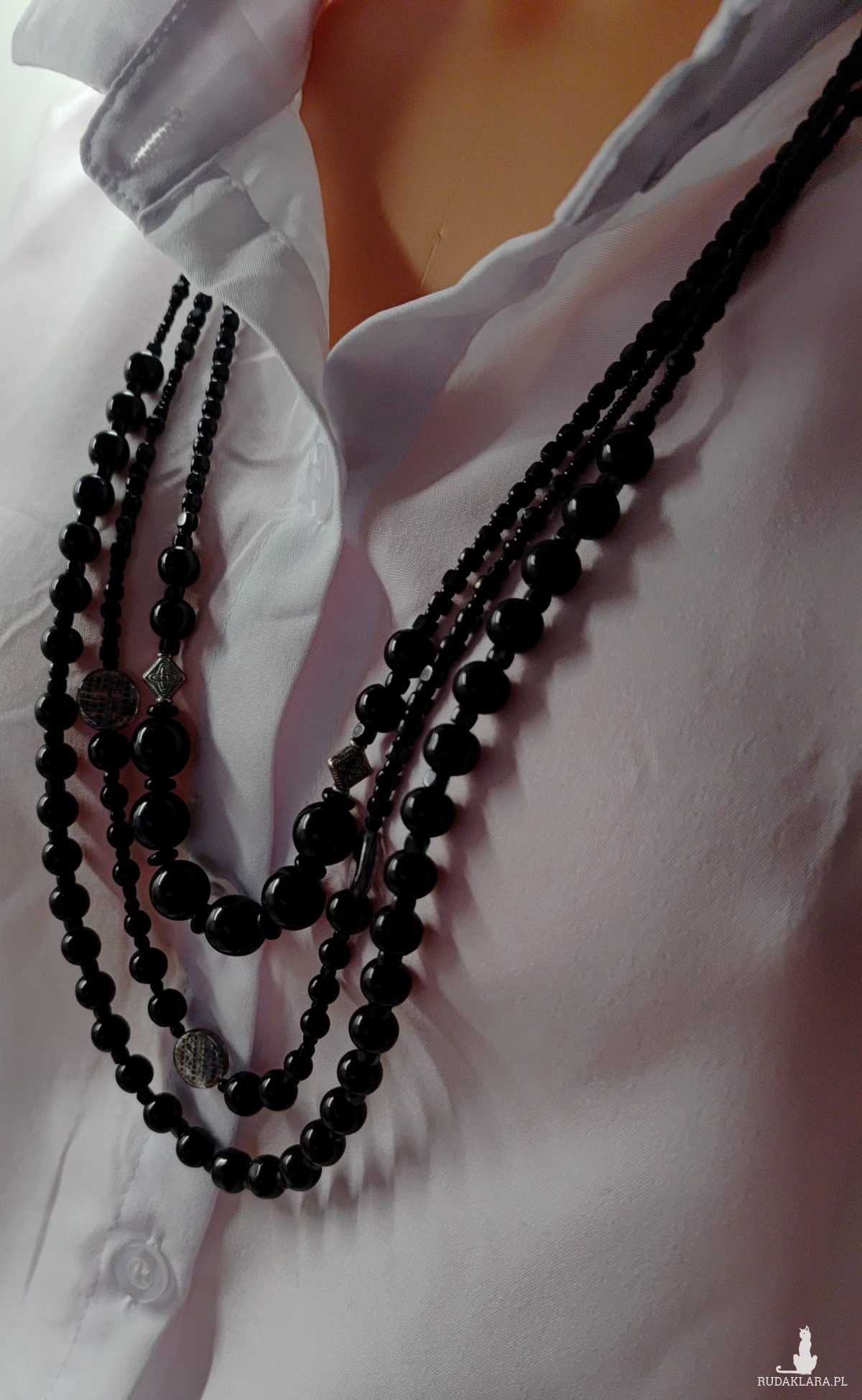 Naszyjnik , trzy sznury korali czarnych szklanych i kulek onyxu gładkiego 8 i 12 mm, korale na sznurku syntetycznym, bezpieczne dla alergików, zapięcie z mała regulacją ok 2 cm, długość korali 32 cm