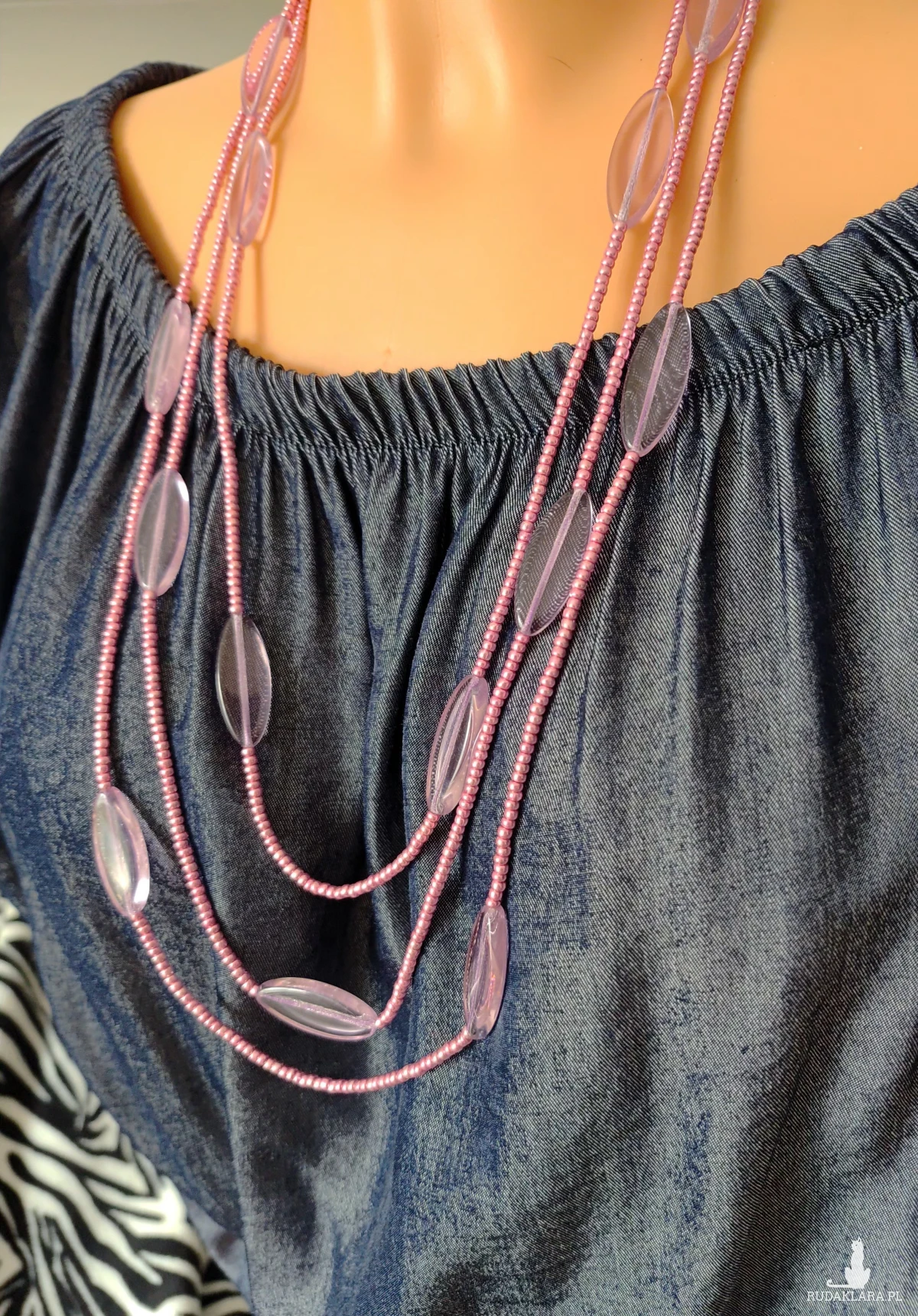 Korale z różowych oliwek płaskich dużych 3x1,2 cm, na sznur syntetyczny jubilerski nawleczone drobne koraliki czeskie Preciosa Jablonex metalizowane. Sznur najdłuzszy ma 39 cm, delikatne , lekkie, polecam