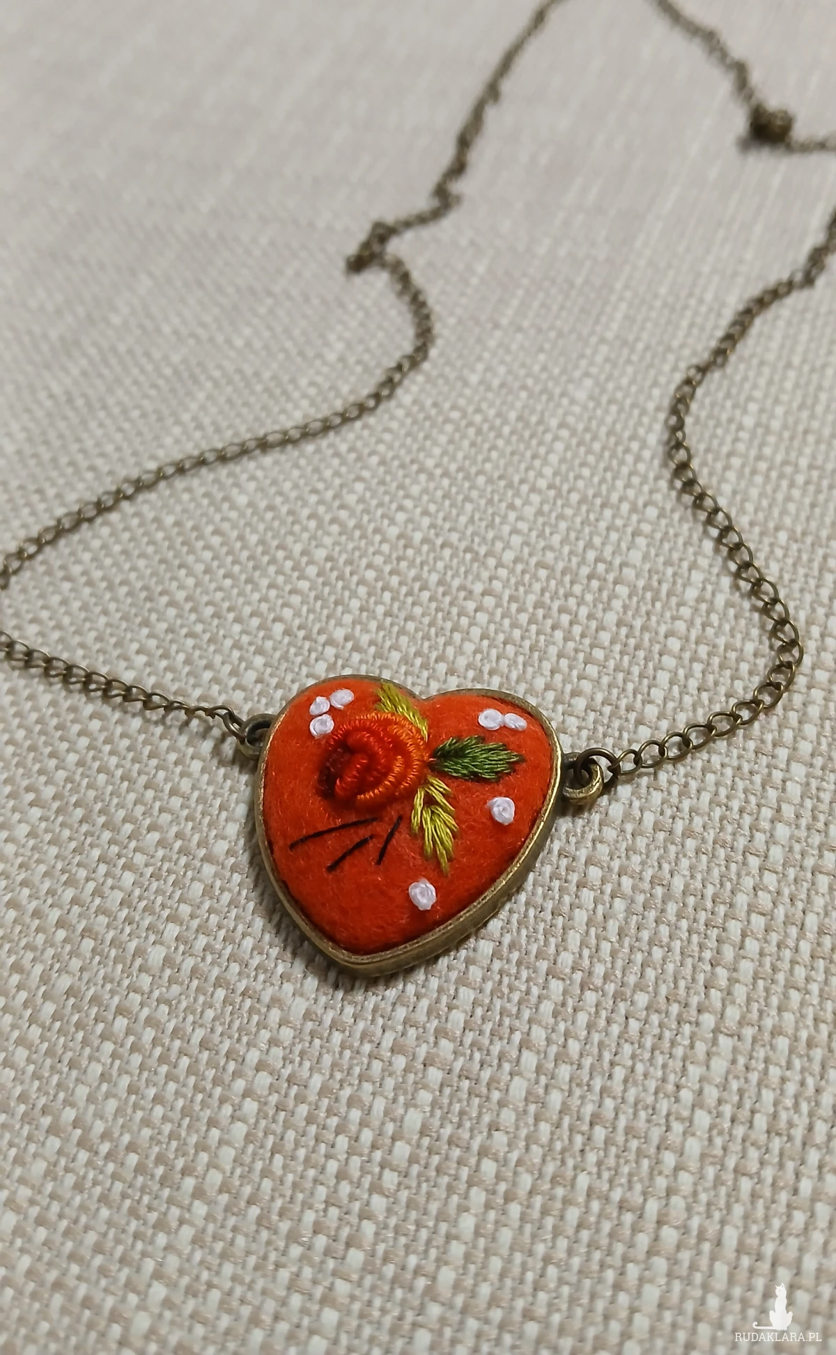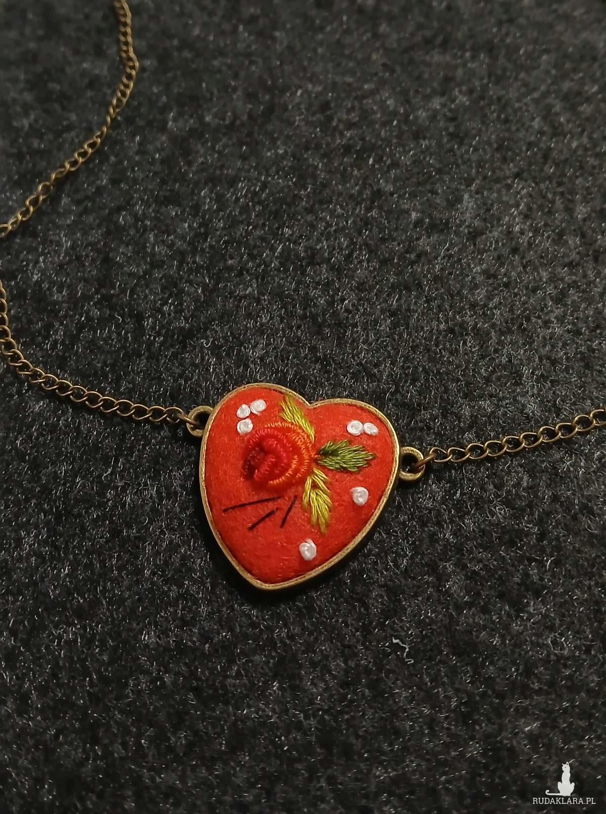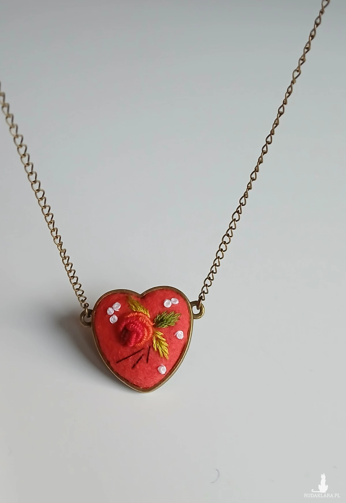 Osobliwe słodkie serduszko. Prostota i elegancja. Wyhaftowana z pasją maleńka różyczka w czerwonym serduszku to zawsze trafiony upominek od niego dla niej.