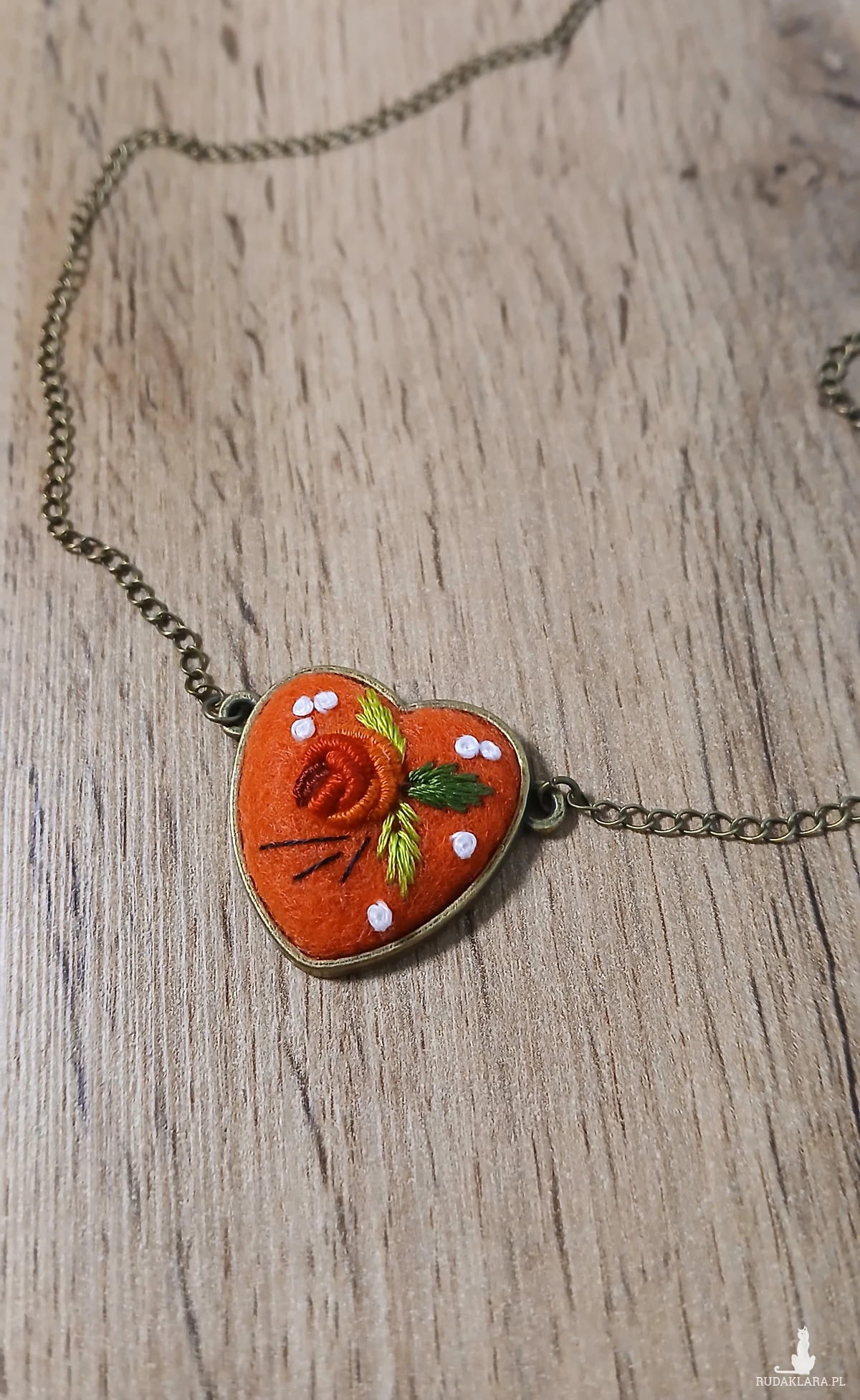 Perfekcyjnie dopracowany haft na filcu wykonałam polską bawełnianą muliną za pomocą igły. Jest on zabezpieczony impregnatem do tkanin ale po dłuższym użytkowaniu można go odświeżyć przy pomocy delikatnego mydła i letniej wody.