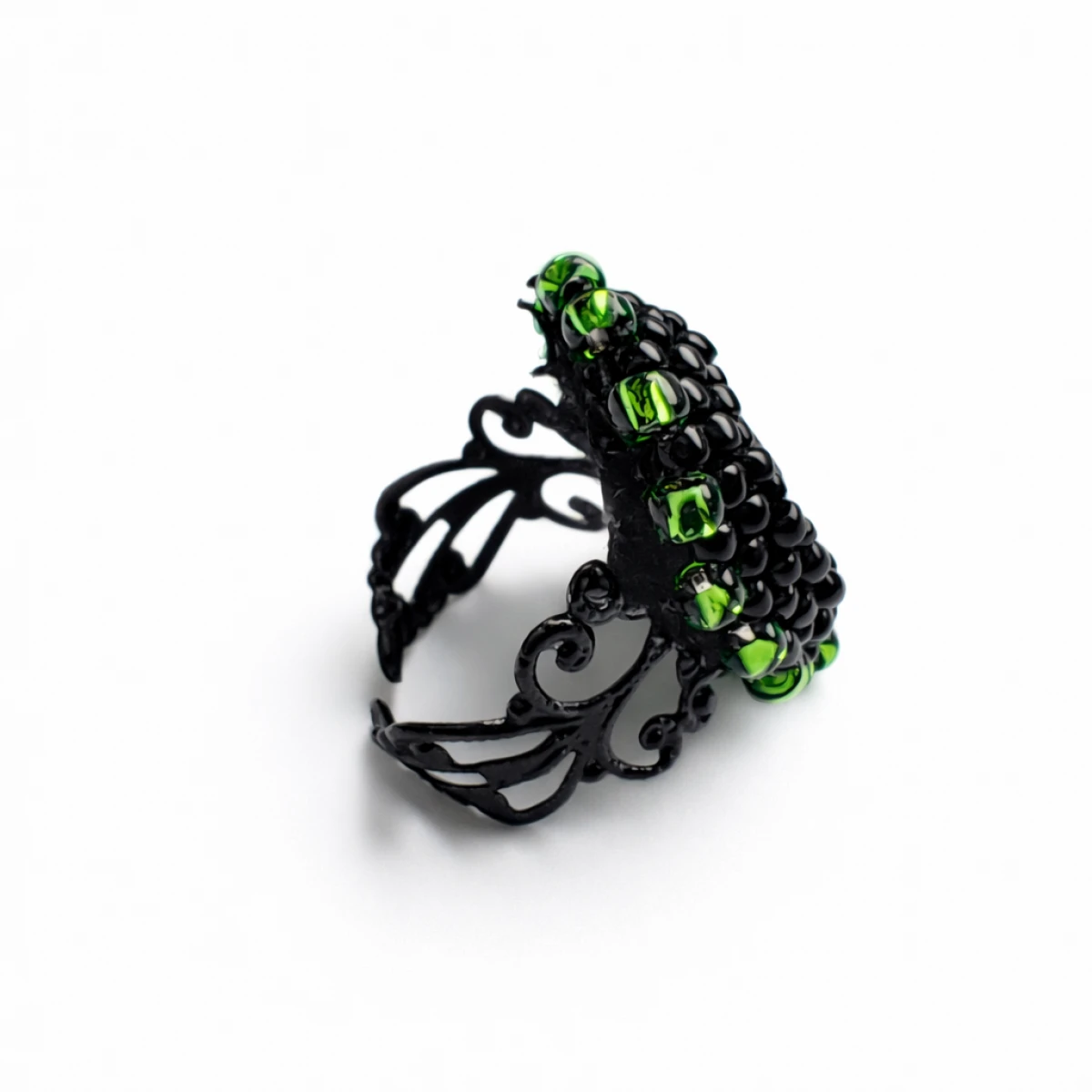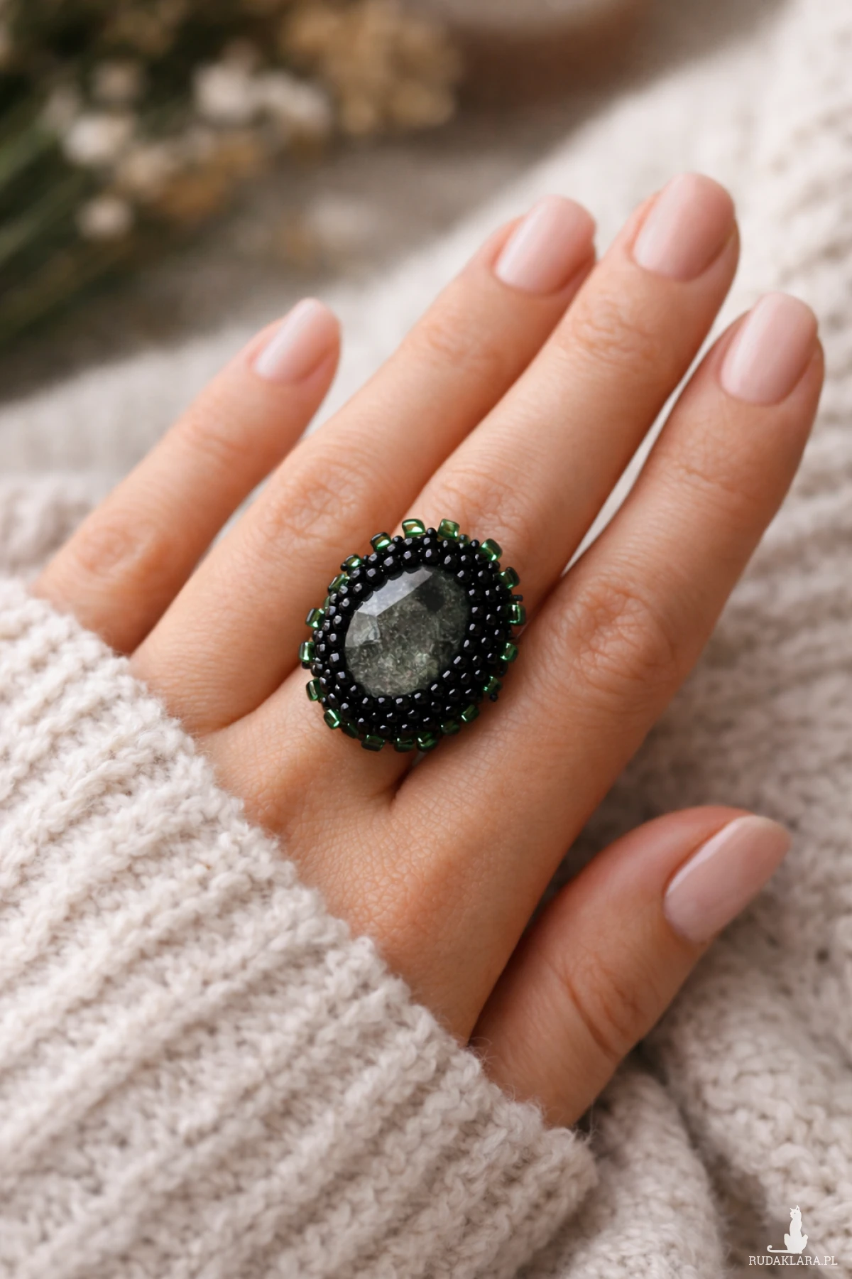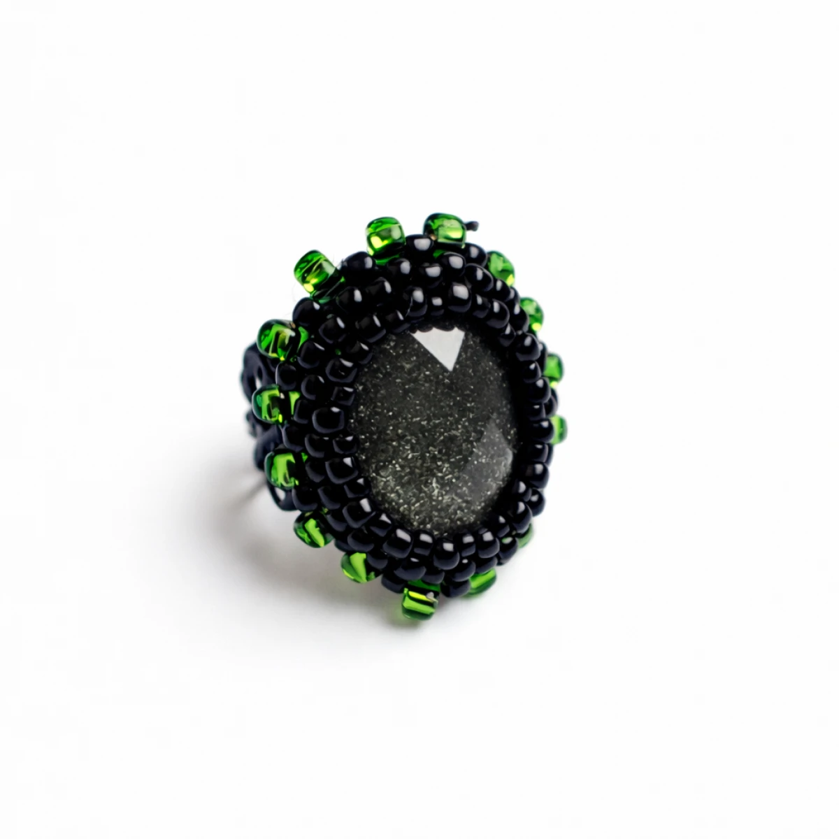 Wyjątkowy pierścionek handmade wykonany techniką haftu koralikowego. Centralnym punktem jest owalny, fasetowany kaboszon, który subtelnie odbija światło i nadaje biżuterii eleganckiego charakteru.