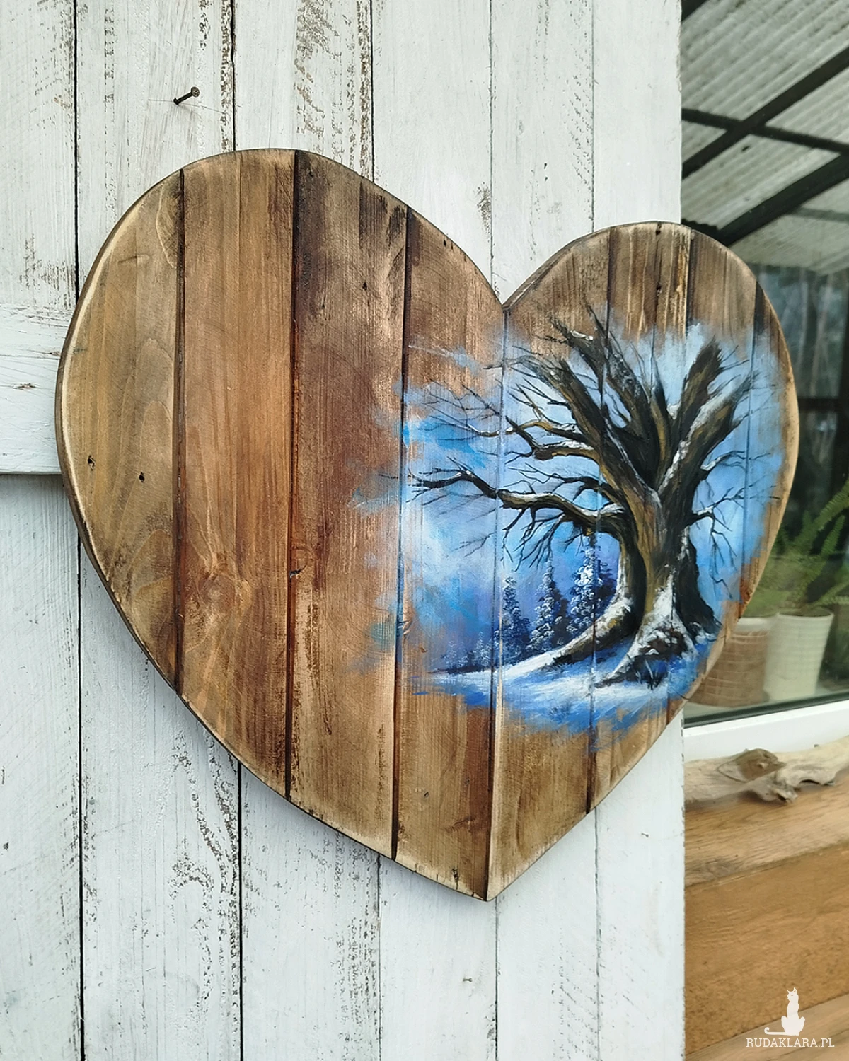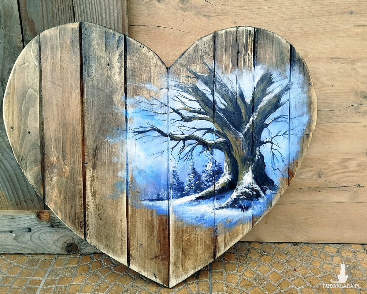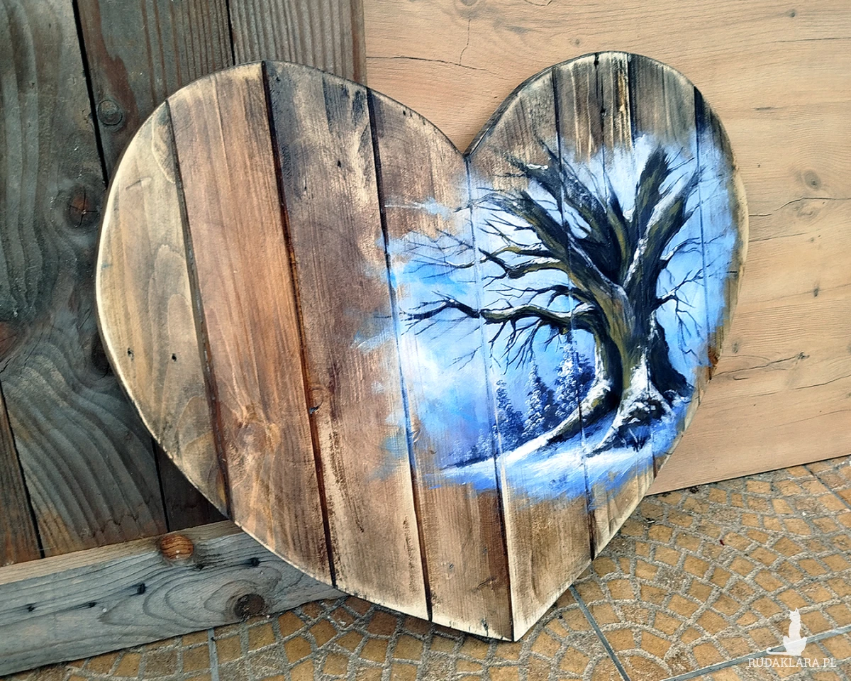 Drewniane serce - wycięte ze starych desek, z malowanym pejzażem.