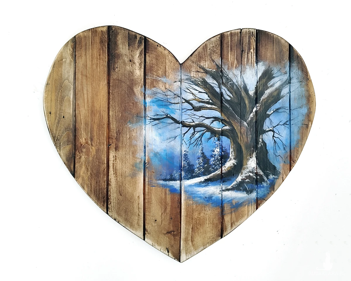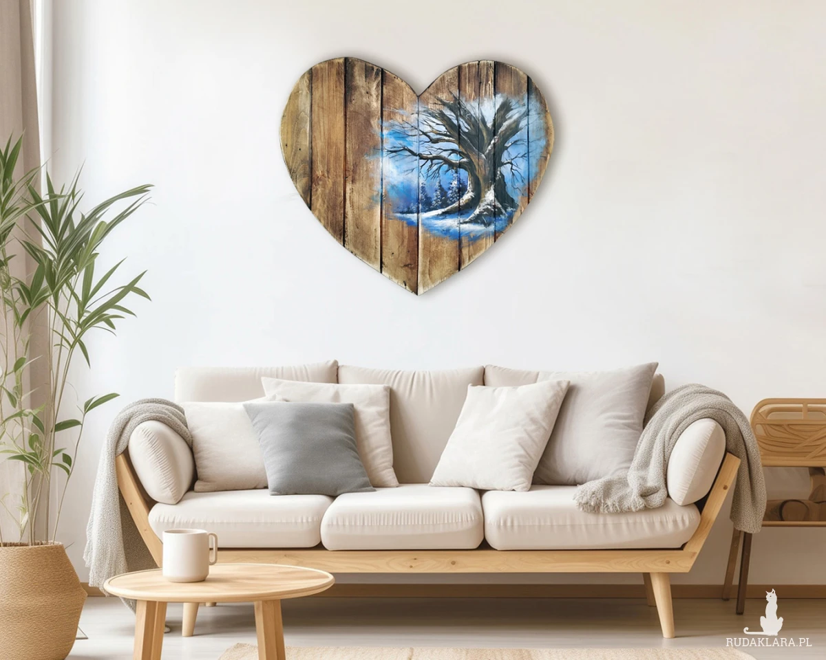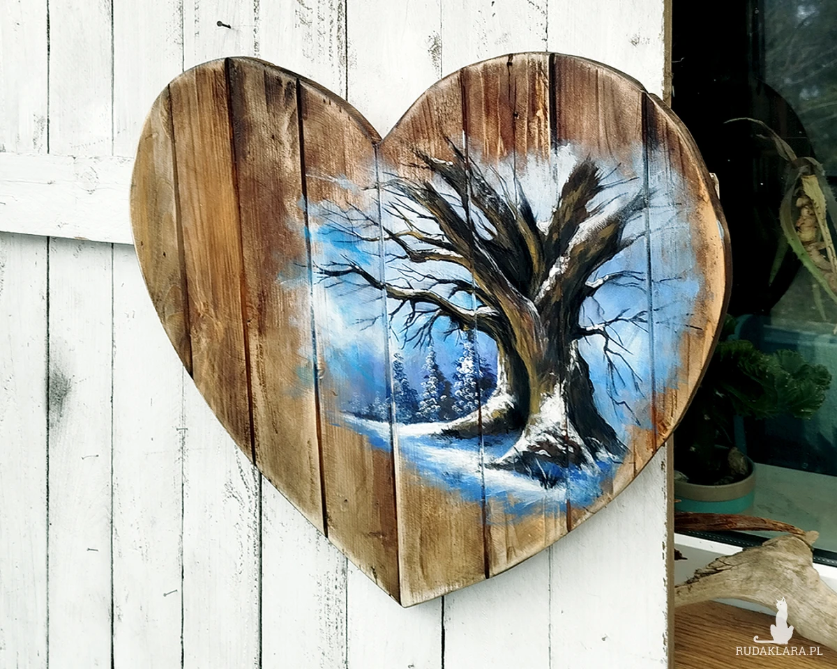 Drewniane serce - wycięte ze starych desek, z malowanym pejzażem.