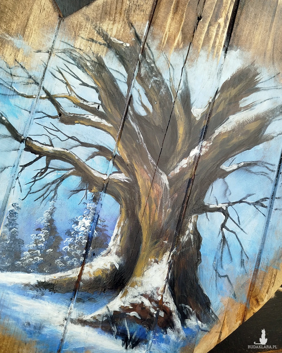 Wykonane z drewna sosnowego, lekko tylko przeszlifowane więc nadal jest szorskie w dotyku. Nie jest olejowane; miejscami przyciemnione bejcą, ale delikatnie tak żeby słoje były widoczne, zabezpieczone bezbarwnym matowym lakierem akrylowym. Drewno jest z odzysku - ma otworki, ślady po gwoździach, przetarcia i nierówną fakturę. Ta niedoskonałość tworzy klimat i autentyczność wykonanej pracy.
