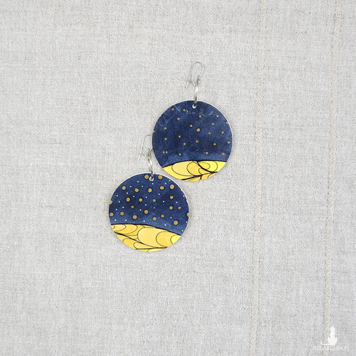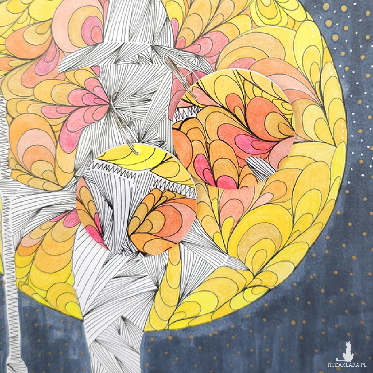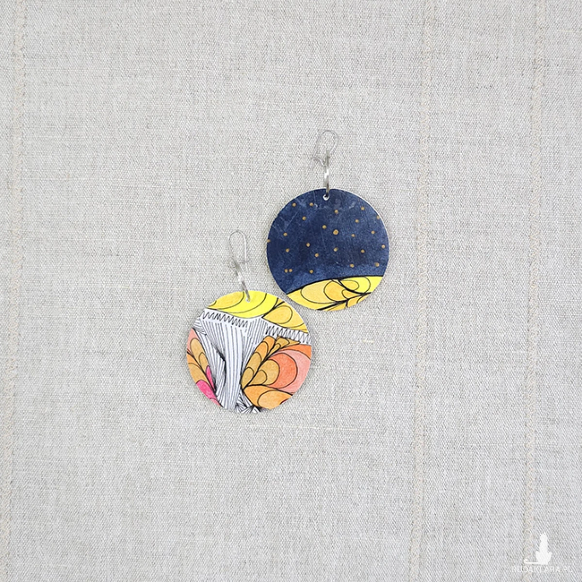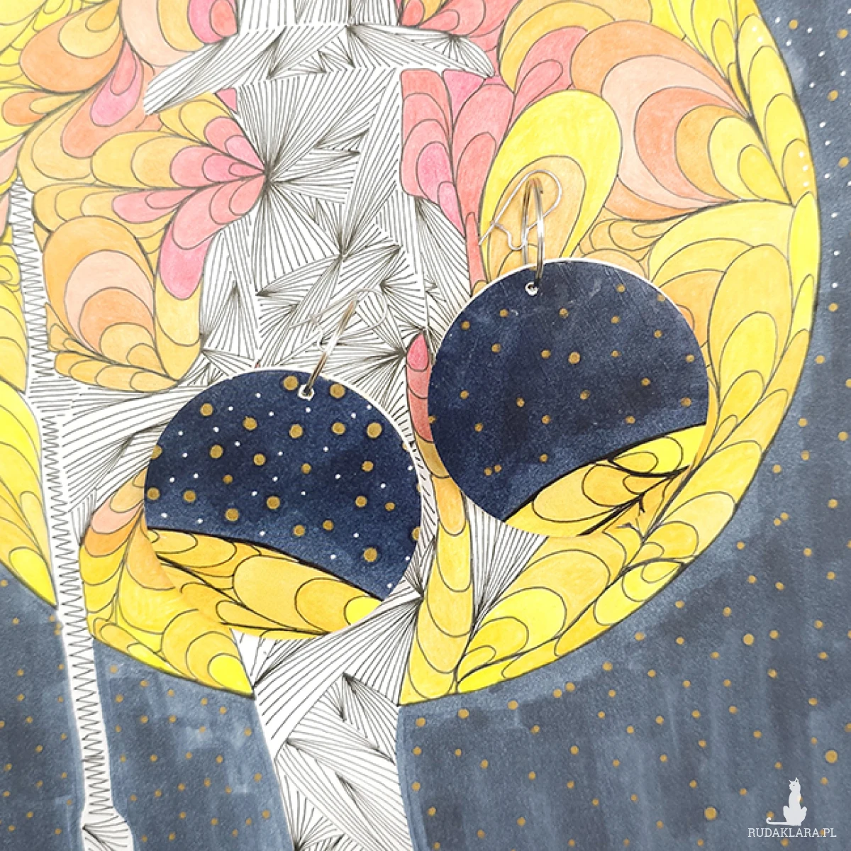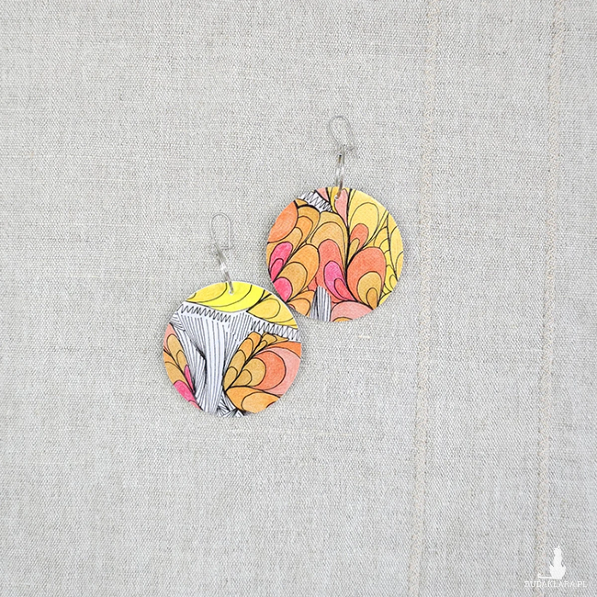 Kolczyki wykonane z drewnianej bazy oraz części mojego autorskiego rysunku "Pełnia".