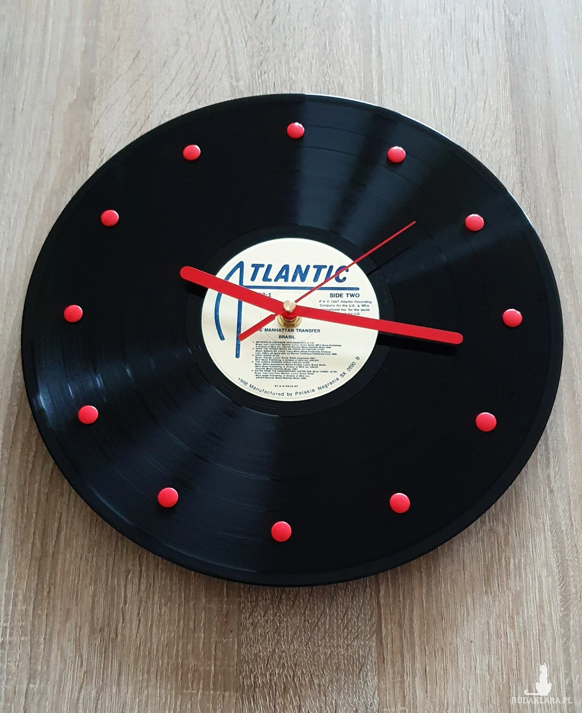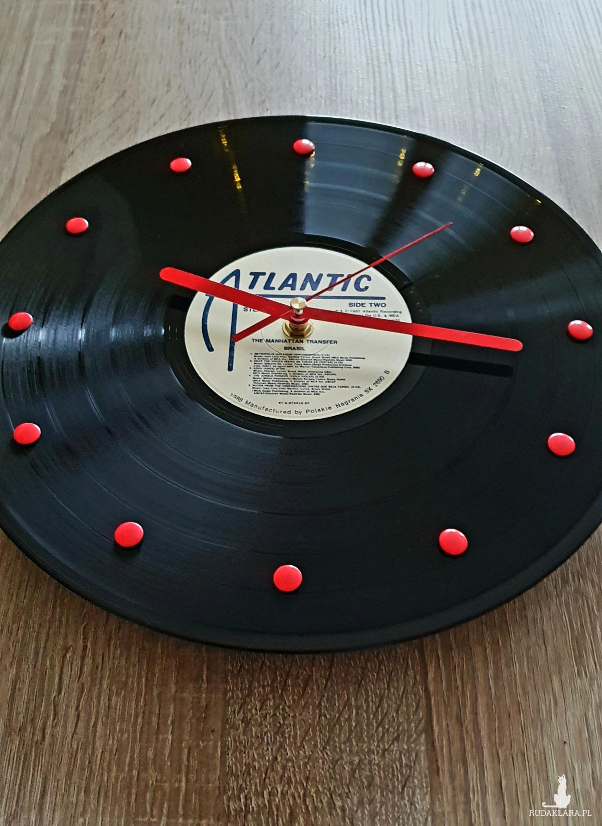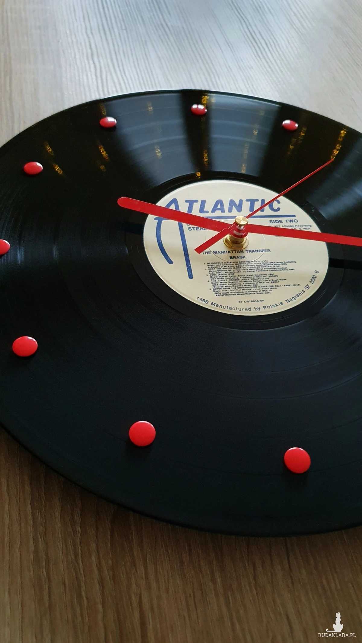 Średnica płyty winylowej wynosi 30 cm. Zegar posiada wbudowany mechanizm, który jest bardzo cichy, wręcz płynący. Zegar "nie cyka" ;-)