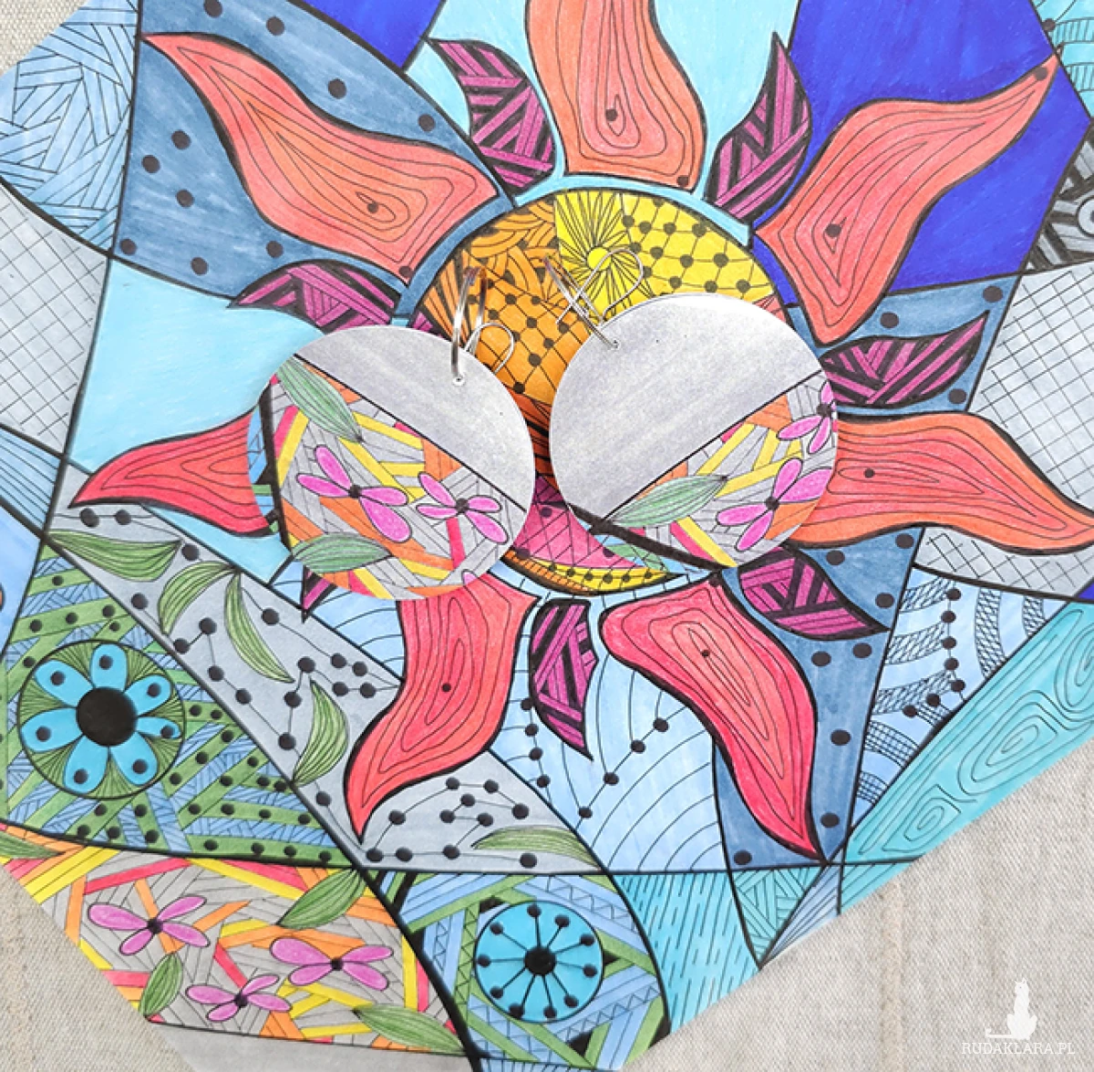 Kolczyki wykonane z drewnianej bazy oraz części mojego autorskiego rysunku "Upał".
