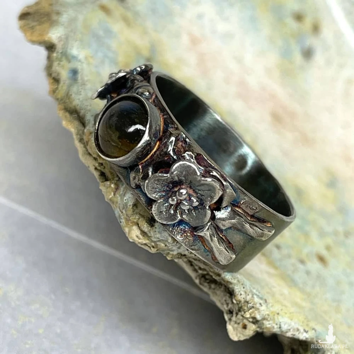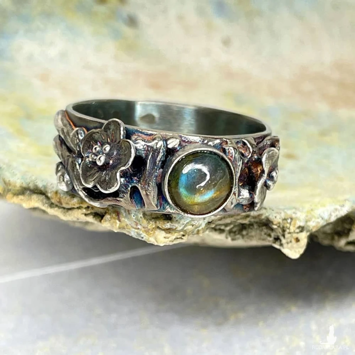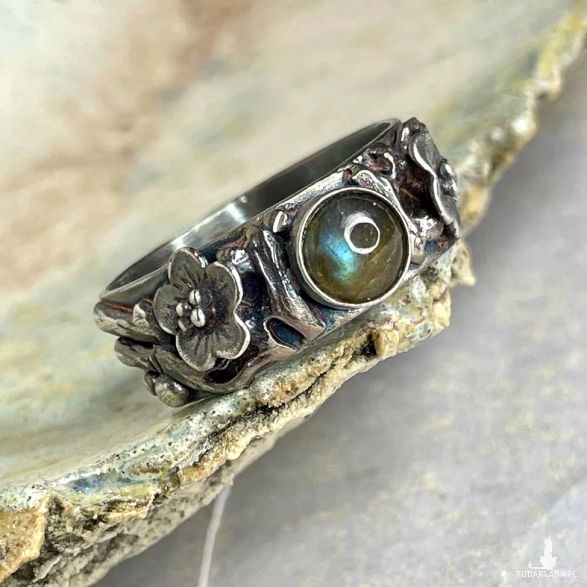 Srebrna obrączka z labradorytem to subtelna biżuteria inspirowana naturą, łącząca delikatność kwiatowych zdobień z hipnotyzującym blaskiem kamienia. Labradoryt, osadzony w ozdobnej oprawie, mieni się odcieniami błękitu i złota, przyciągając spojrzenia. Ręcznie wykonana ze srebra próby 925, czerniona i przecierana dla podkreślenia detali, stanowi wyjątkowy dodatek zarówno na co dzień, jak i na specjalne okazje.