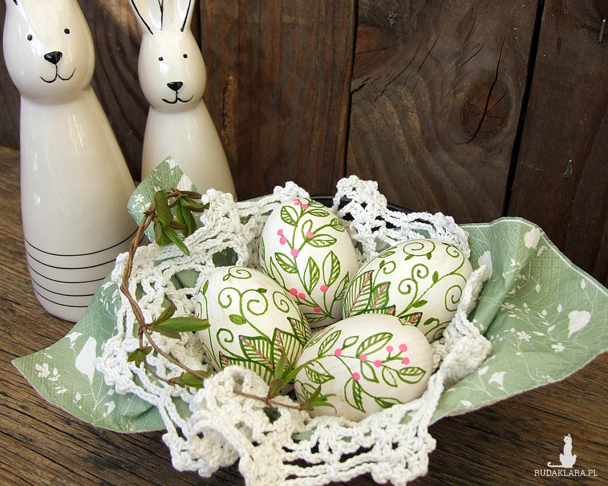 Pisanki są malowane farbami akrylowymi, kontury wykonane są pisakiem permamentnym. Całość zabezpieczona jest lakierem akrylowym - to jest nietoksyczny, bezzapachowy i matowy lakier. Jeśli pisanki się zabrudzą, wystarczy przetrzeć je wilgotną ściereczką - farba, którymi są pomalowane jest wodoodporna.