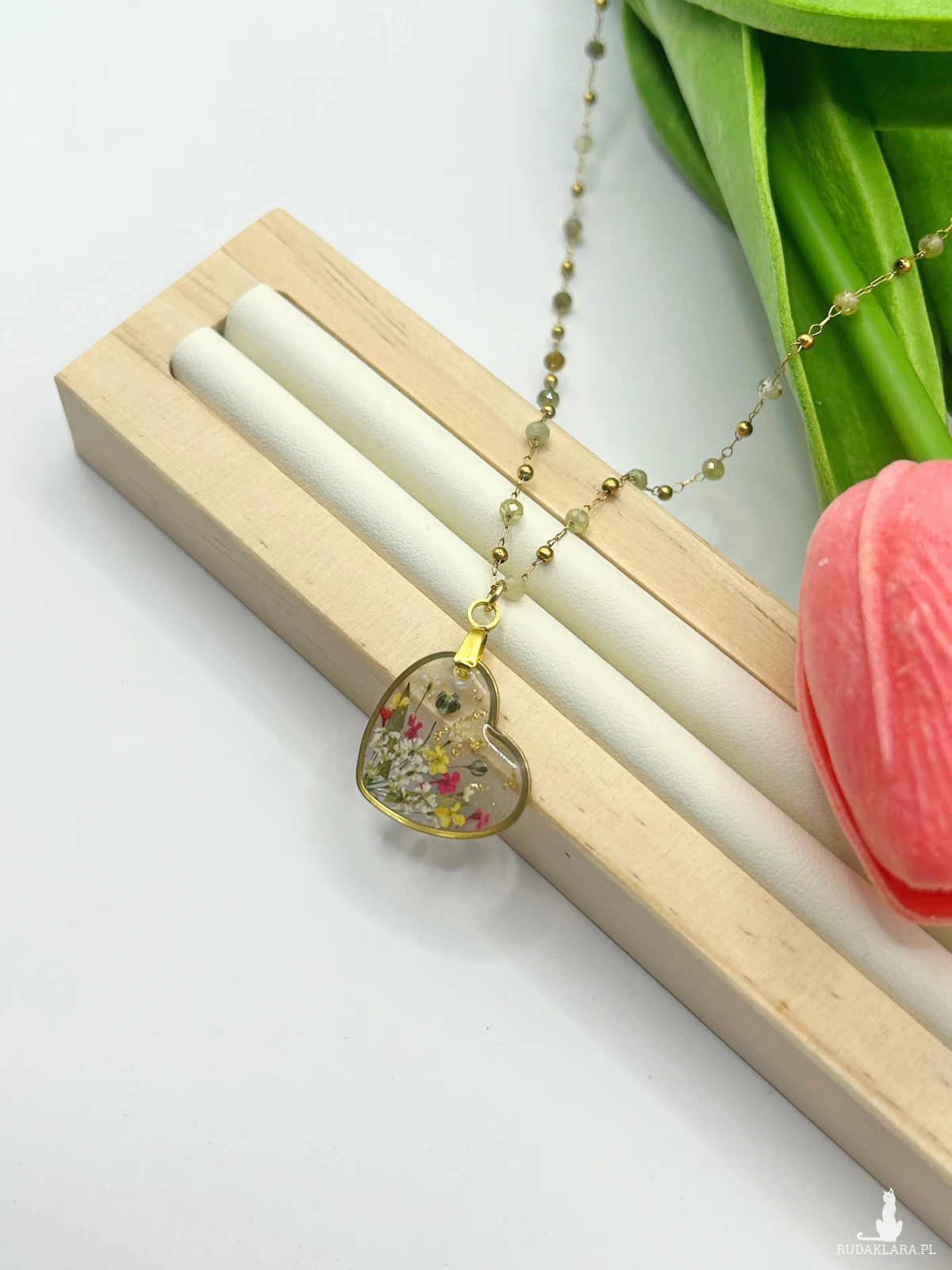 ✨ Ręcznie robiony naszyjnik z prawdziwymi kwiatami dzikiej marchwi i delikatnymi zielonymi listkami, zatopionymi w lśniącej żywicy. Całość oprawiona w złote serduszko zawieszonym na łańcuszku z zielonym turmalinem ✨