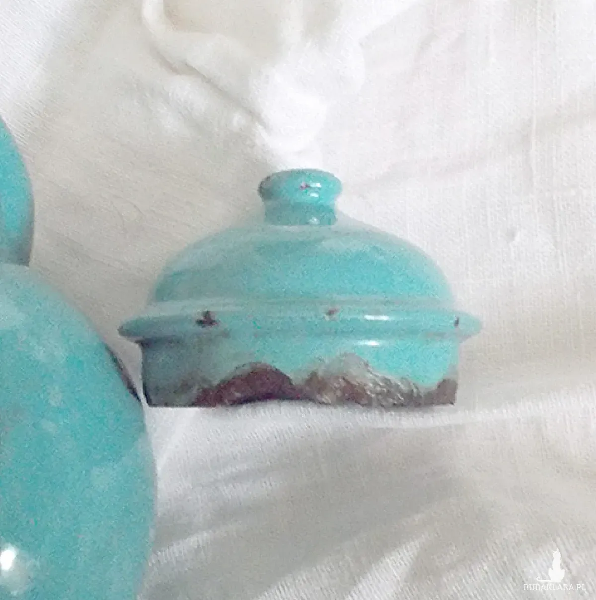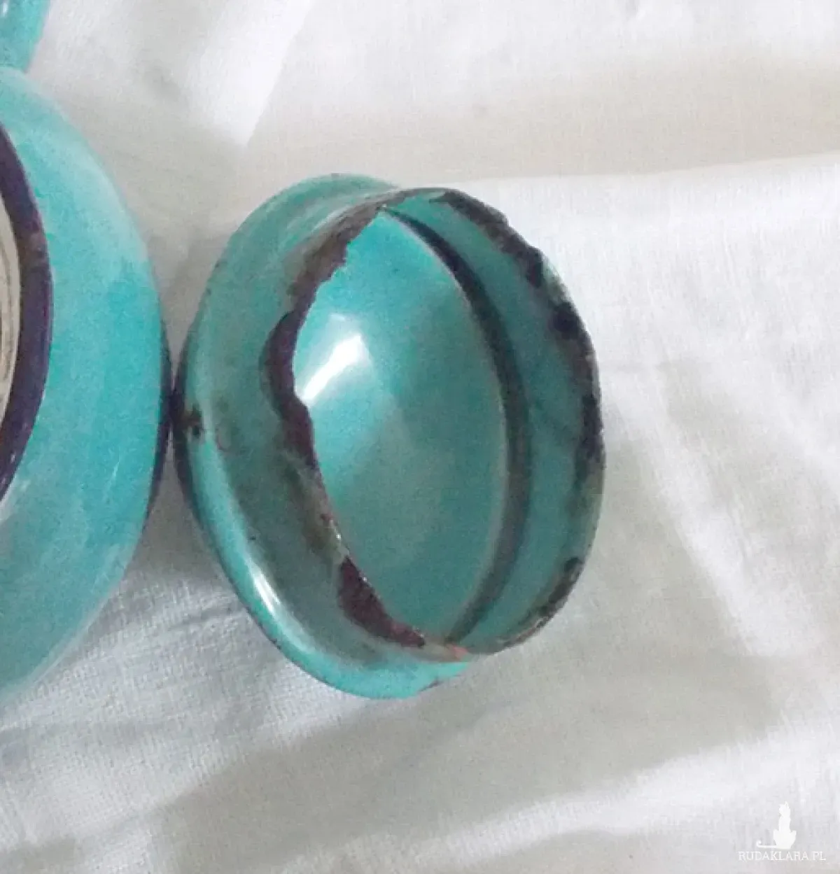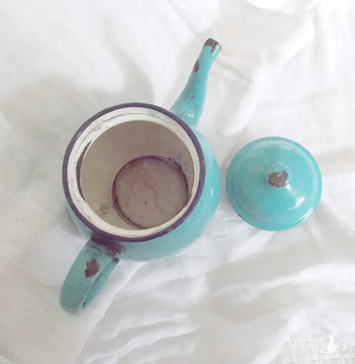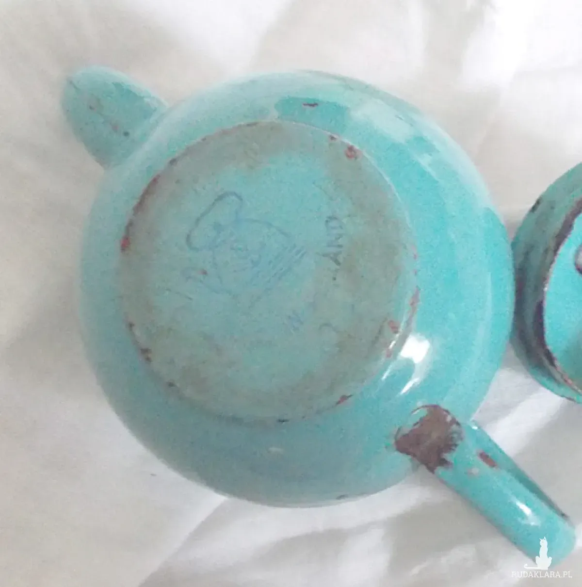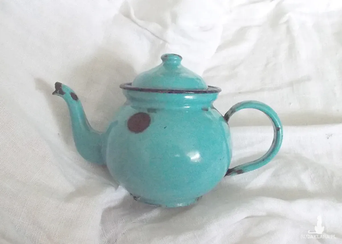 Oryginalny przedmiot vintage, z czasów PRL lata 60/70 XX w. Metalowy dzbanuszek w kolorze turkusowym. Posiada ślady użytkowania i upływu czasu (lekka rdza i ubytki ). Retro, mały dzbanek do dekoracji kuchni, jadalni, kawiarni, cukierni, herbaciarni, restauracji itp. Jest lekki - można go ustawić na szafce, półce, stoliczku itp.