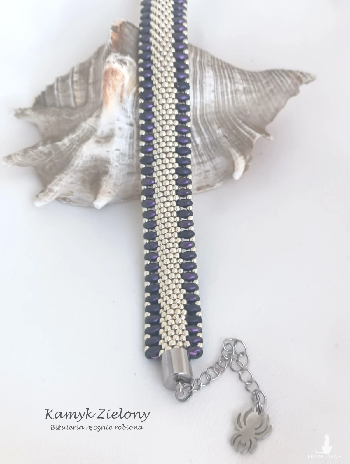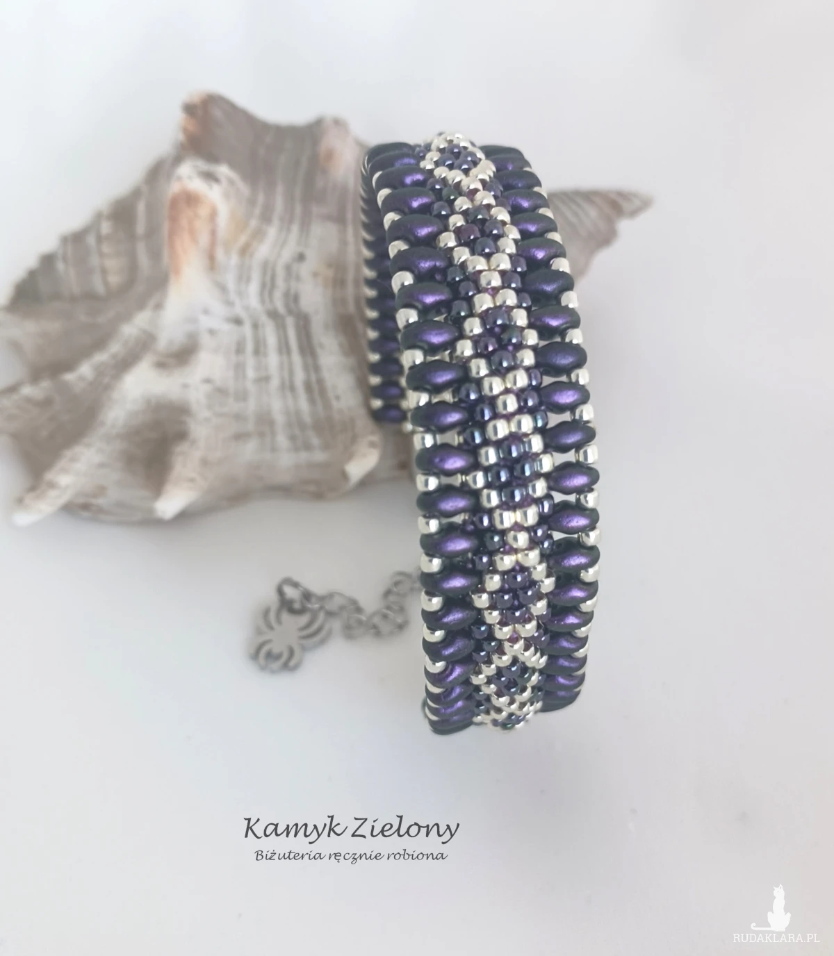 Dwustronna bransoletka o płaskim kształcie wykonana z wysokiej jakości szklanych koralików Toho w srebrnym i fioletowym kolorze oraz umieszczonych na brzegach koralików SuperDuo w kolorze ciemnego fioletu o satynowym wykończeniu.